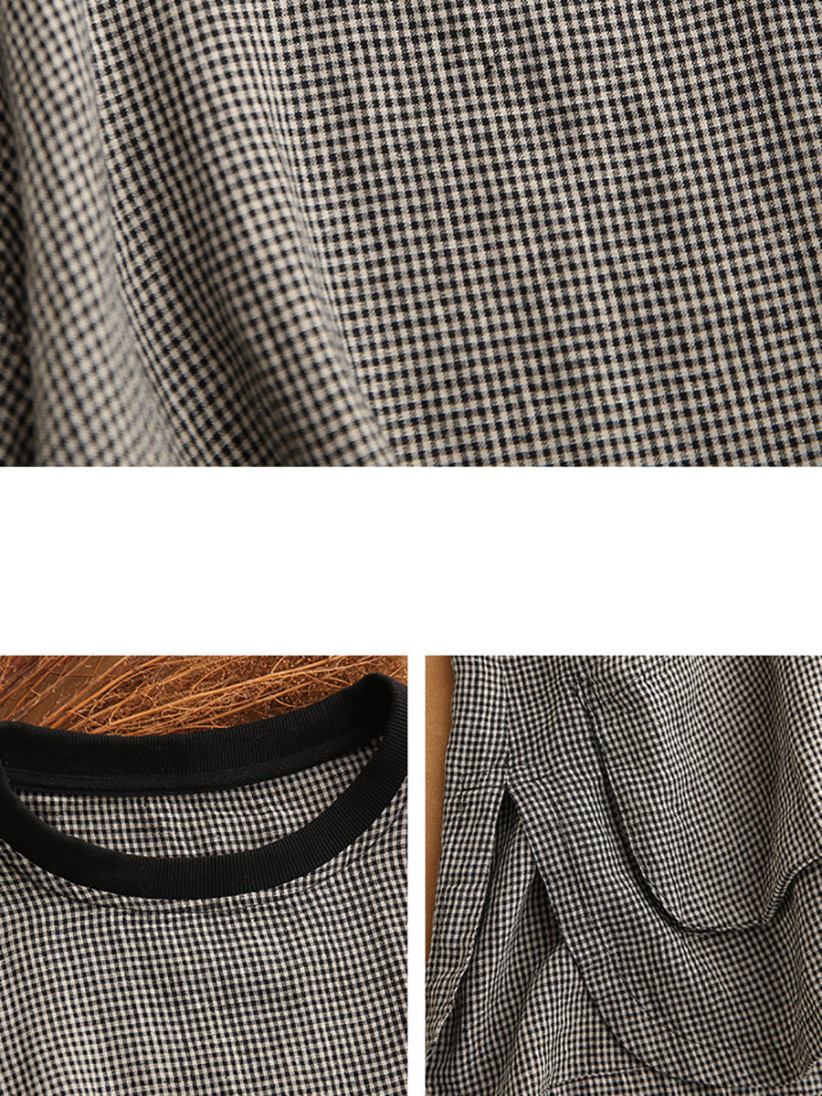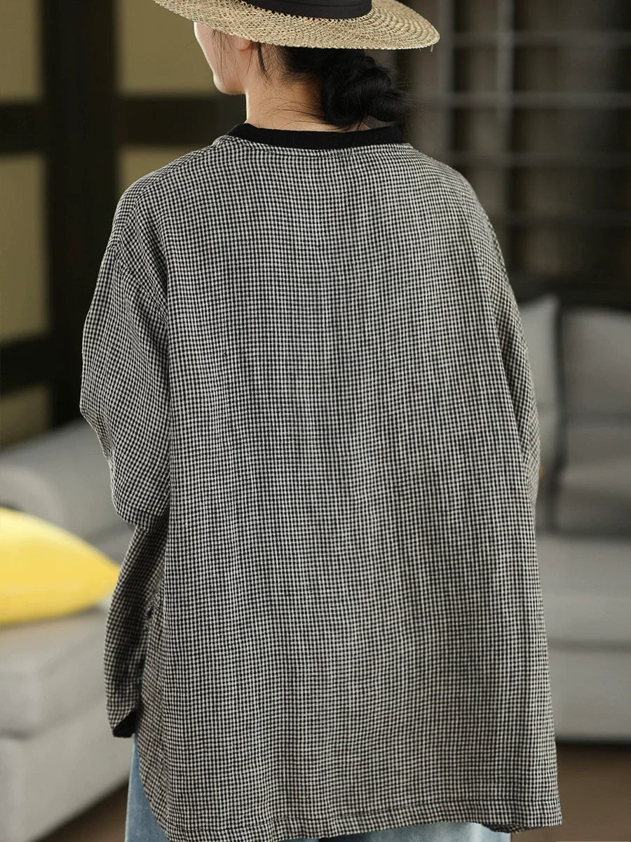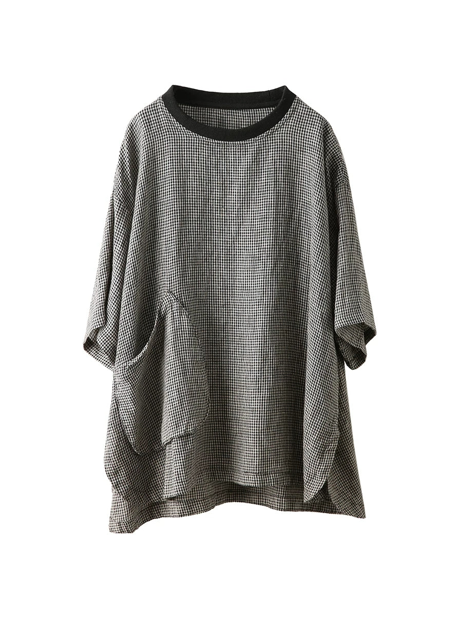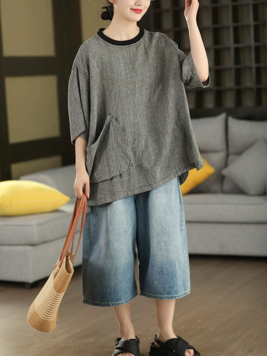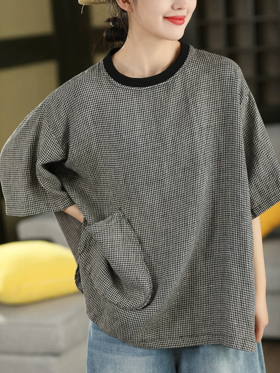Camiseta de mujer estilo retro de verano con cuello redondo y estampado a cuadros, 100% lino.