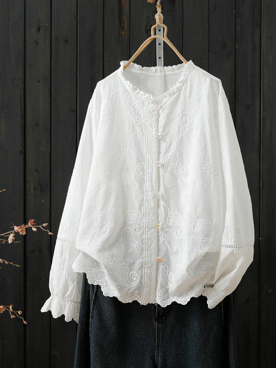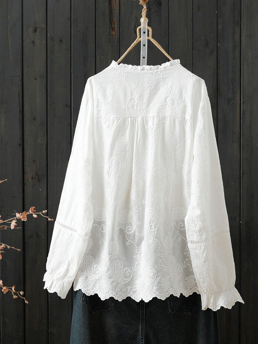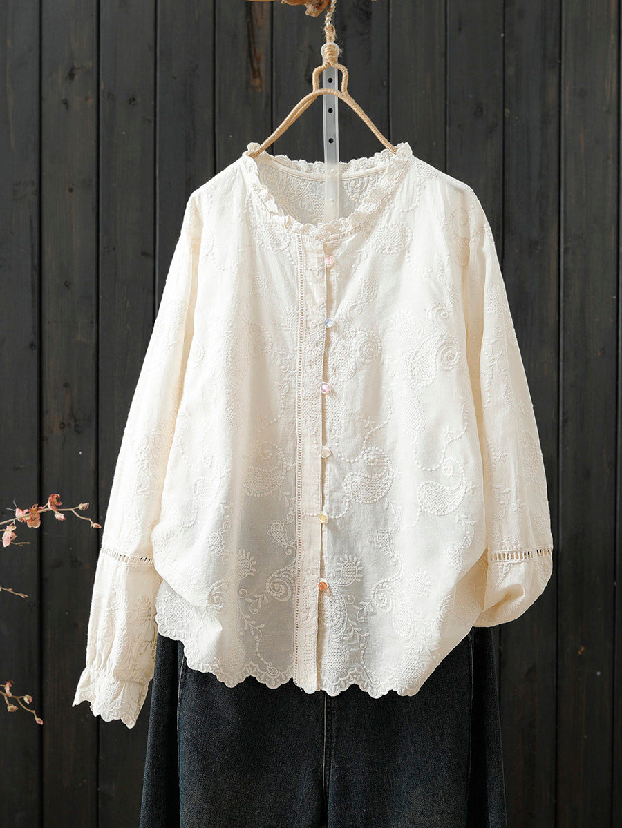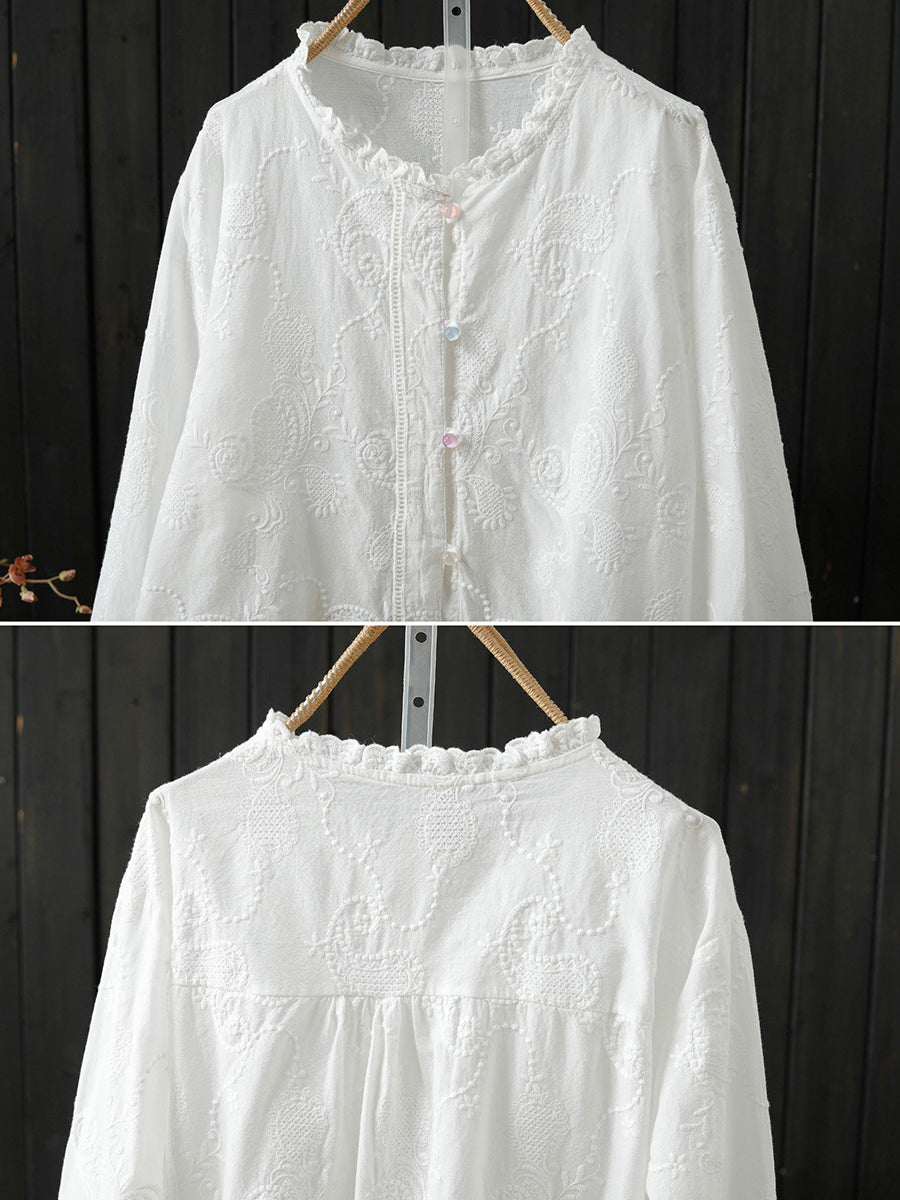Camisa de cuello alto 100 % algodón con bordado artístico de primavera para mujer