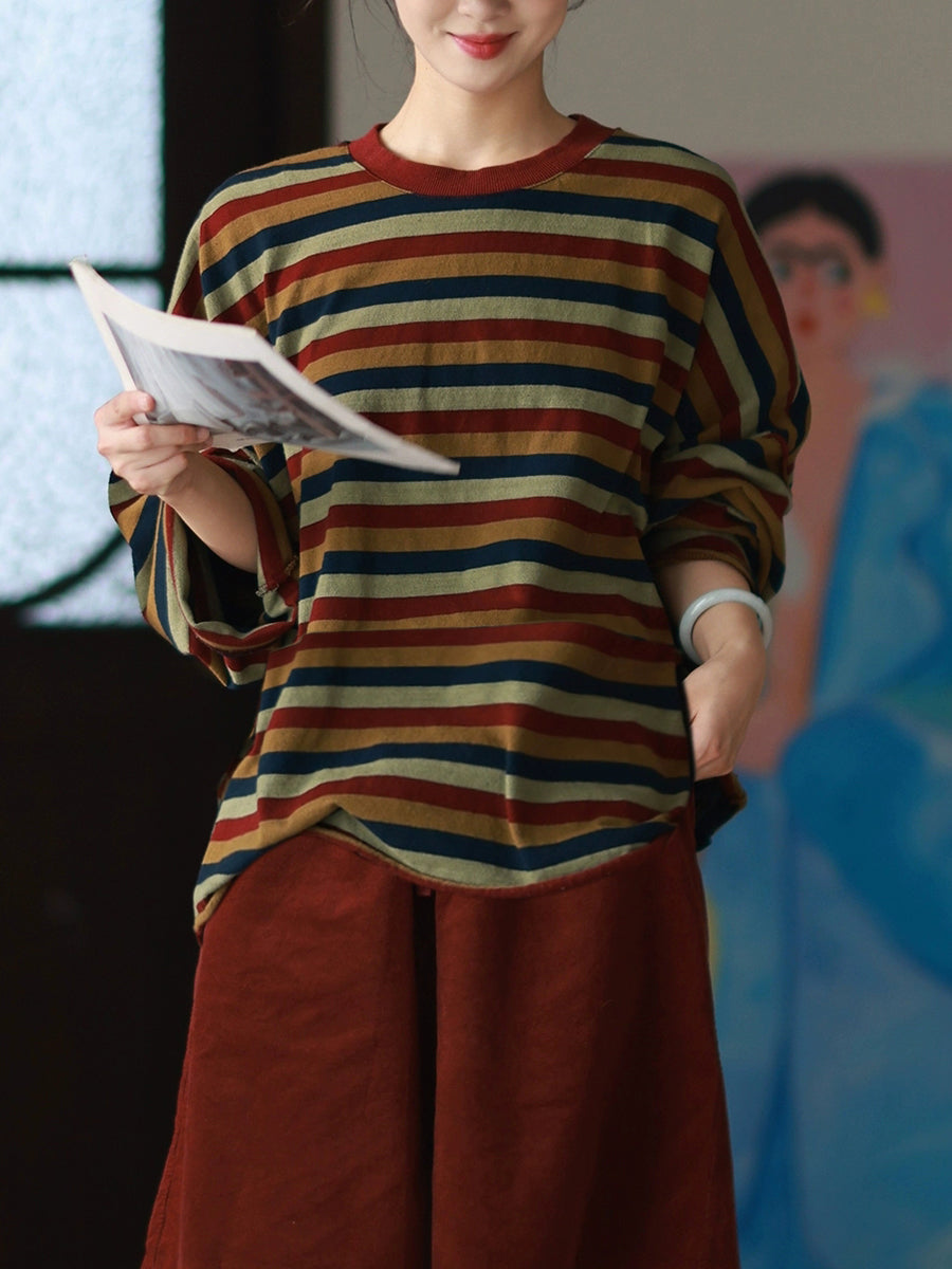 Blusa informal de otoño a rayas con cuello redondo para mujer, 100 % algodón
