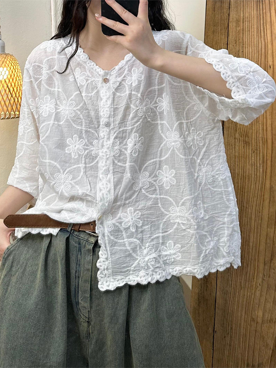 Esta camisa de inspiración vintage, adornada con un hermoso bordado de flores, tiene cuello en V y mangas largas. Su estilo de manga regular le agrega un toque artístico, lo que la hace perfecta para estaciones más cálidas como la primavera y el verano.