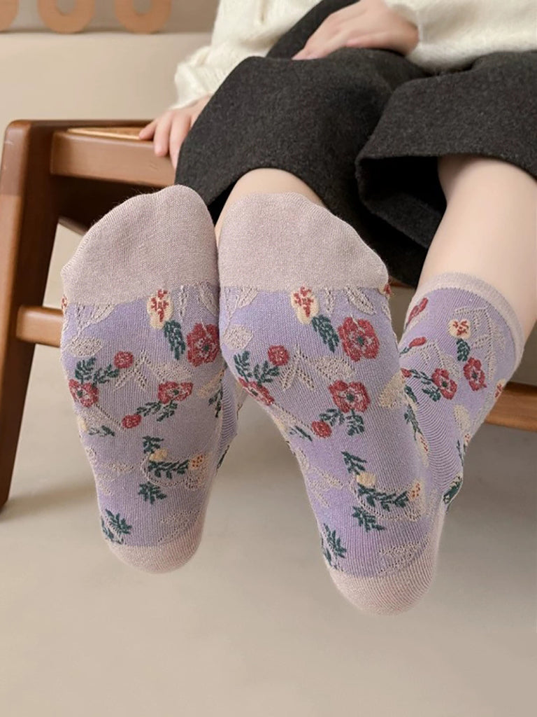 5 pares de calcetines de algodón jacquard con flores artísticas para mujer