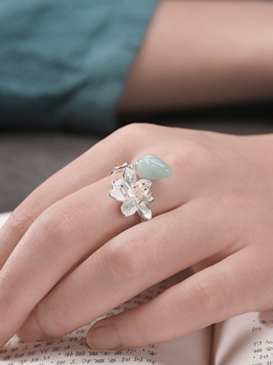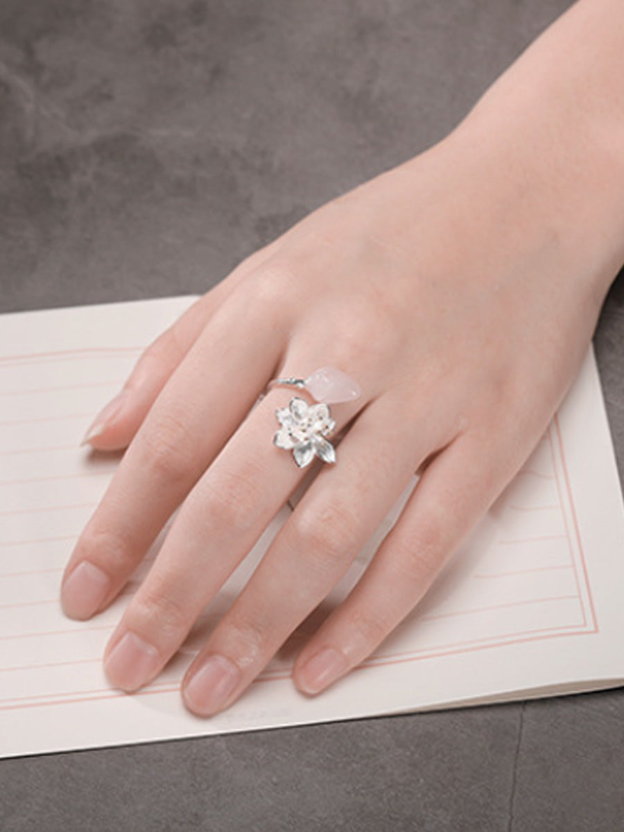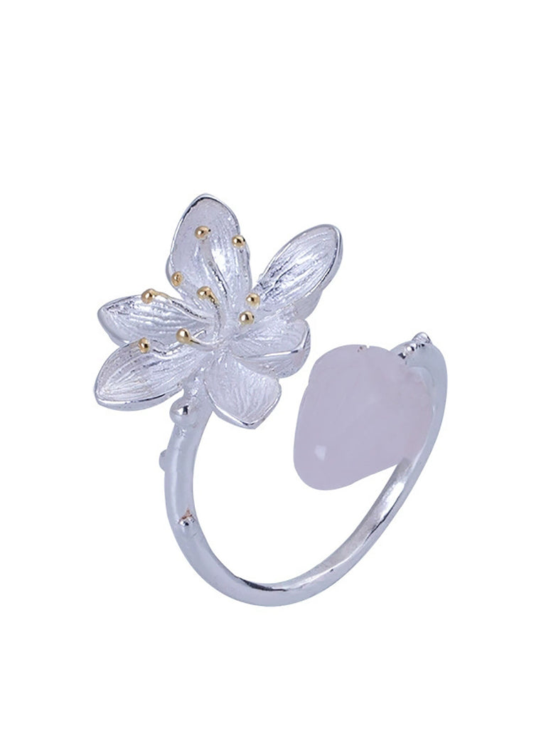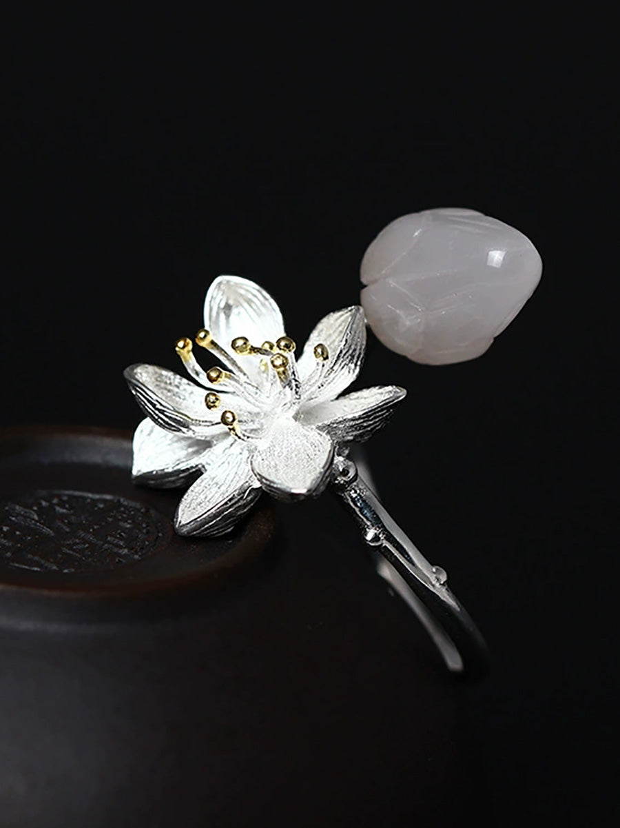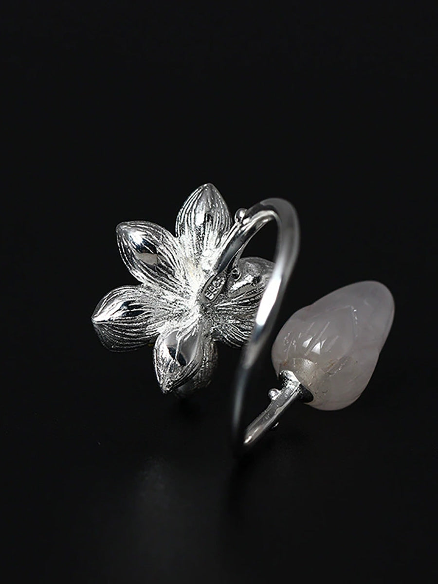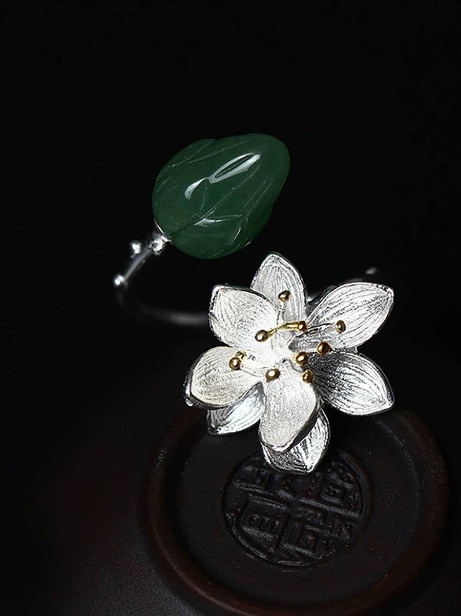 Anillo ajustable de jade de loto en plata S925 para mujer