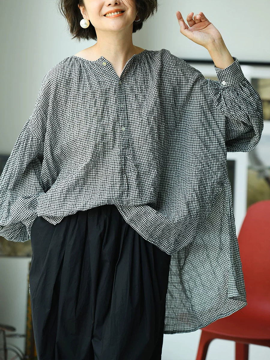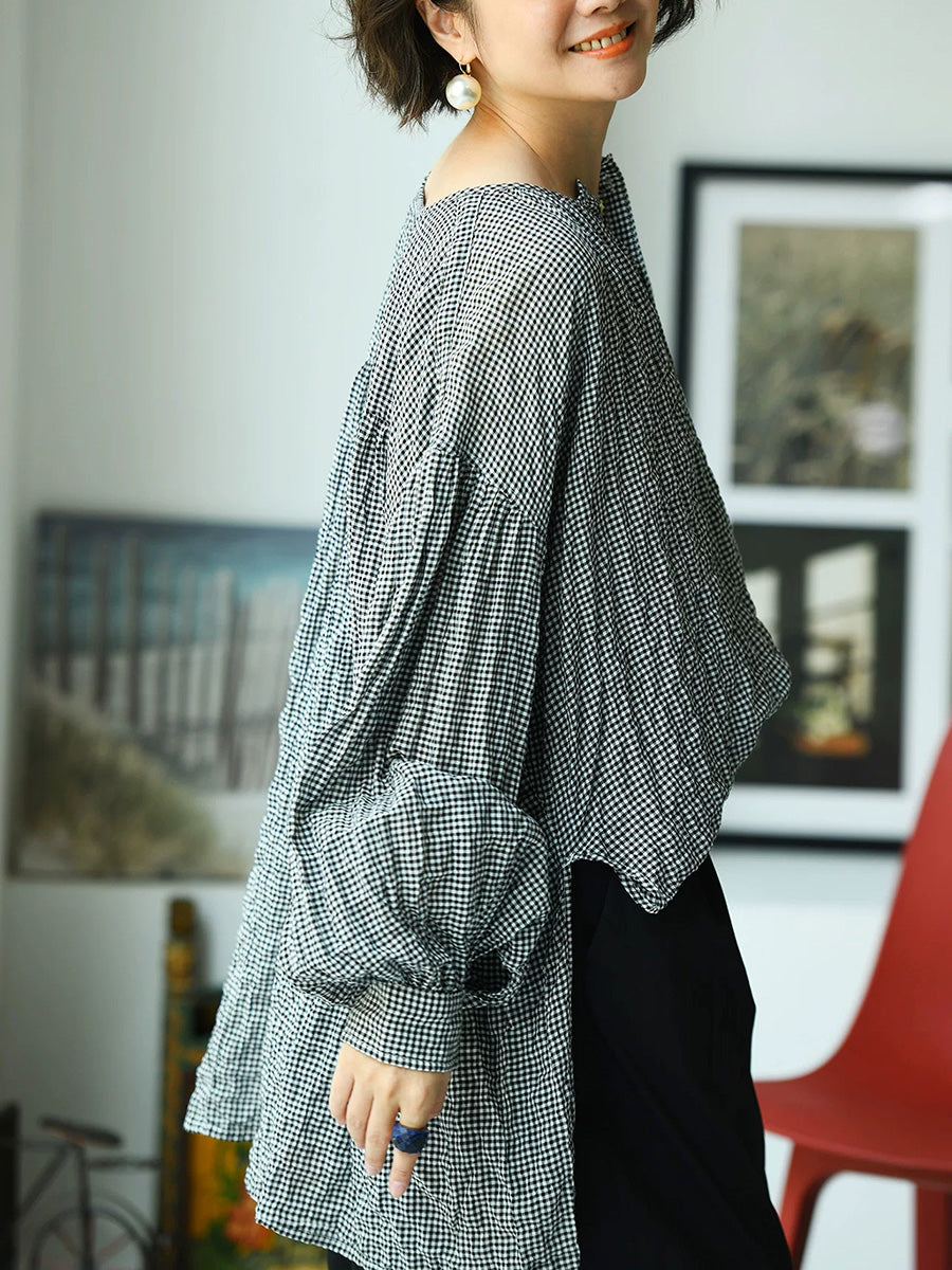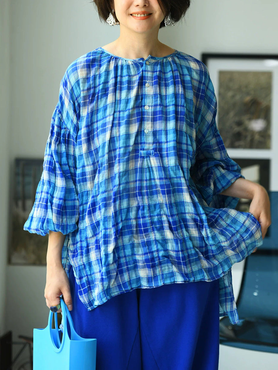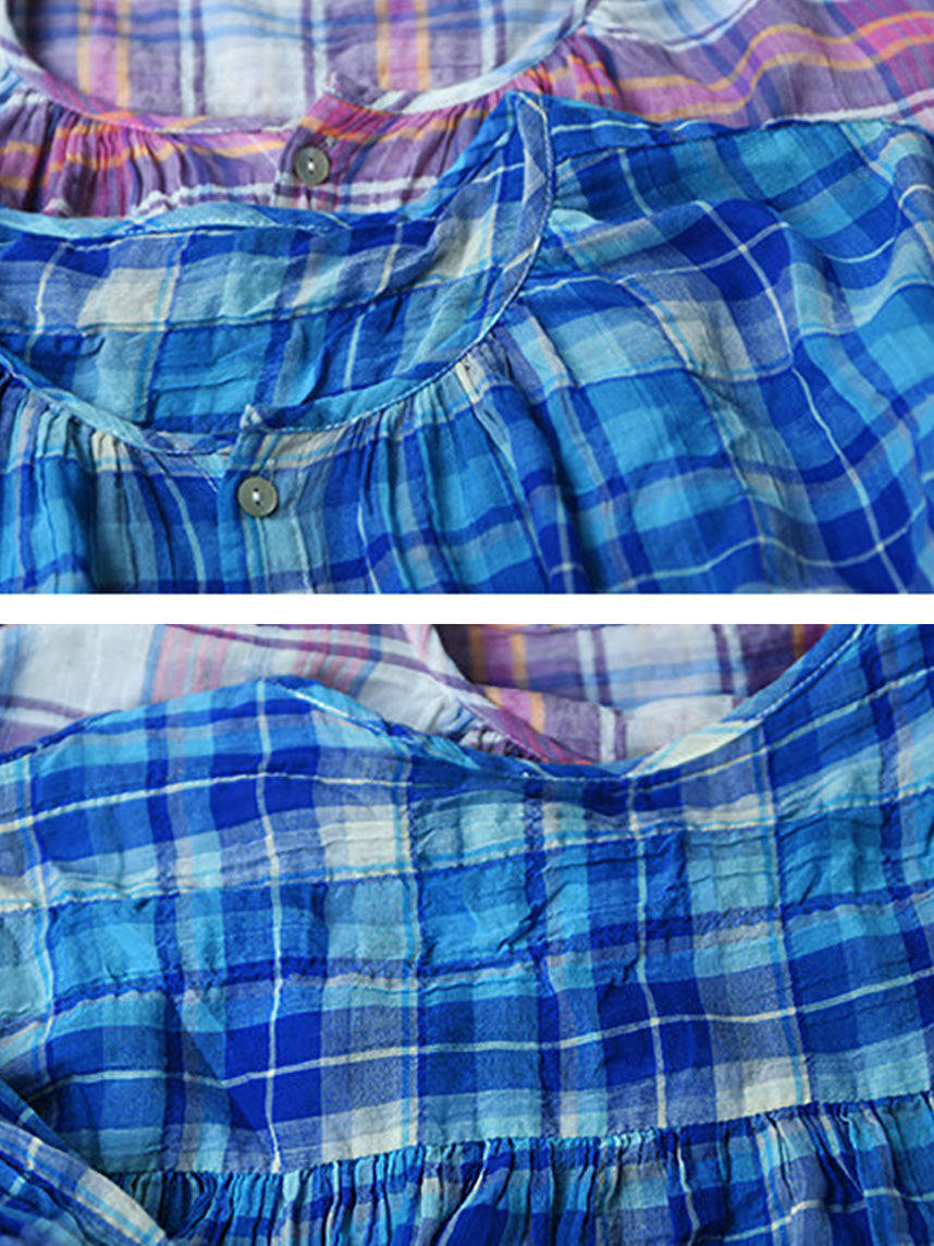 Camisa de mujer de verano estilo vintage a cuadros con cuello redondo