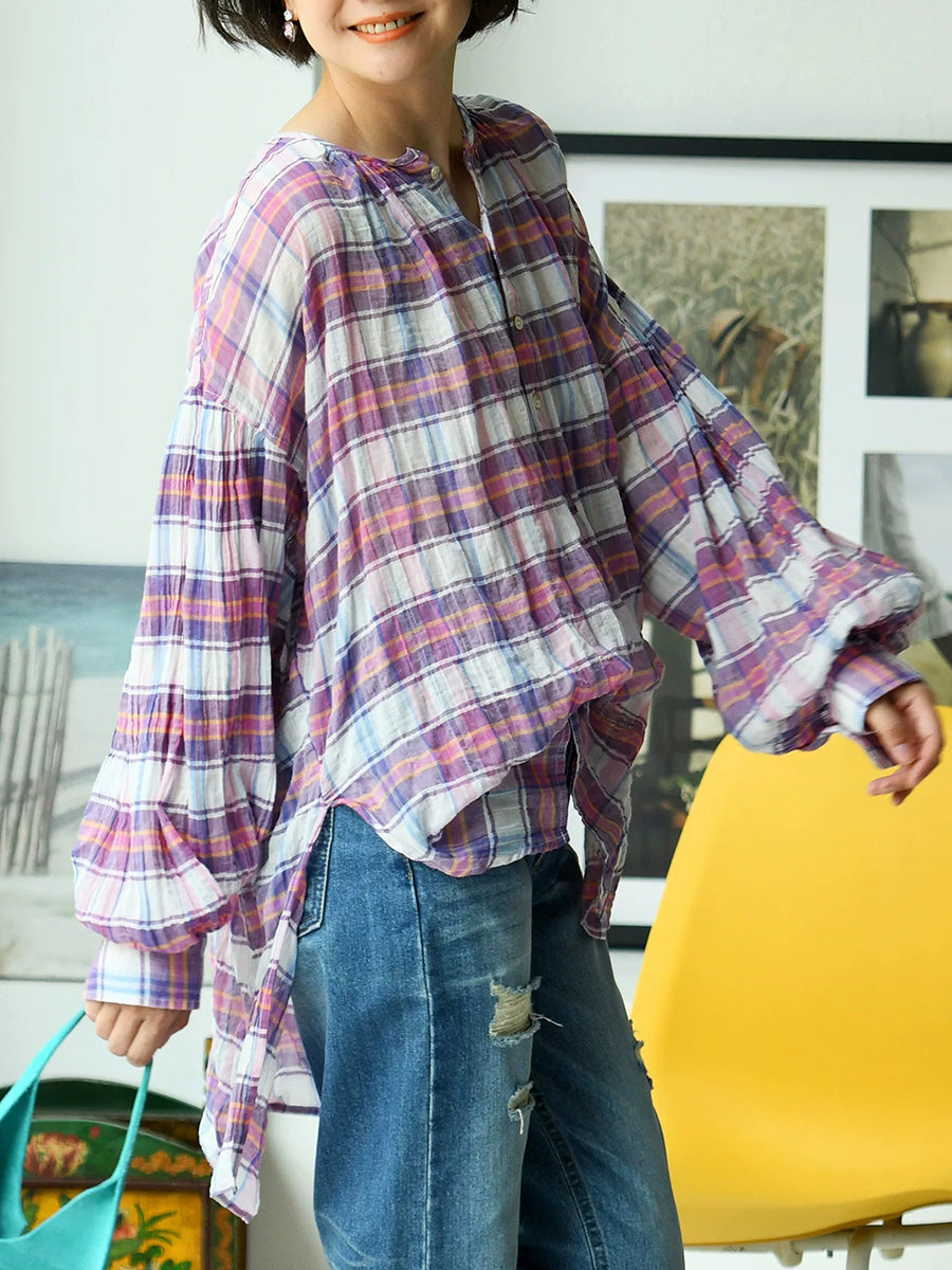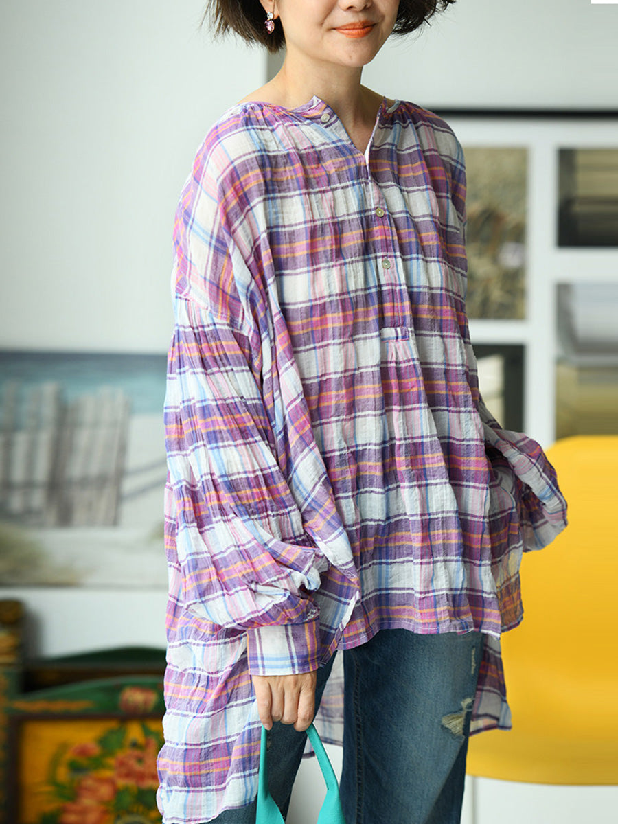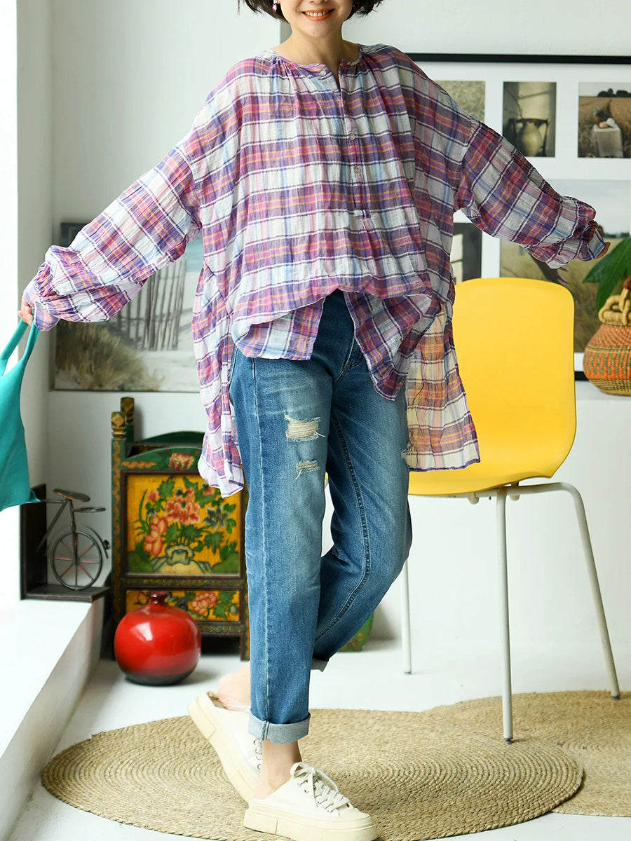 Camisa de mujer de verano estilo vintage a cuadros con cuello redondo