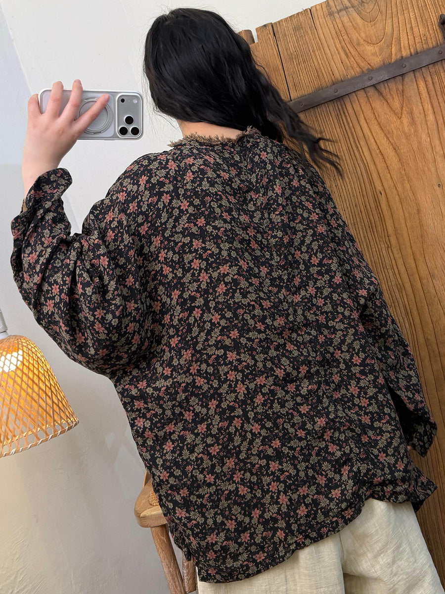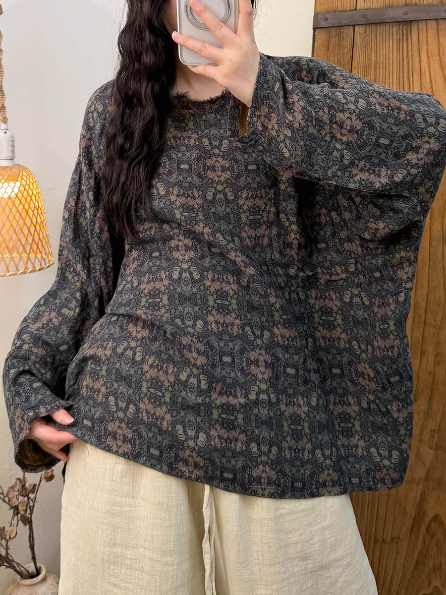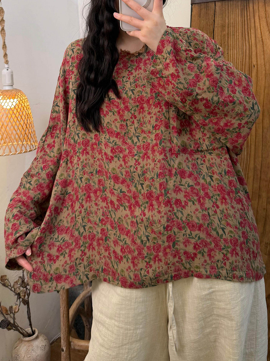 Camisa vintage de primavera con cuello redondo y flores para mujer