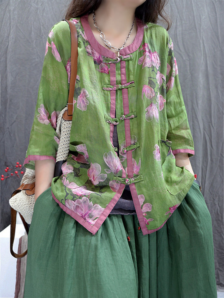Camisa de mujer de talla grande con estampado vintage de flores en color rosa y ramio para primavera