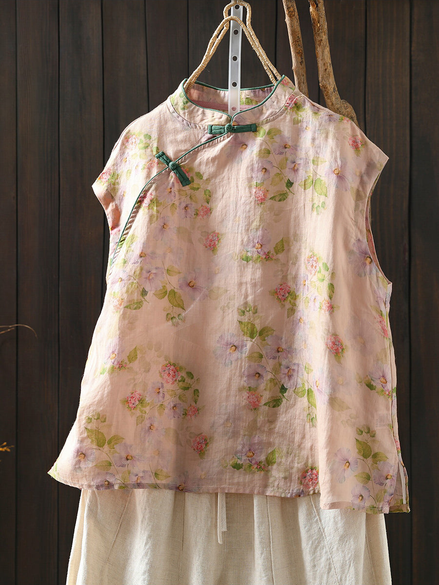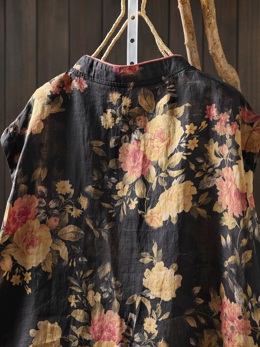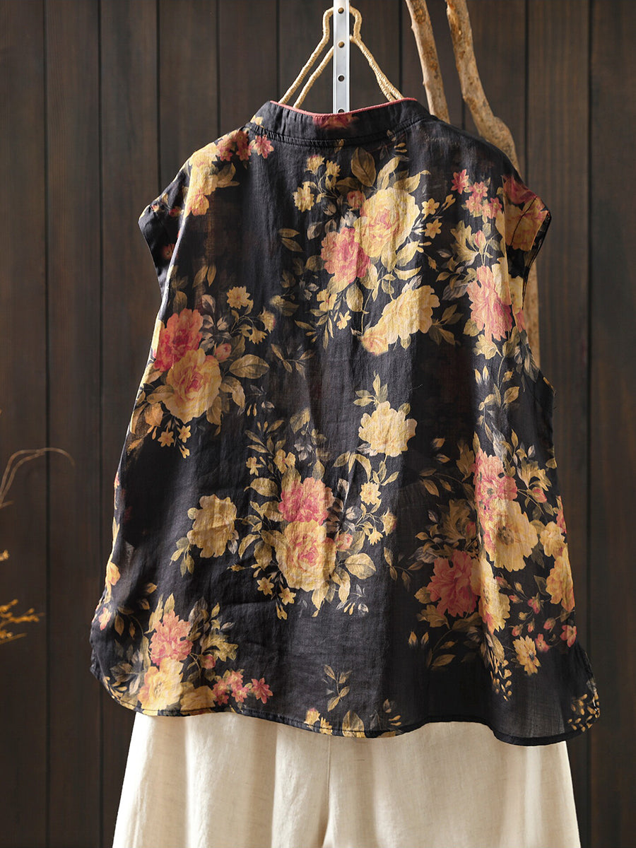 Camisa étnica de verano para mujer con cuello alto y estampado floral, 100% ramio.