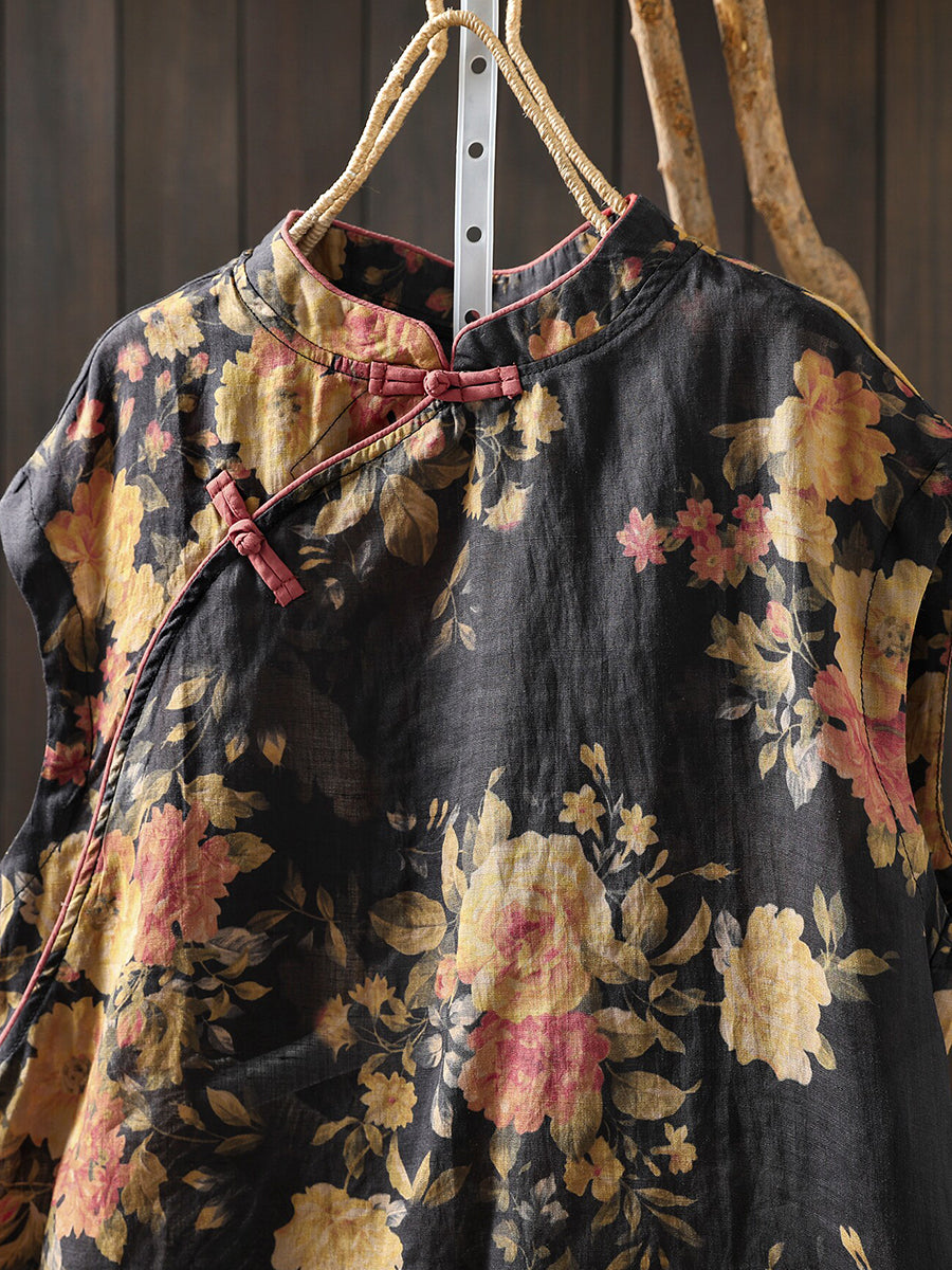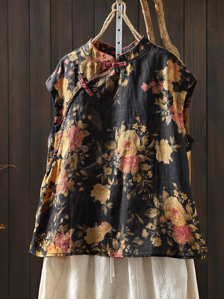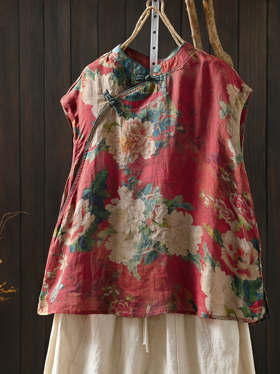 Camisa étnica de verano para mujer con cuello alto y estampado floral, 100% ramio.