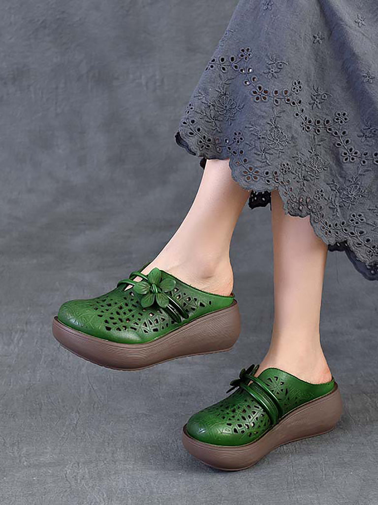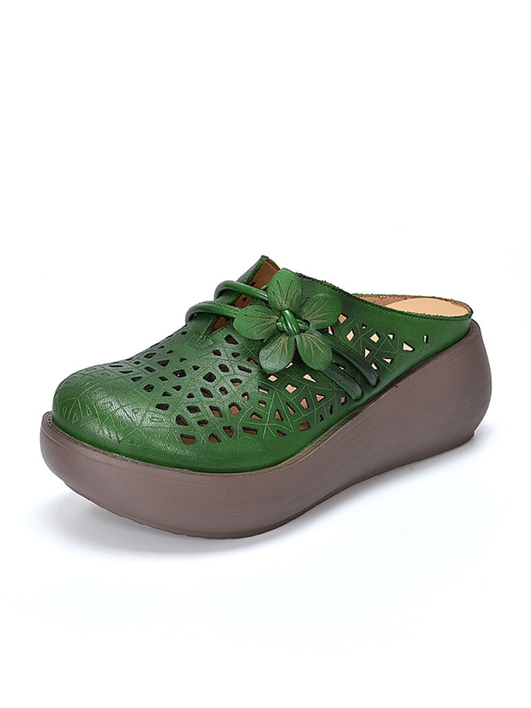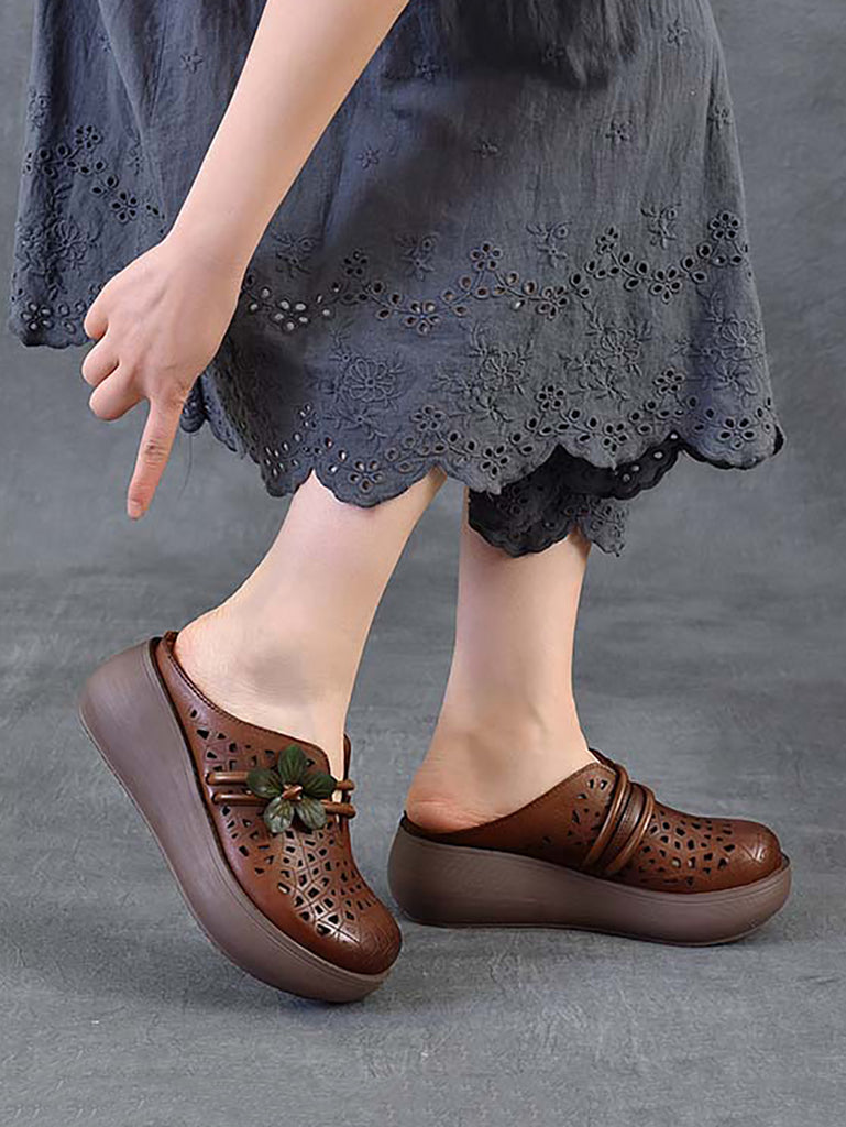 Pantuflas de plataforma huecas con flores de cuero étnico para mujer