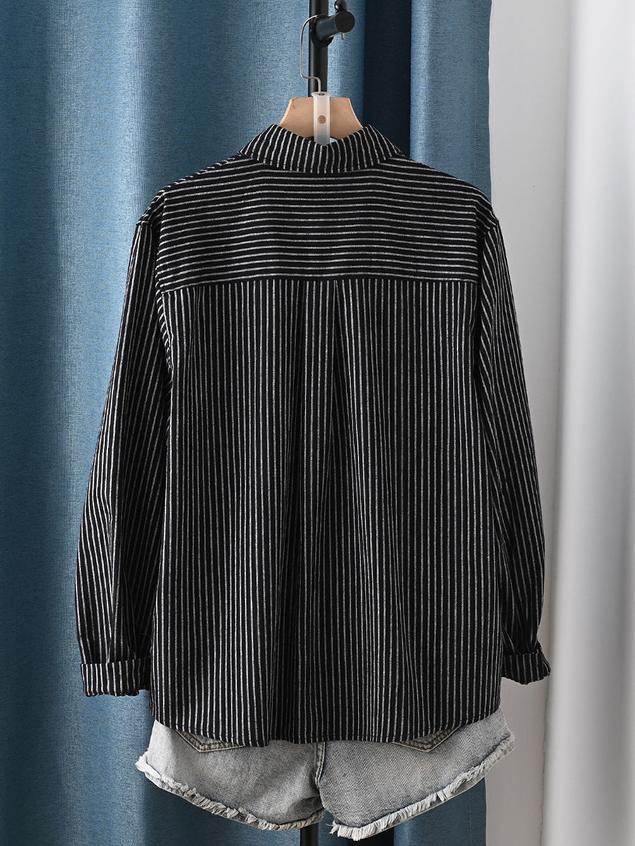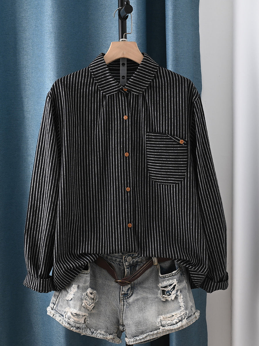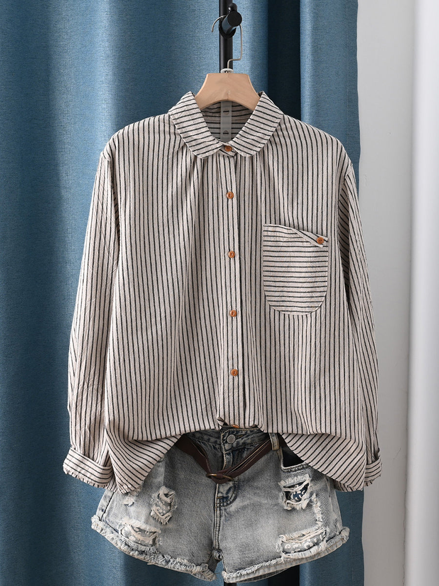 Camisa de mujer de primavera con cuello vuelto y rayas artísticas 100 % algodón