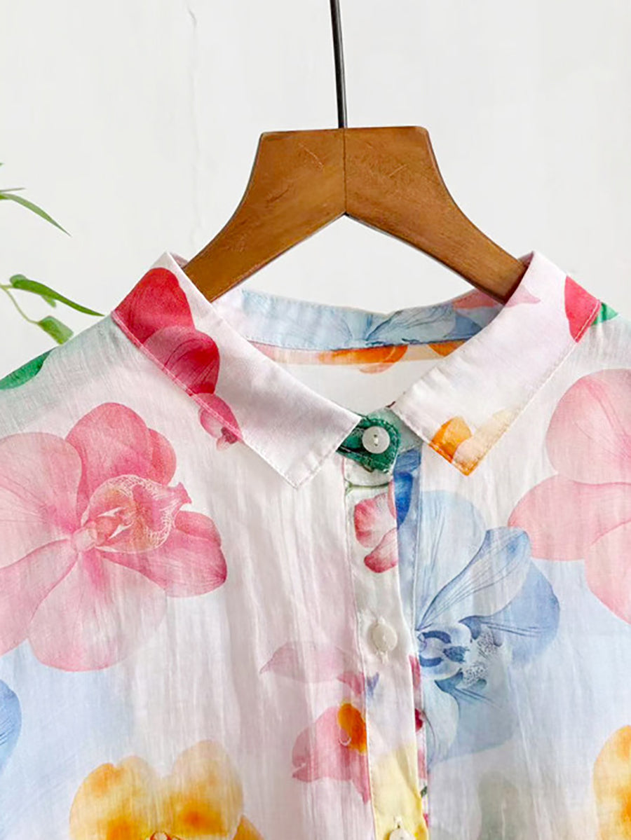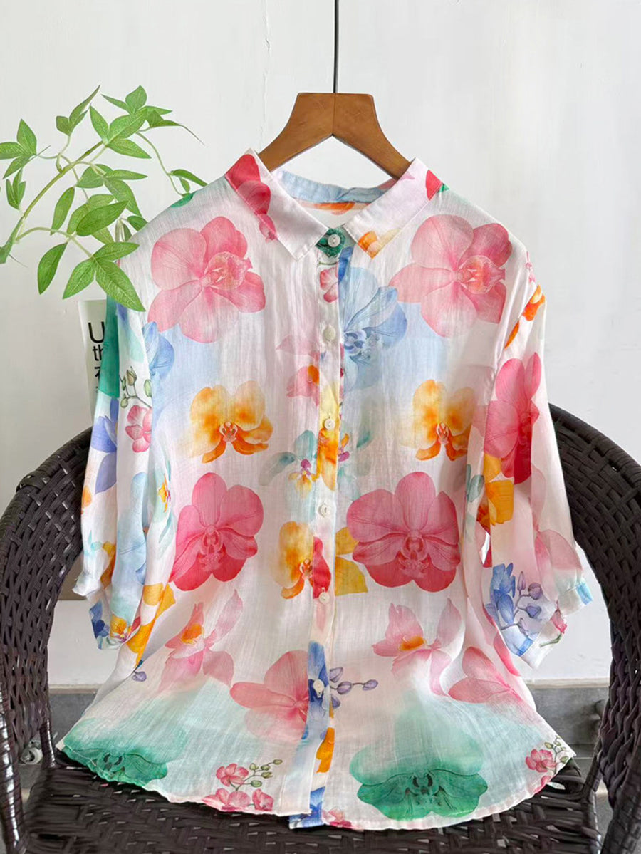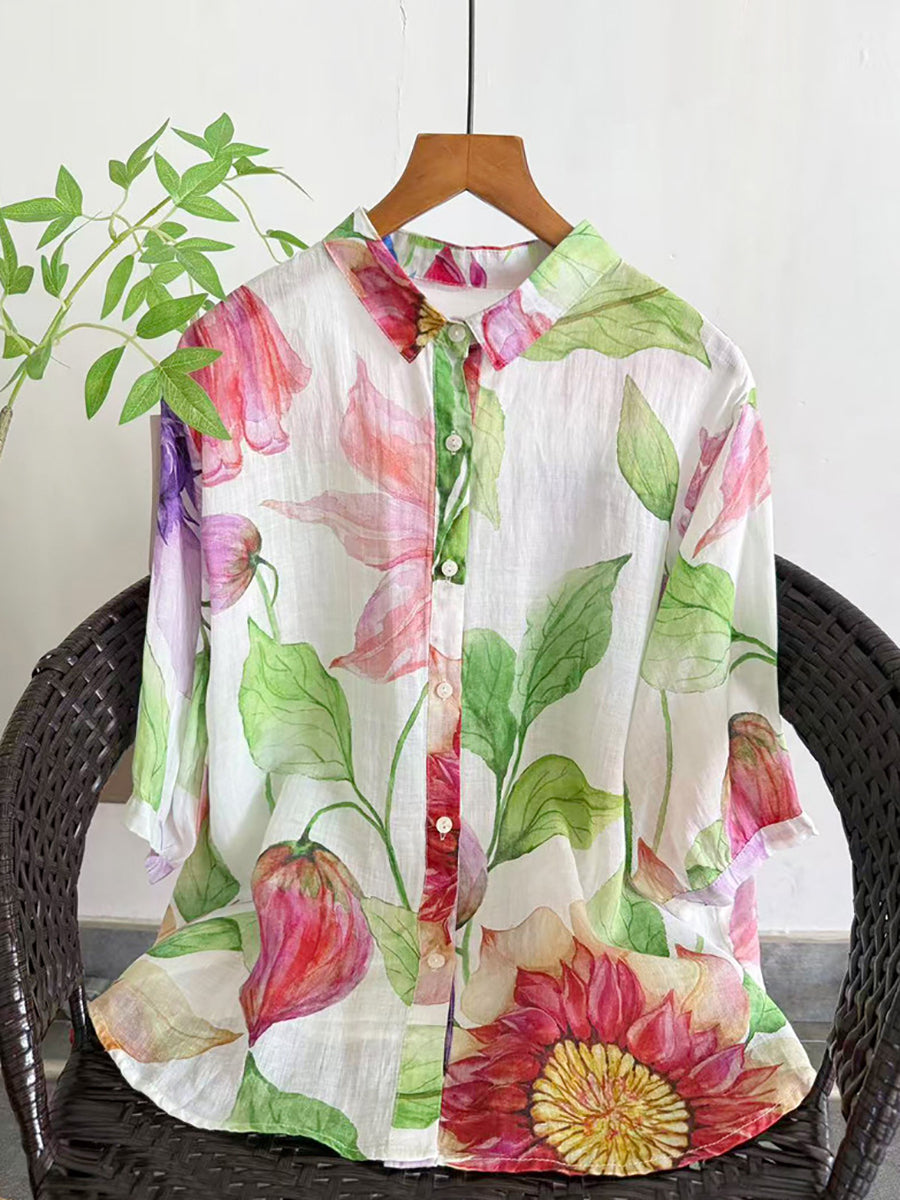 Blusa de verano para mujer con estampado floral artístico, 100% ramio.