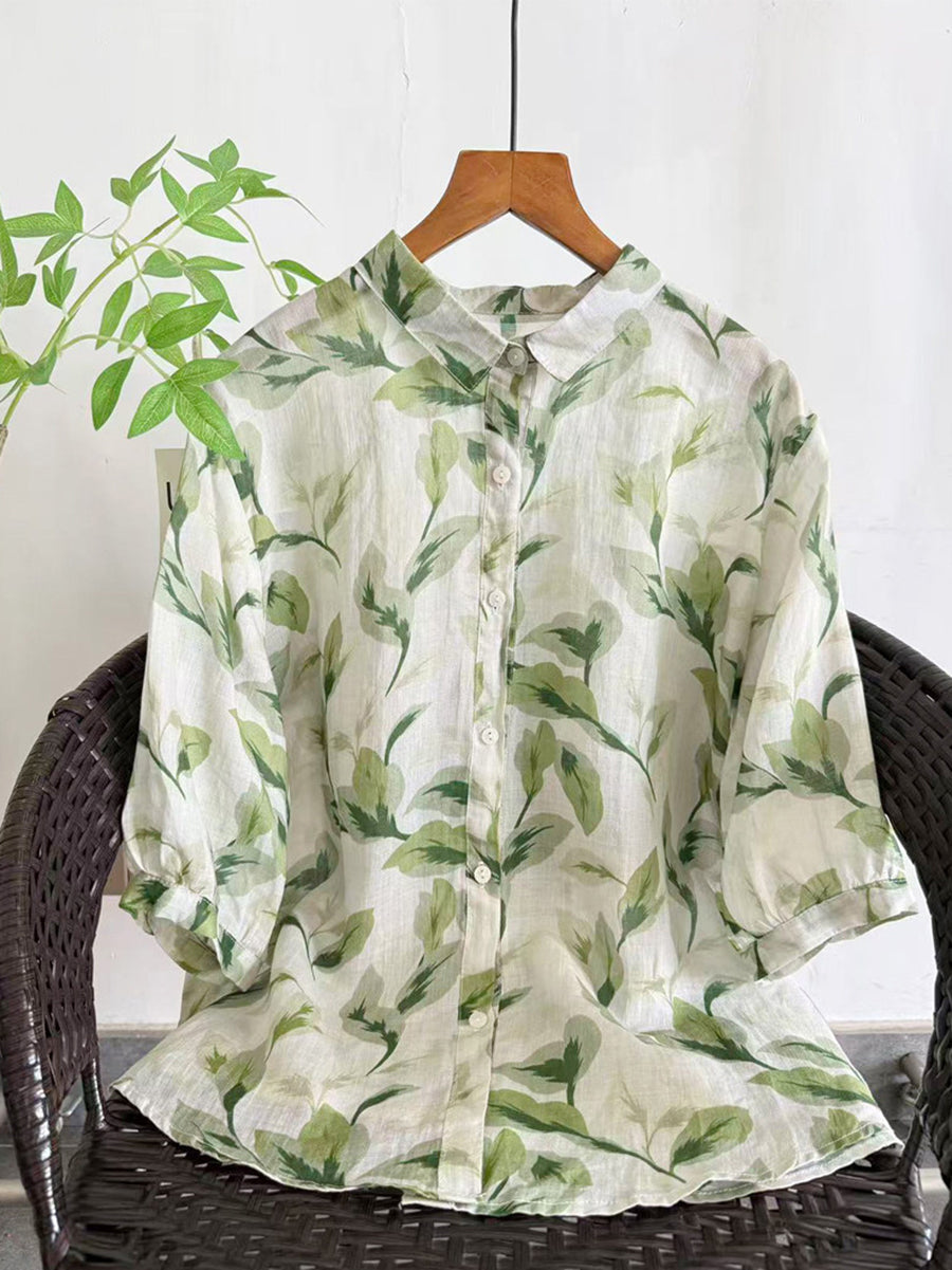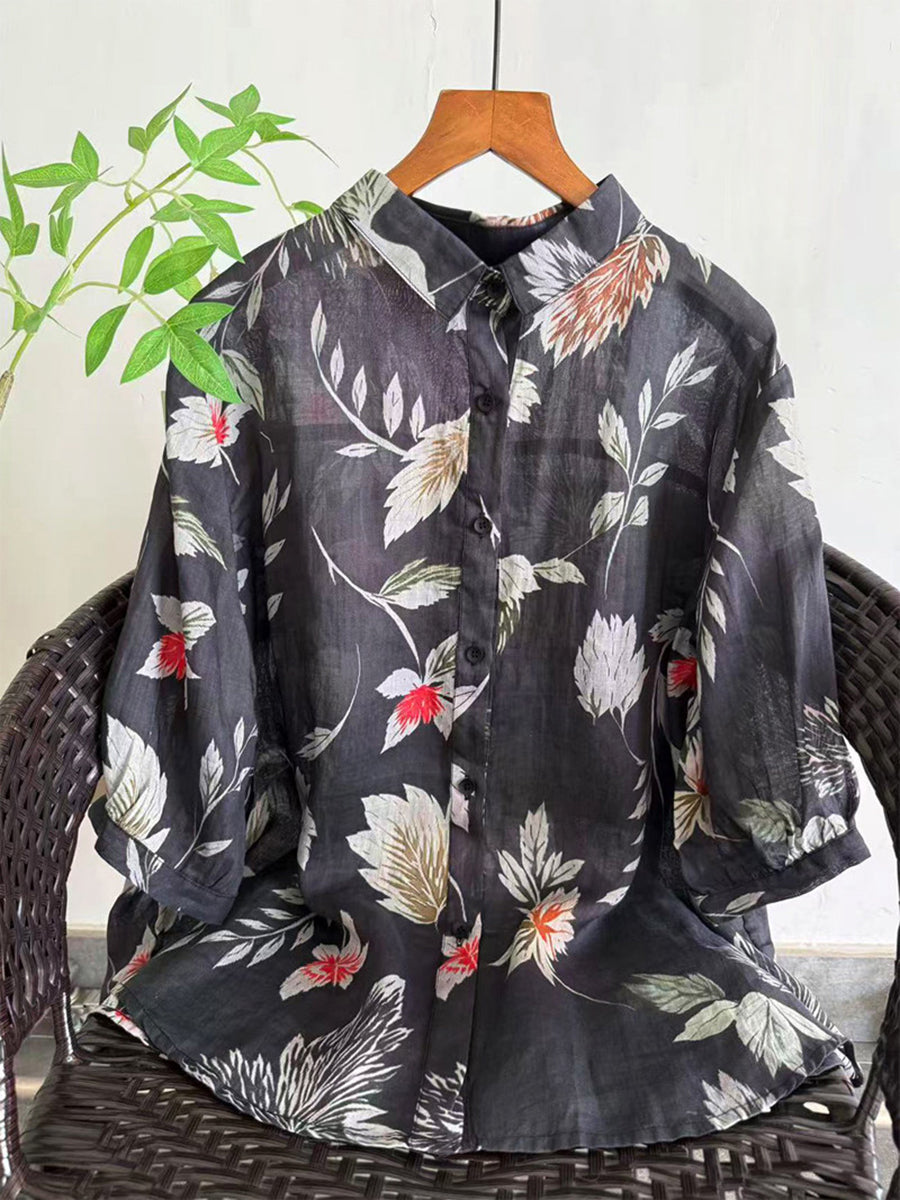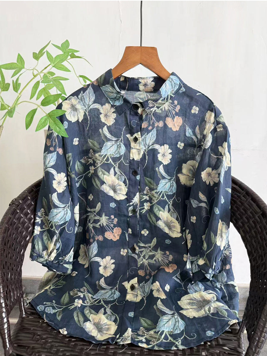 Blusa de verano para mujer con estampado floral artístico, 100% ramio.