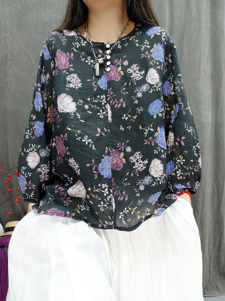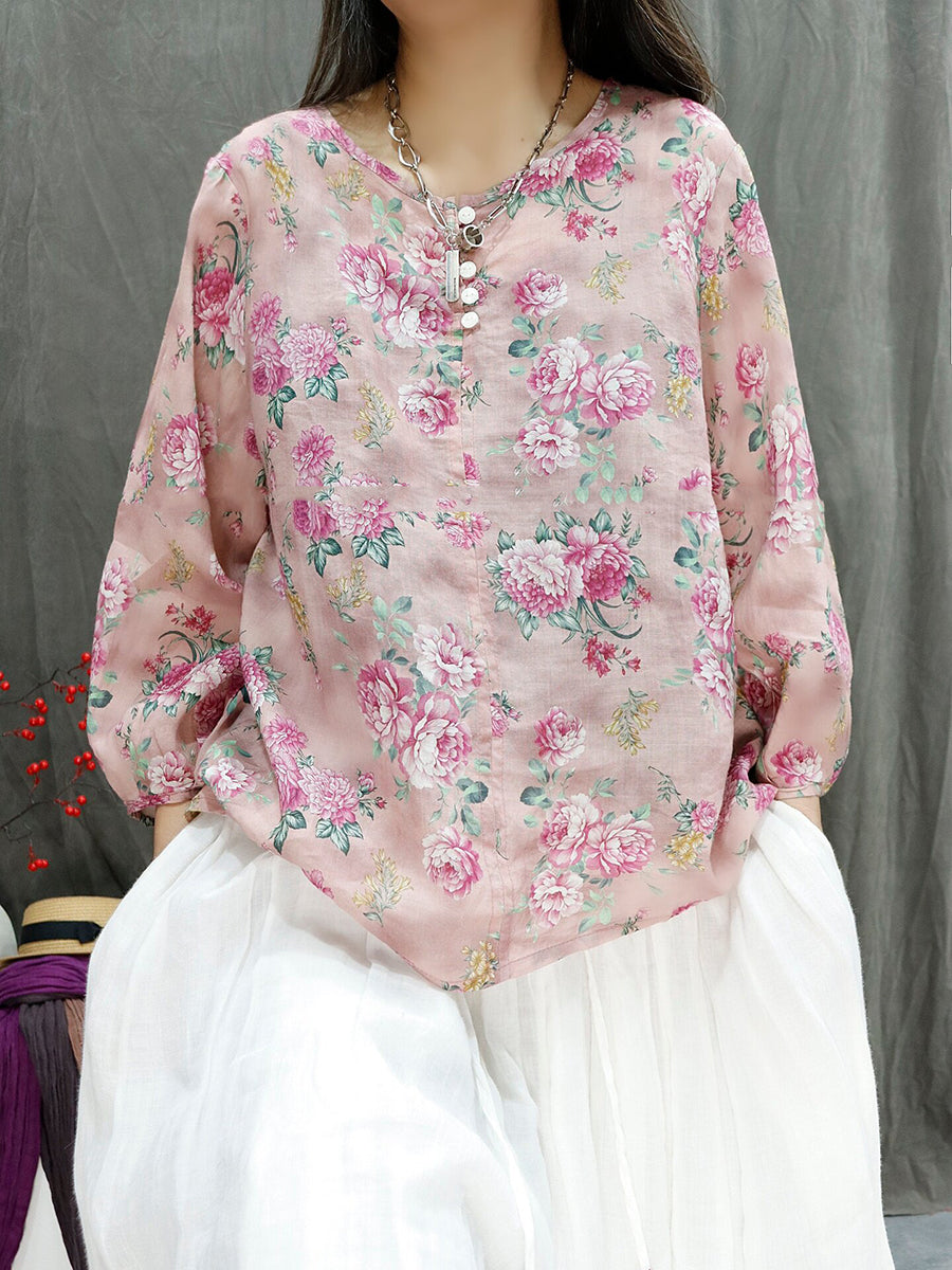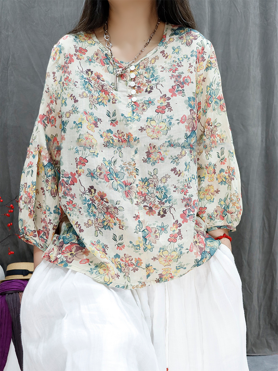 Blusa de verano para mujer con estampado floral artístico, 100% ramio, cuello redondo.