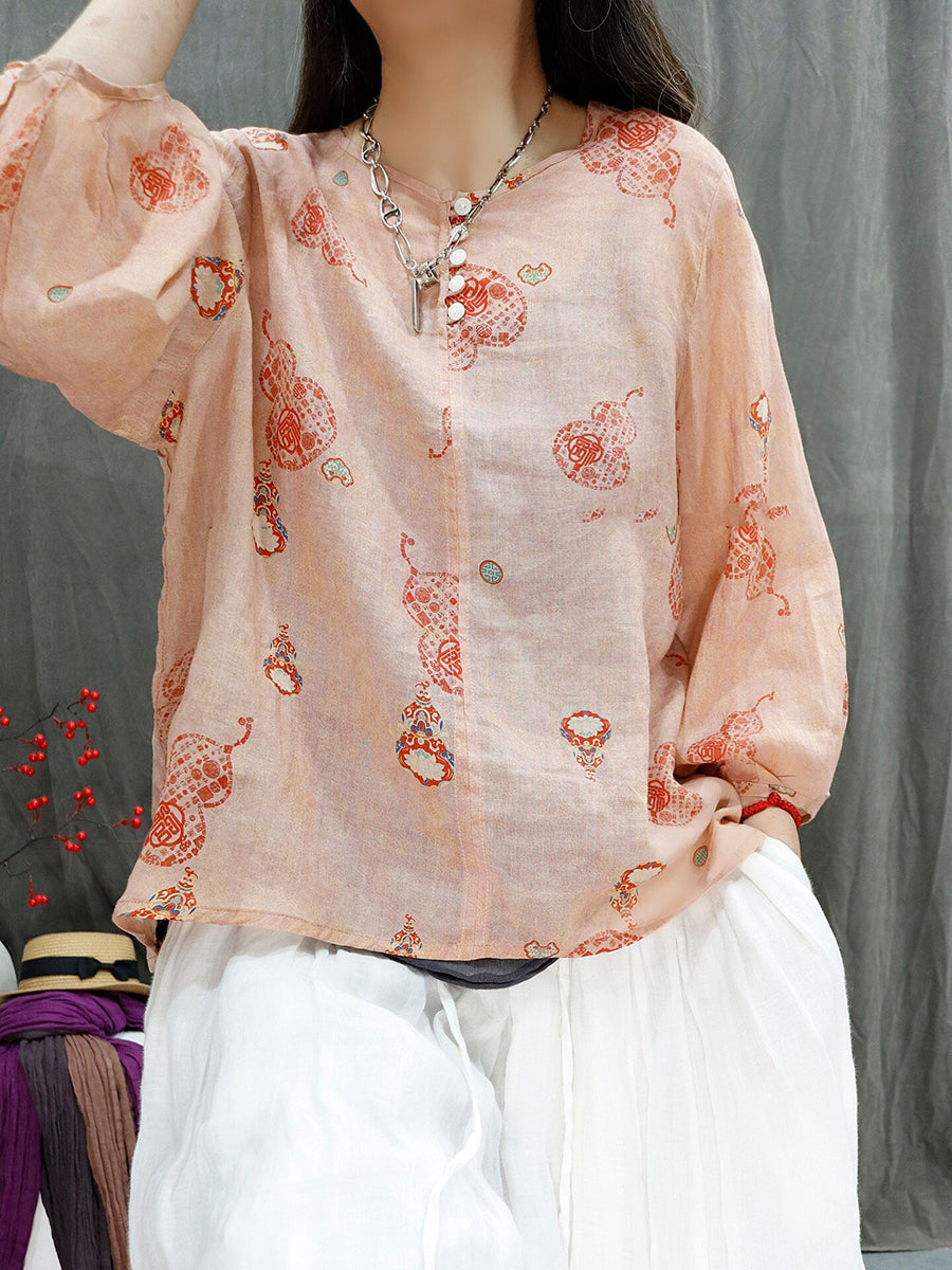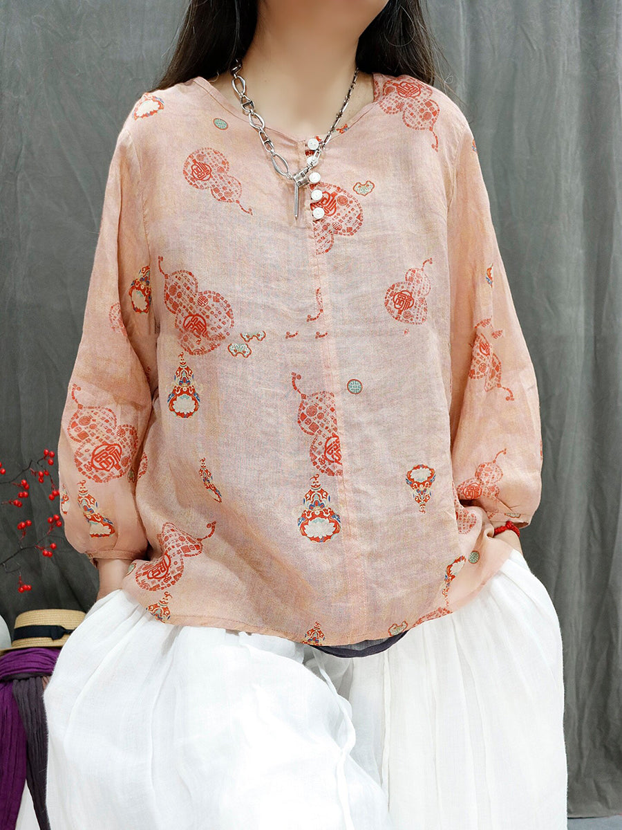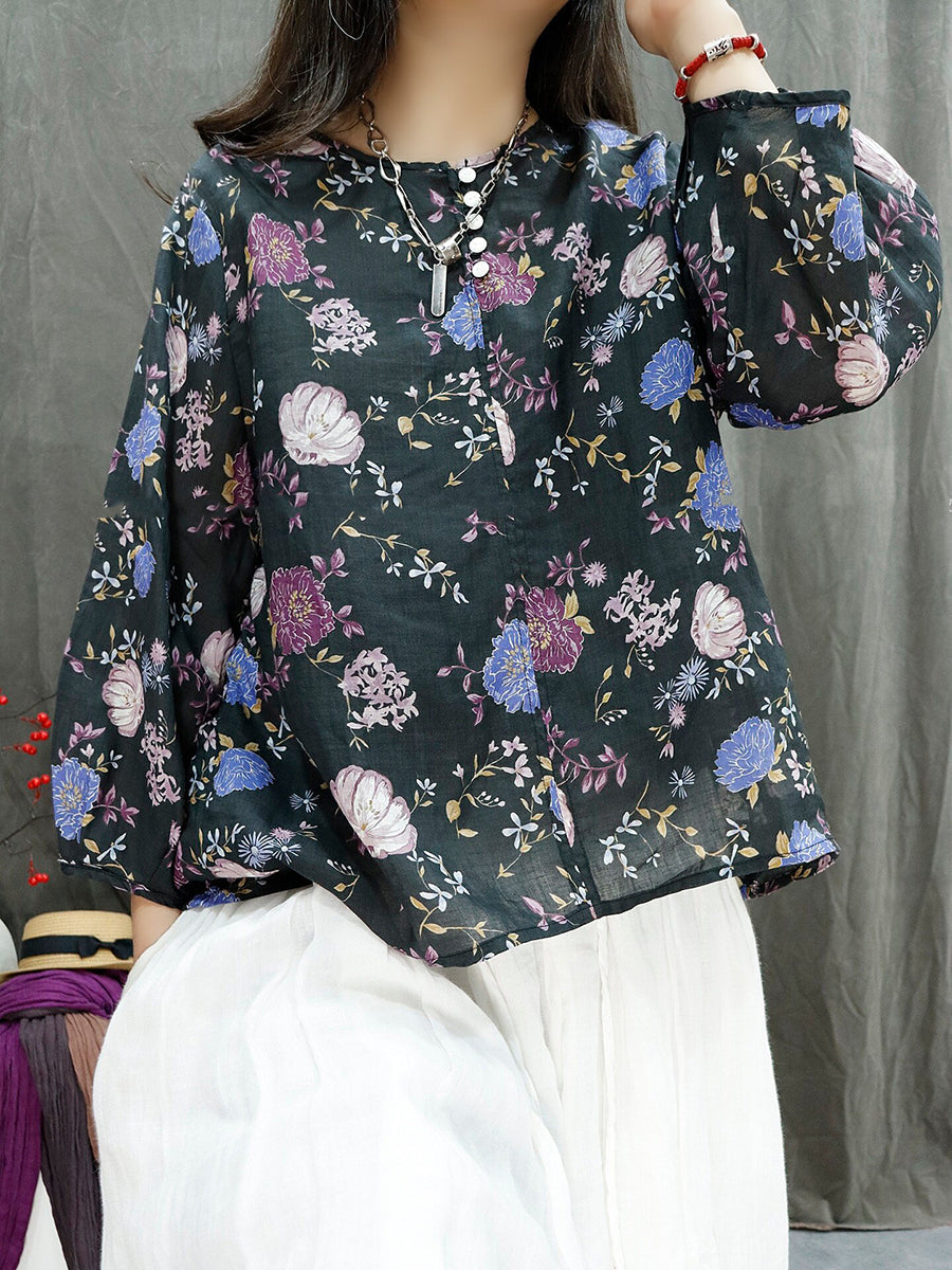 Blusa de verano para mujer con estampado floral artístico, 100% ramio, cuello redondo.