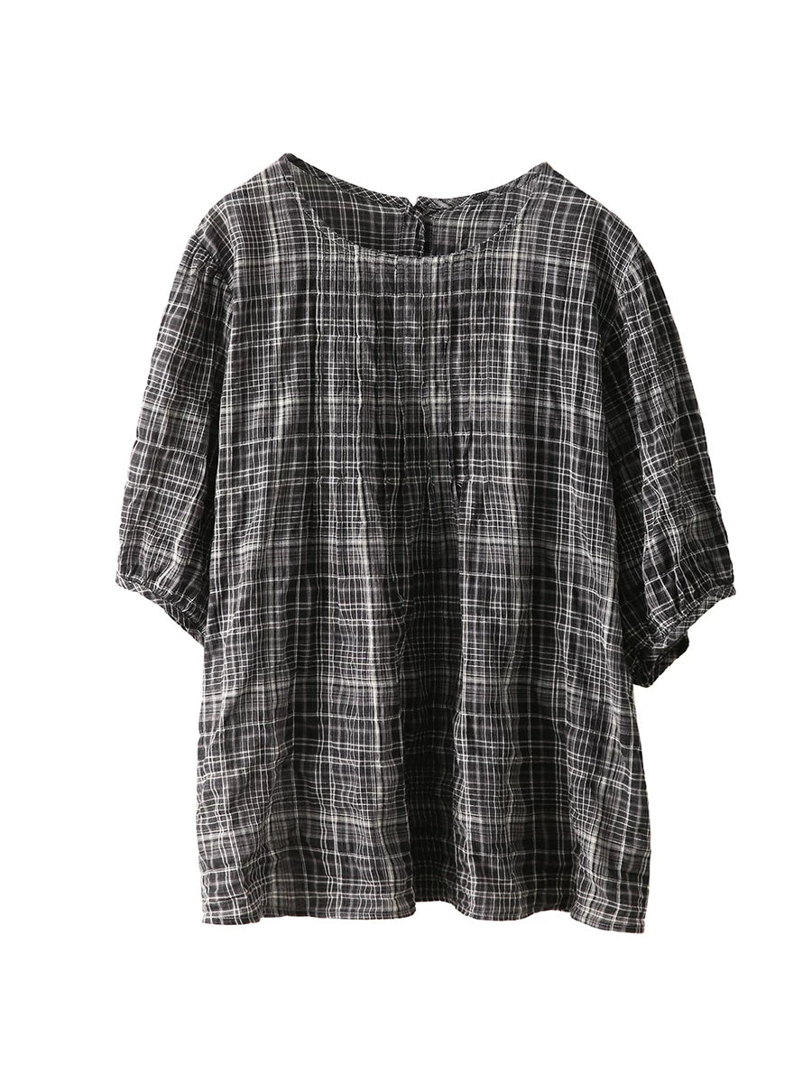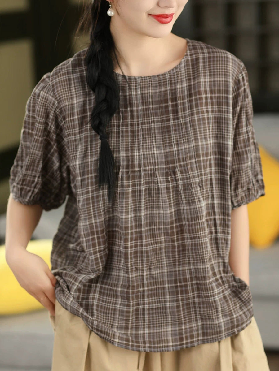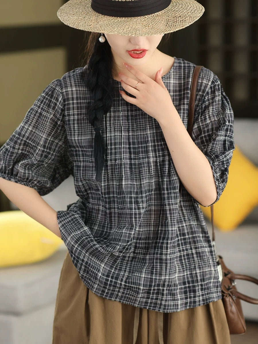 Blusa de verano para mujer, estilo artístico, a cuadros, 100% algodón, cuello redondo.