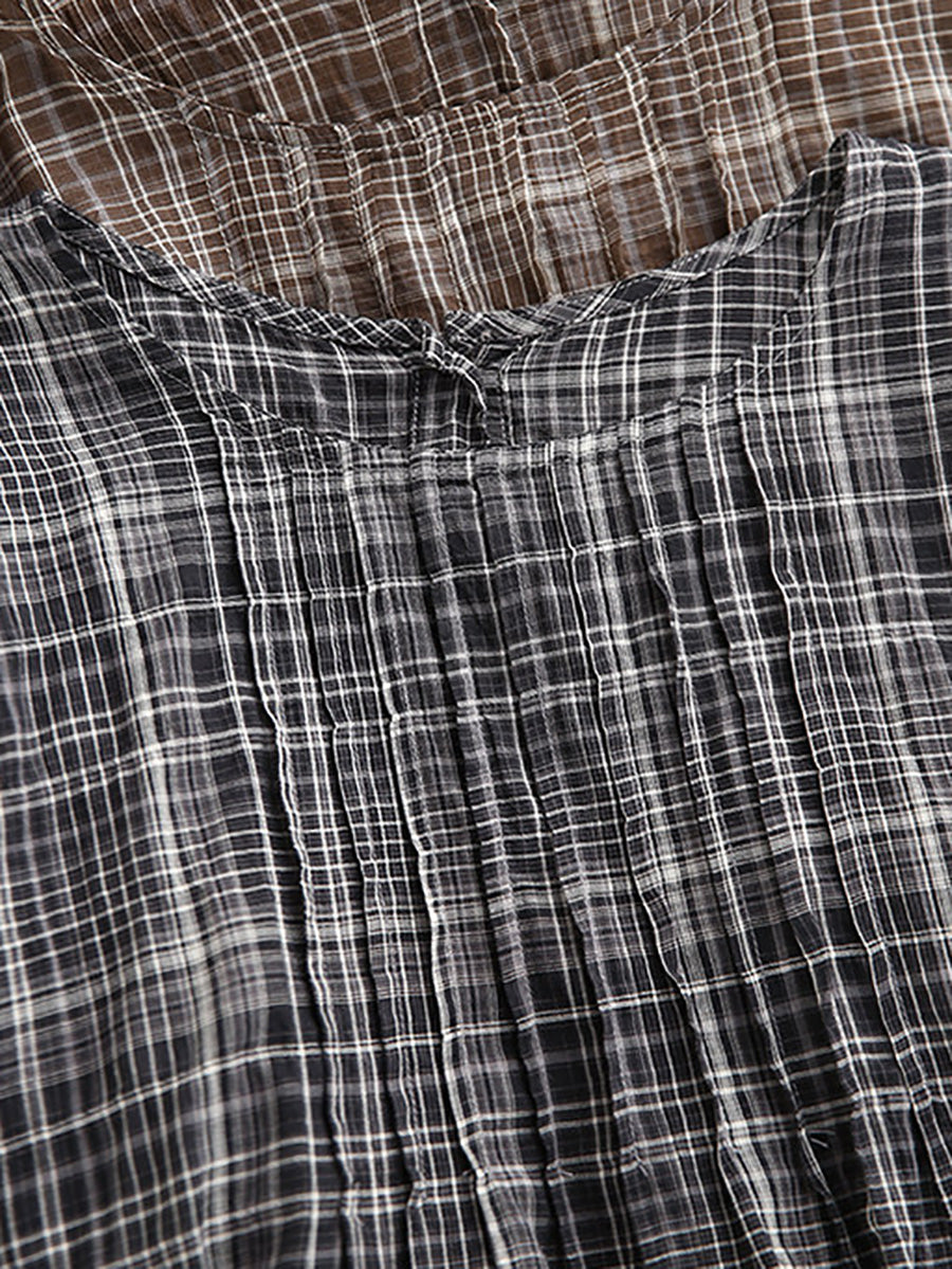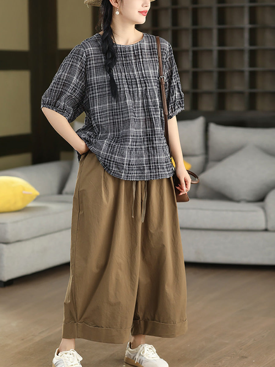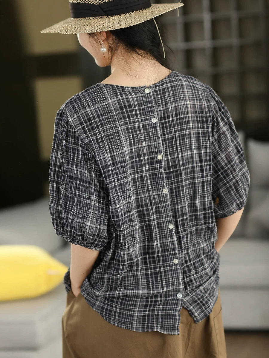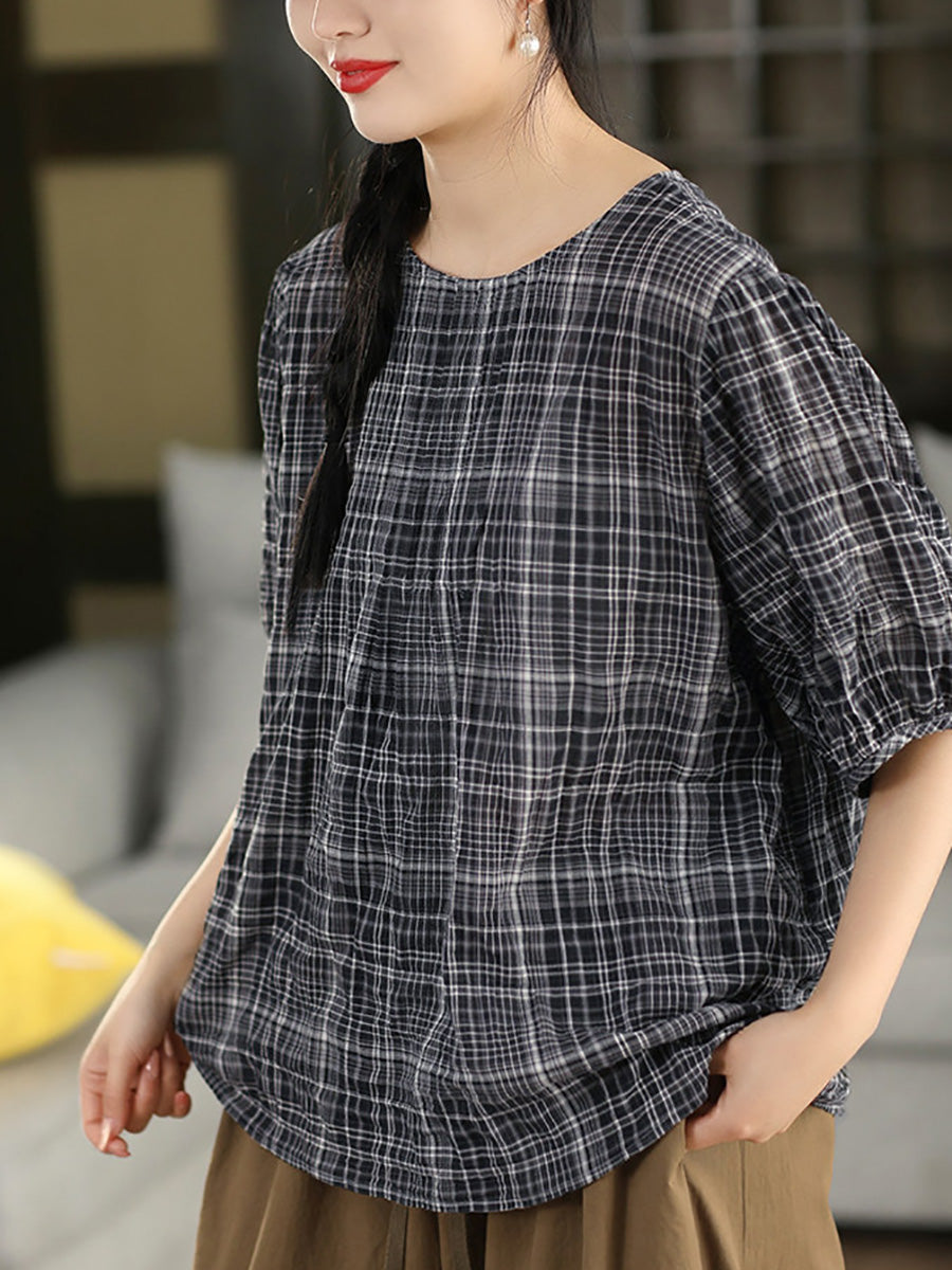 Blusa de verano para mujer, estilo artístico, a cuadros, 100% algodón, cuello redondo.