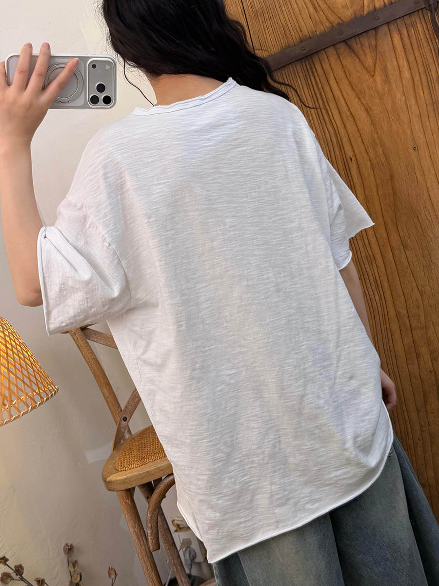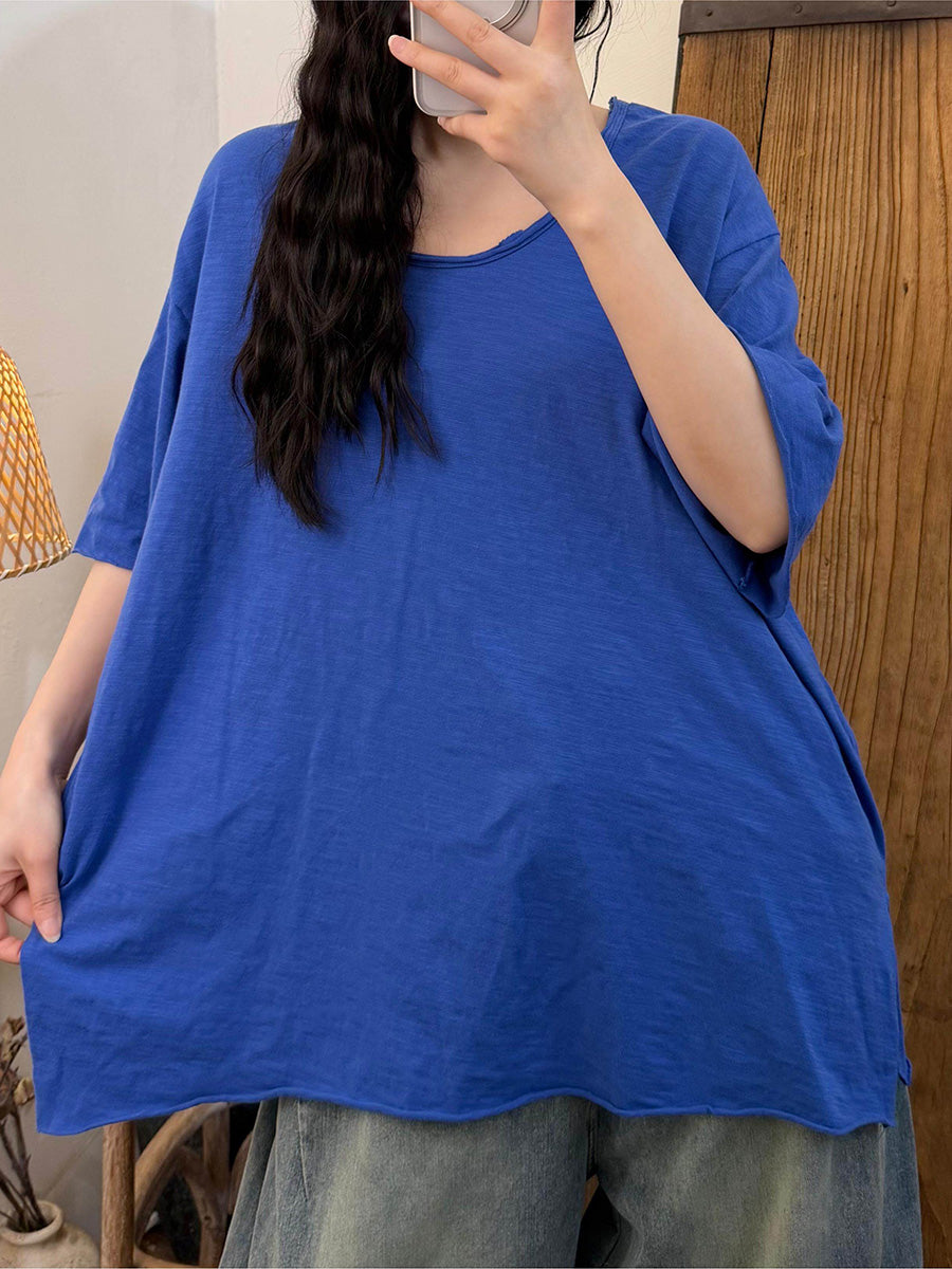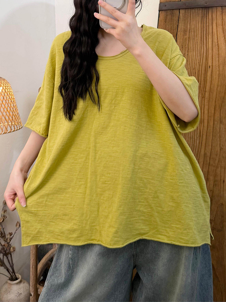 Camiseta de mujer informal de verano de color liso con cuello redondo
