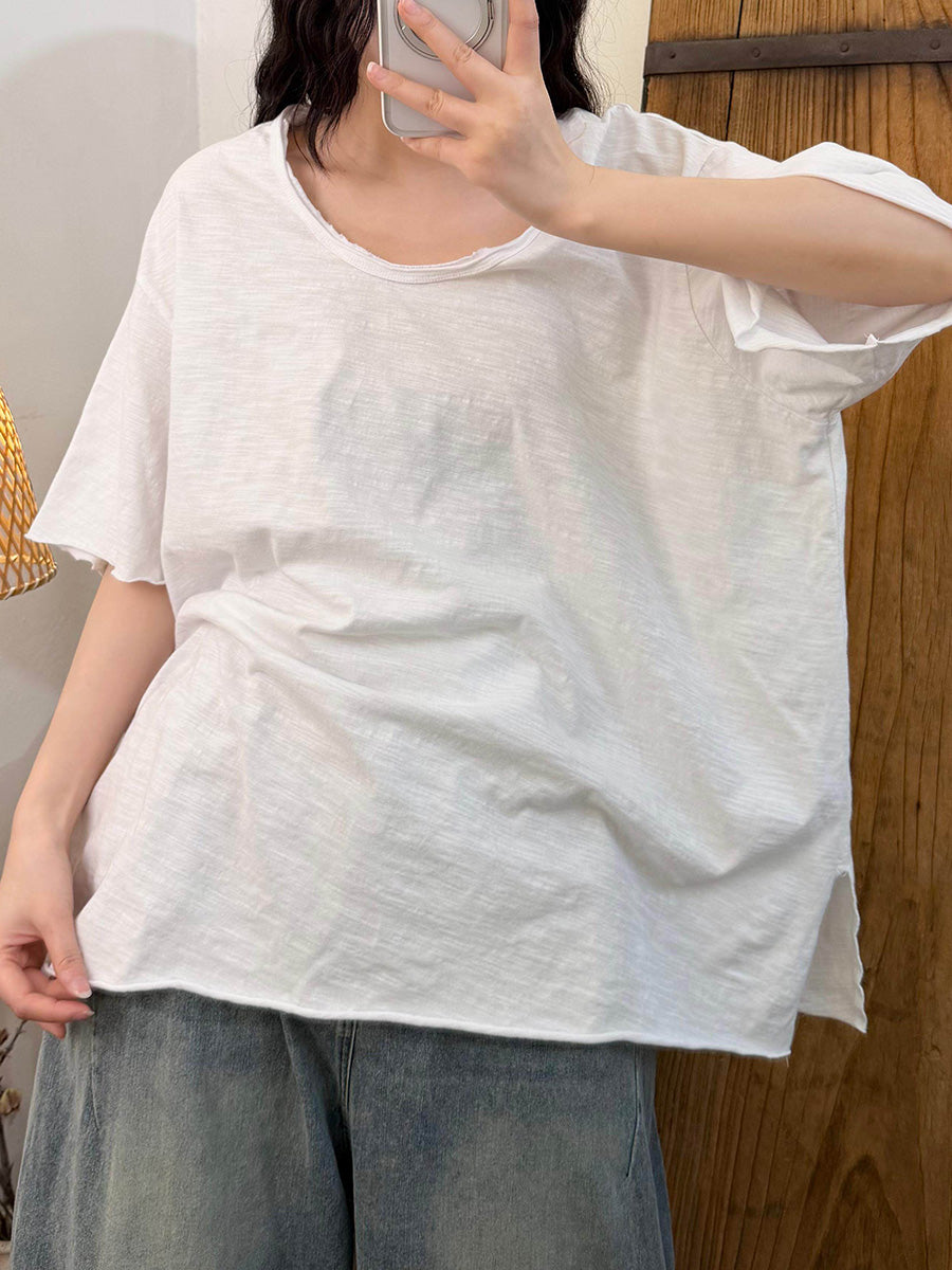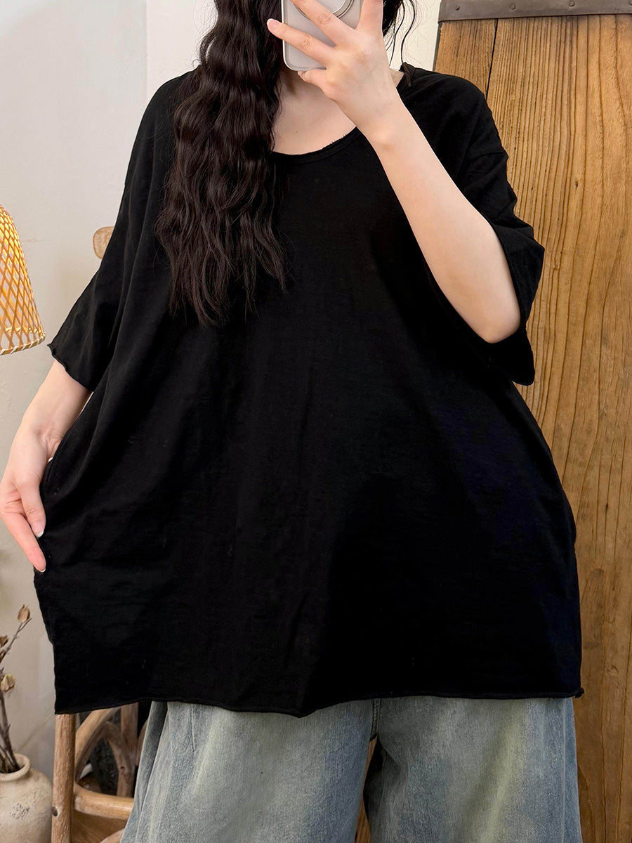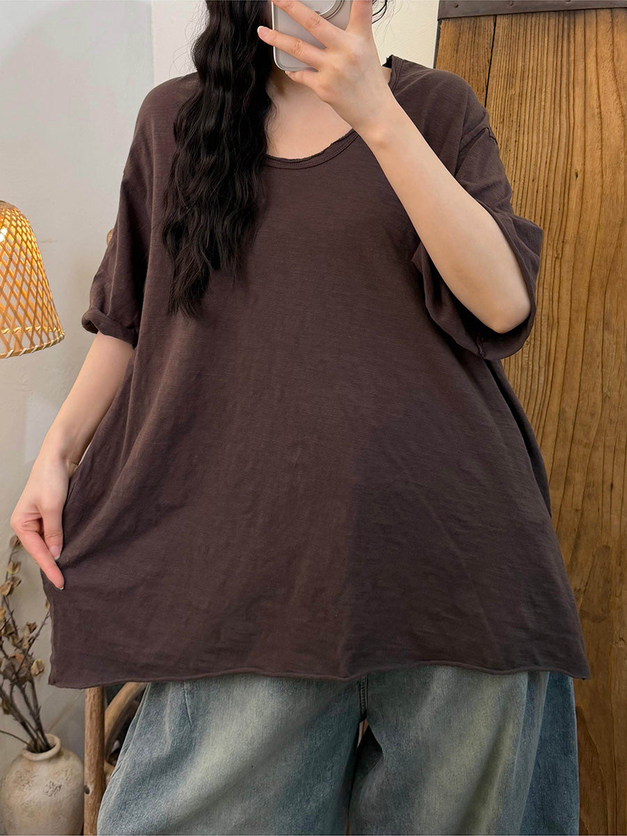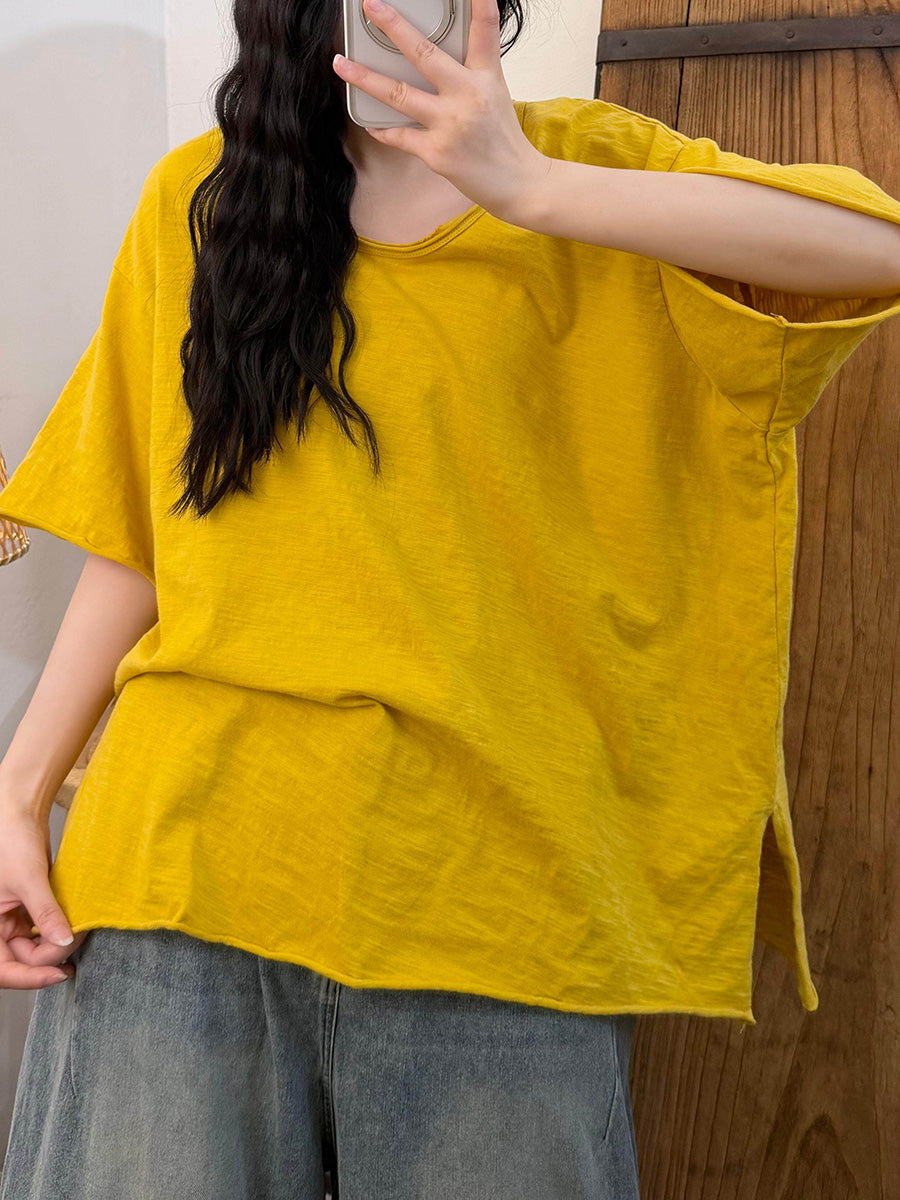 Camiseta de mujer informal de verano de color liso con cuello redondo