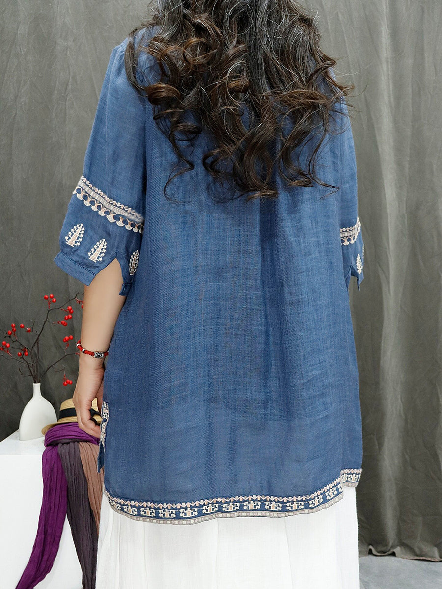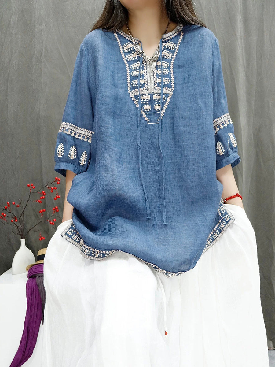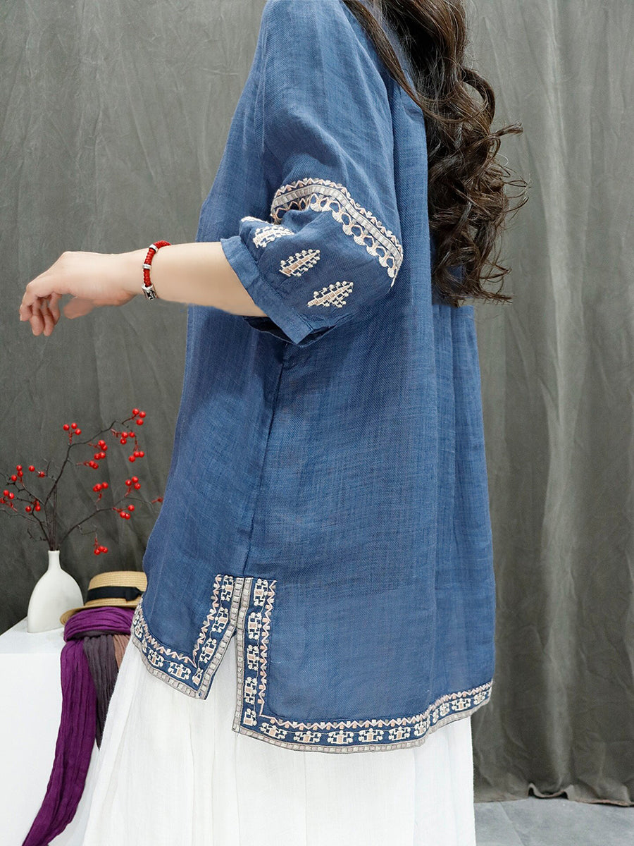 Blusa de verano retro para mujer con bordado 100% ramio.
