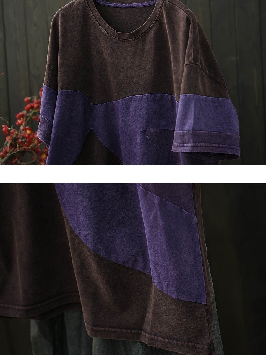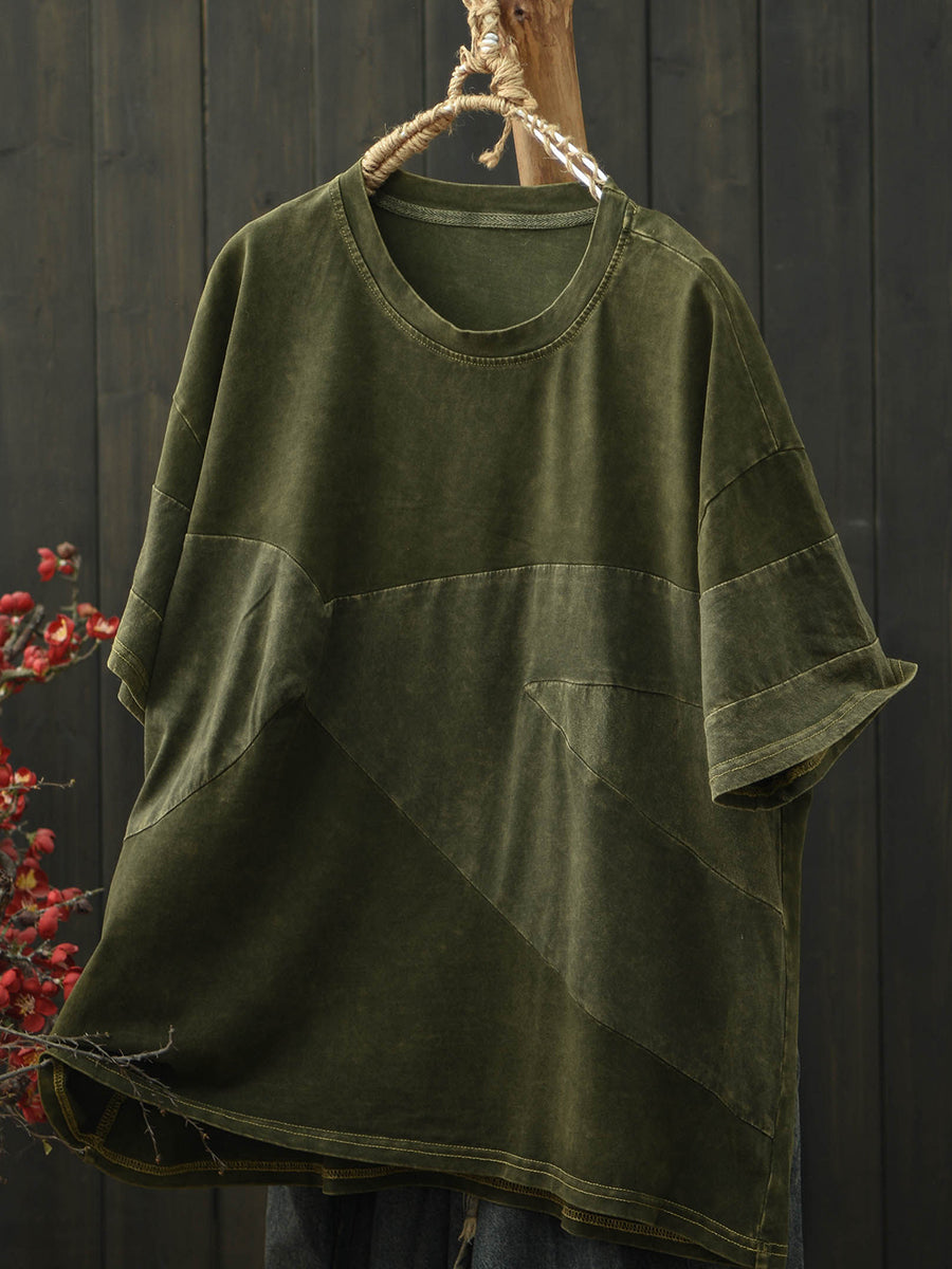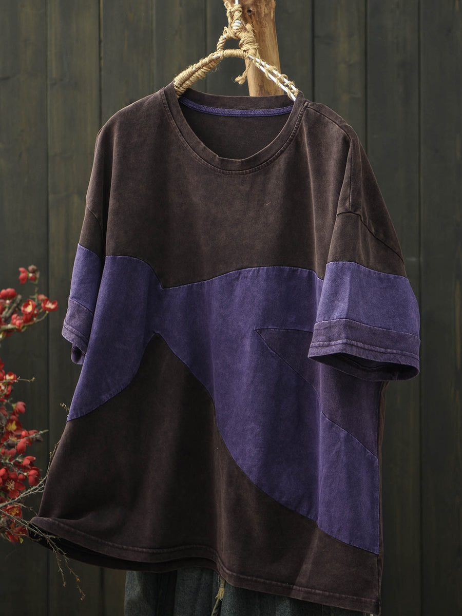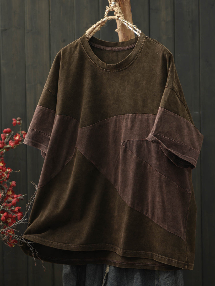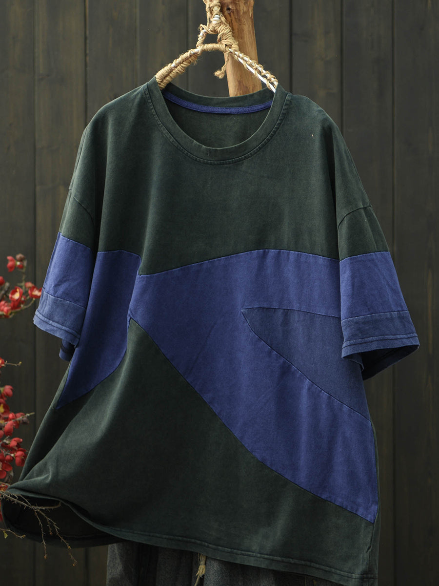 Camiseta de algodón con cuello redondo y estampado patchwork retro para mujer, ideal para el verano.