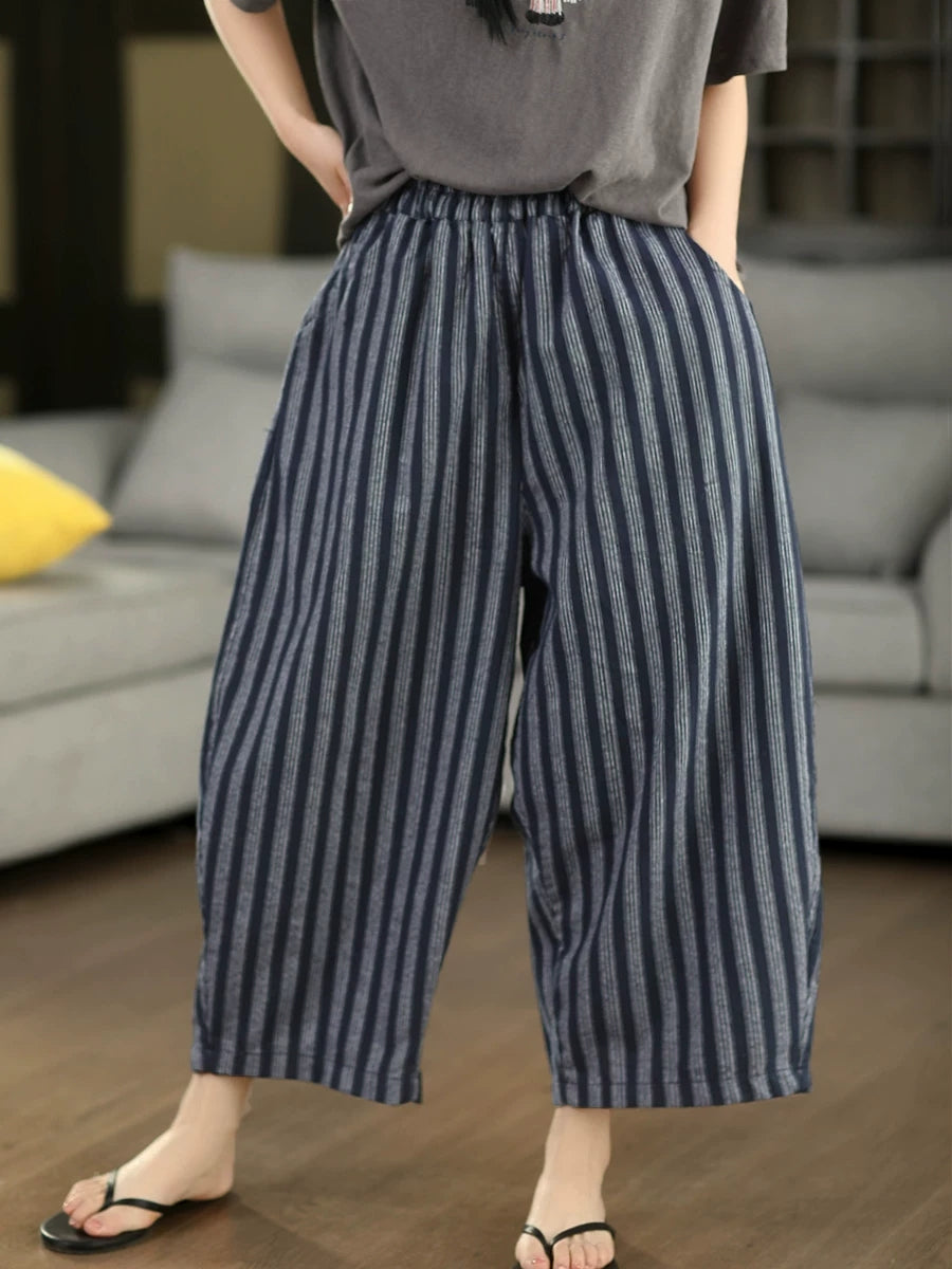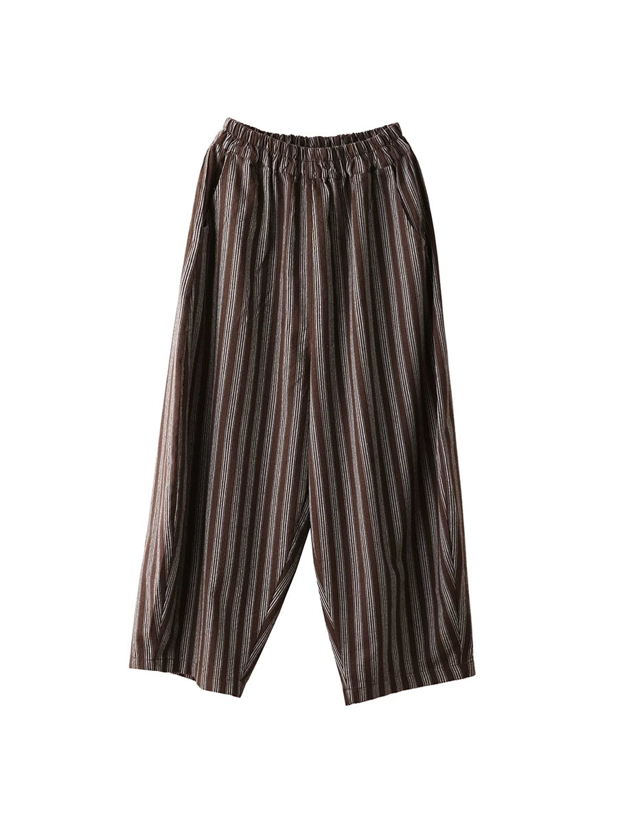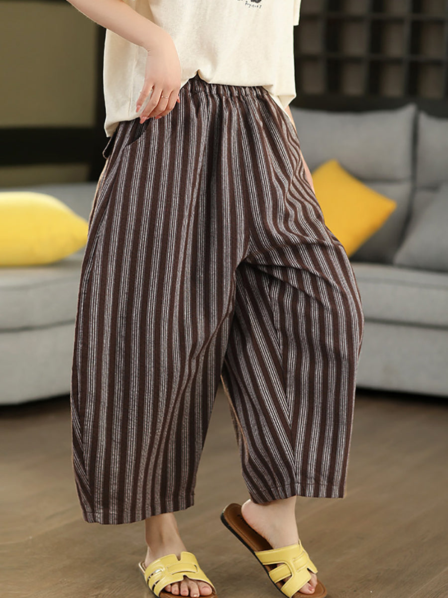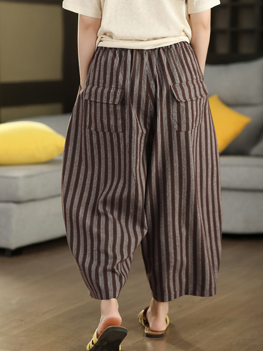 Pantalones harem de lino 100% con rayas retro para mujer, ideales para el verano.