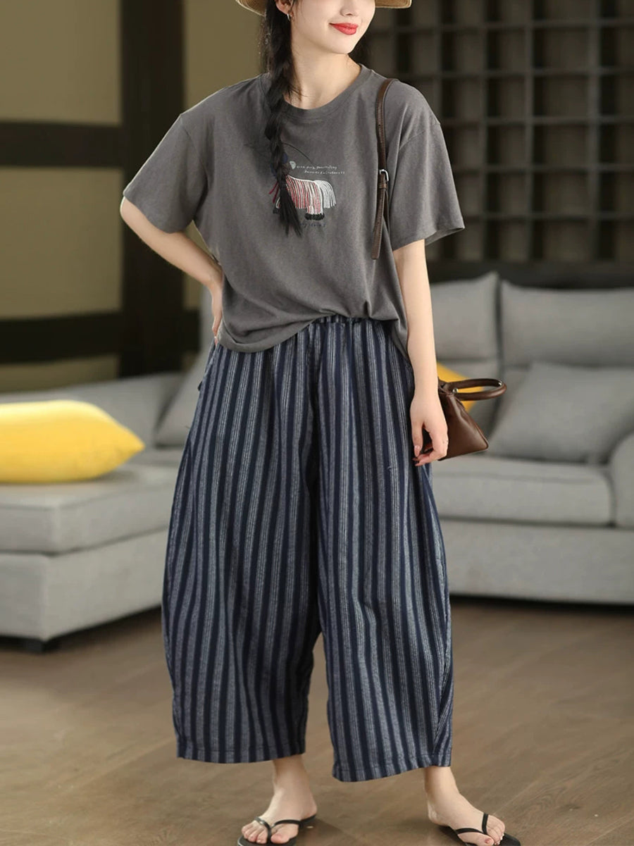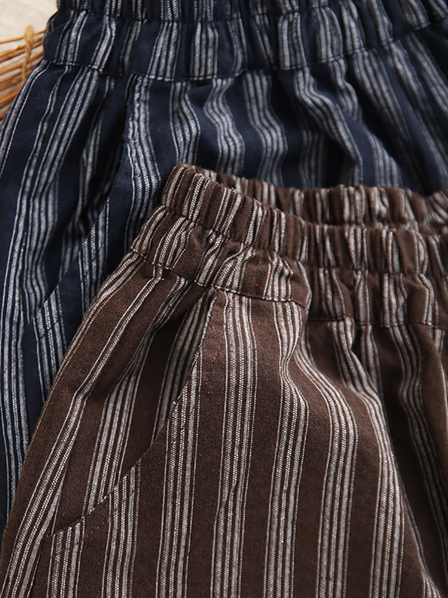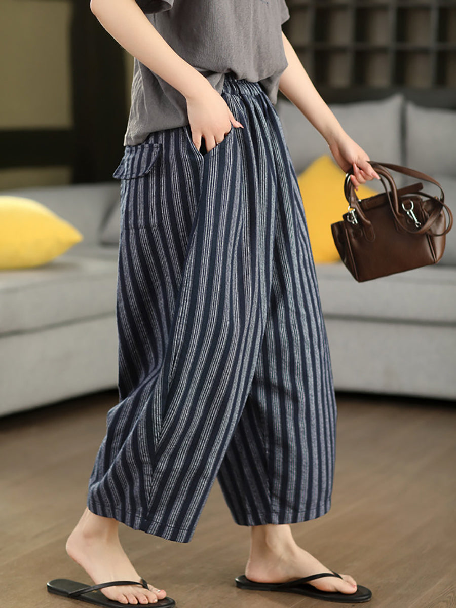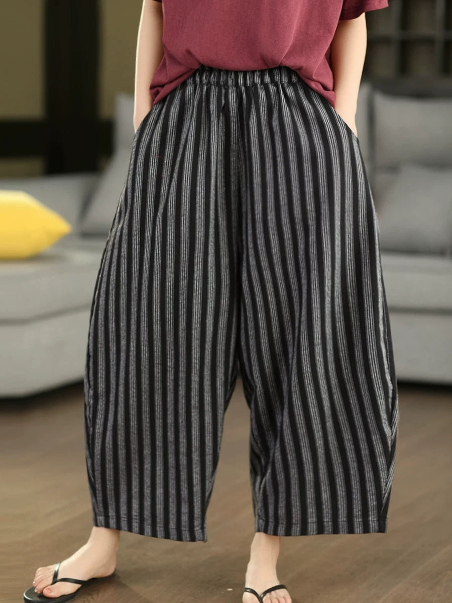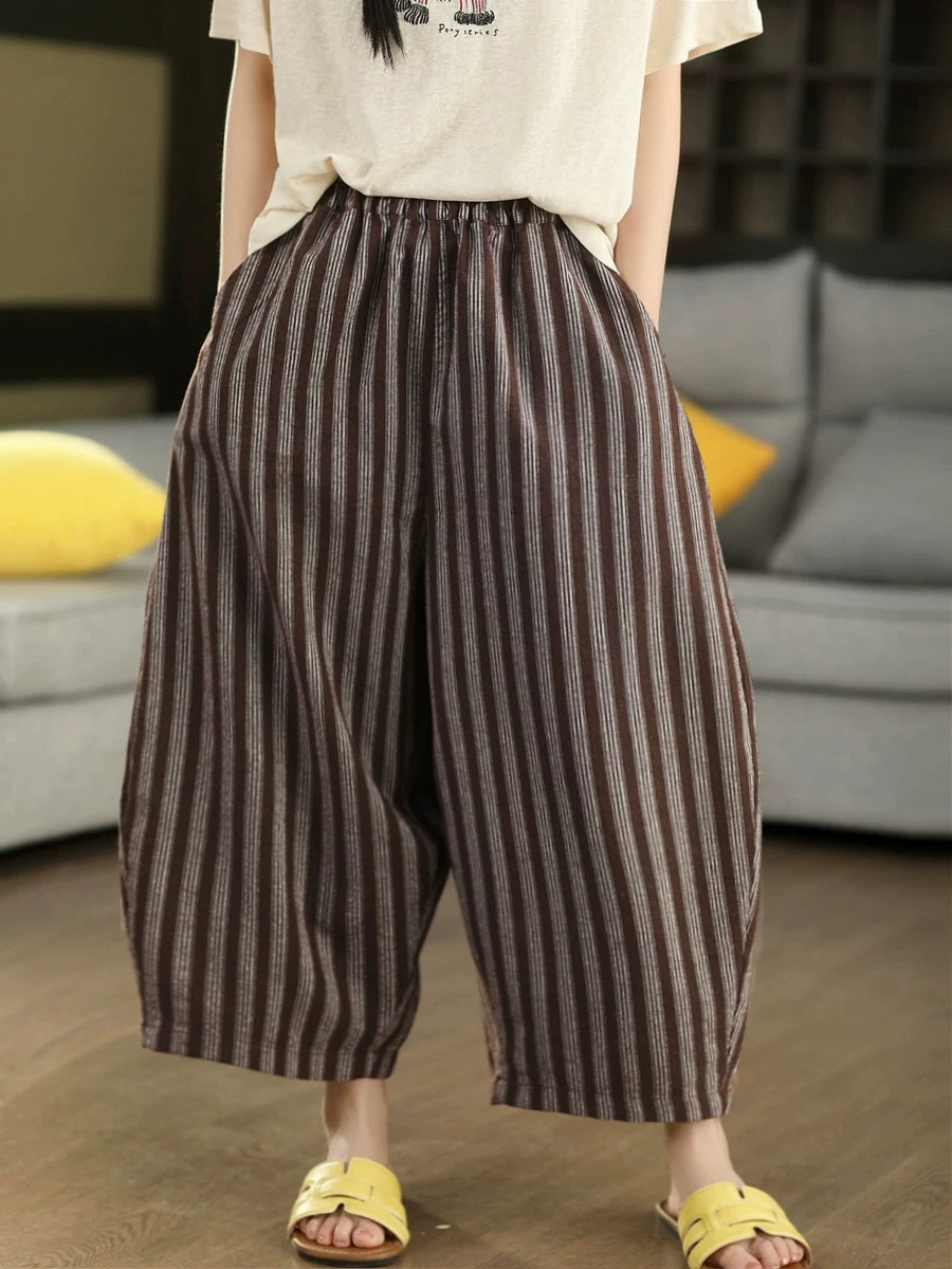 Pantalones harem de lino 100% con rayas retro para mujer, ideales para el verano.