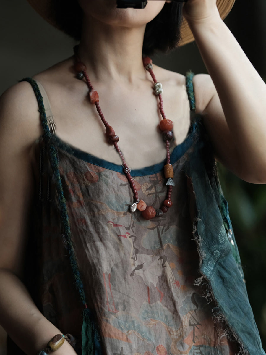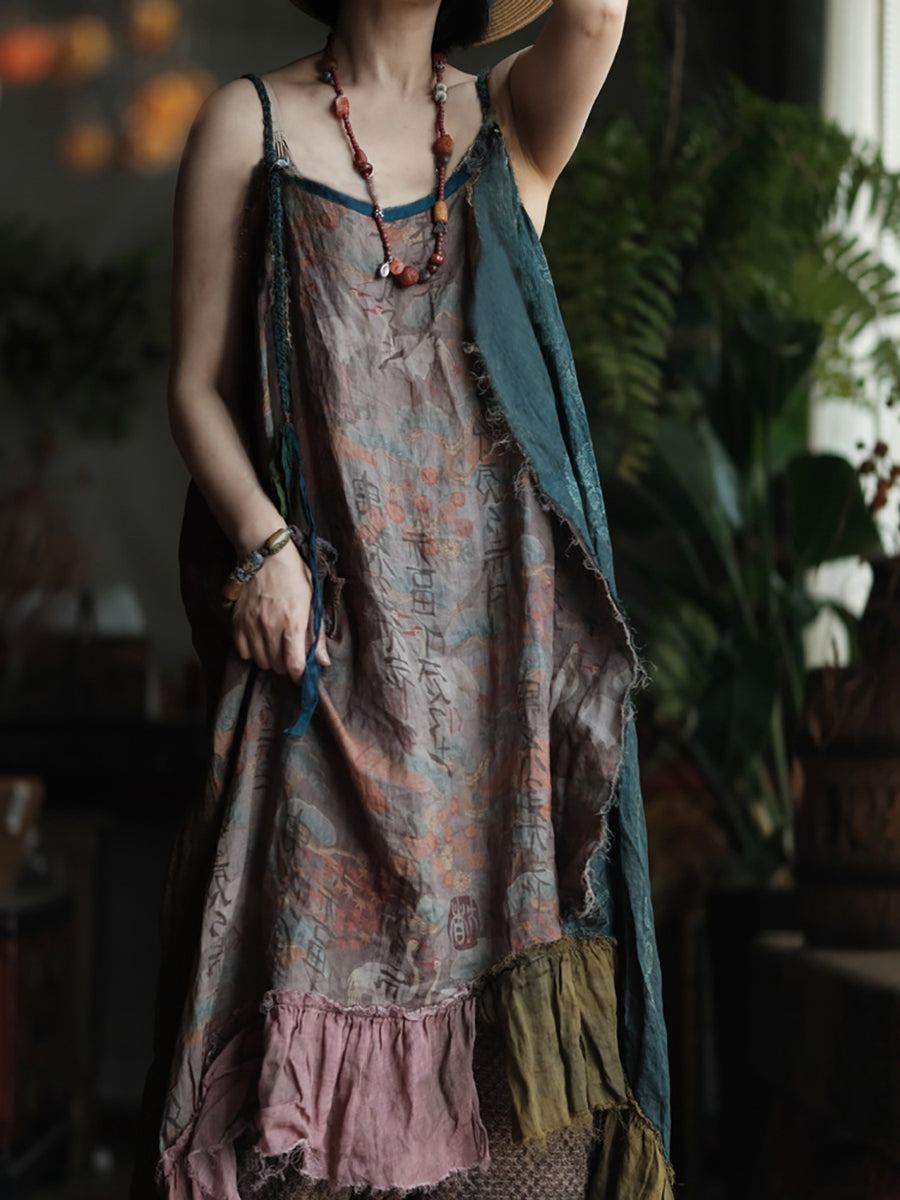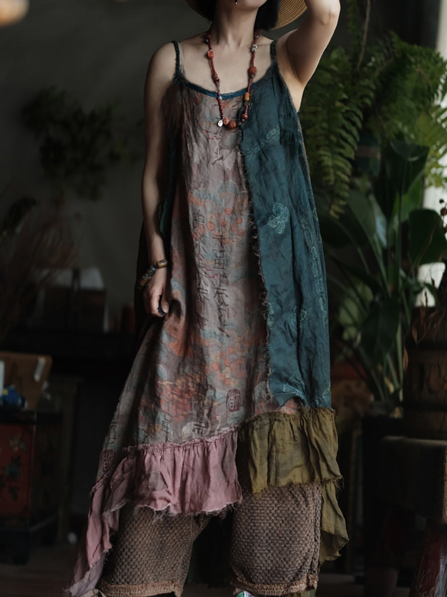 Vestido tipo chaleco de ramio con cuello redondo y parches de verano para mujer