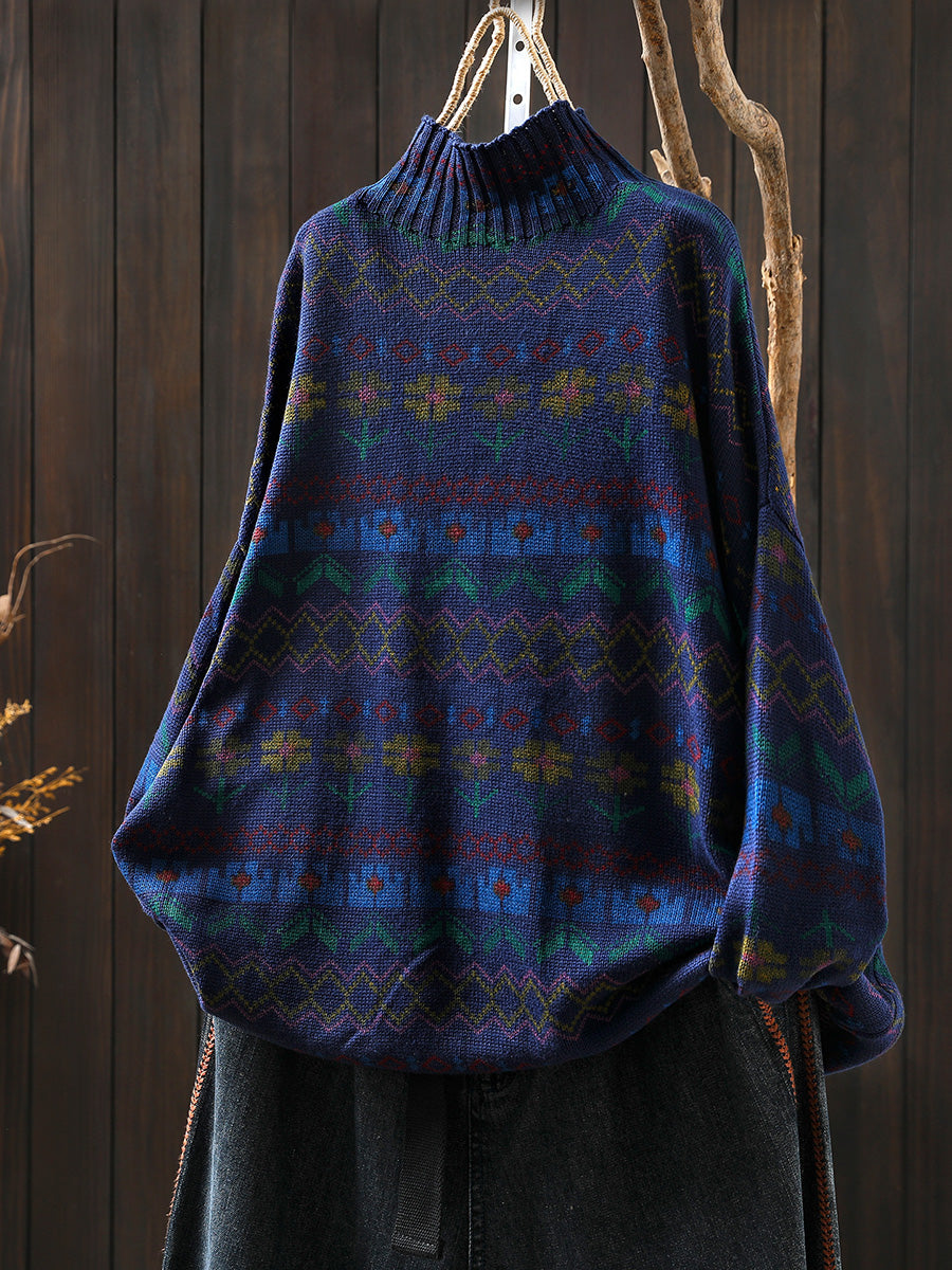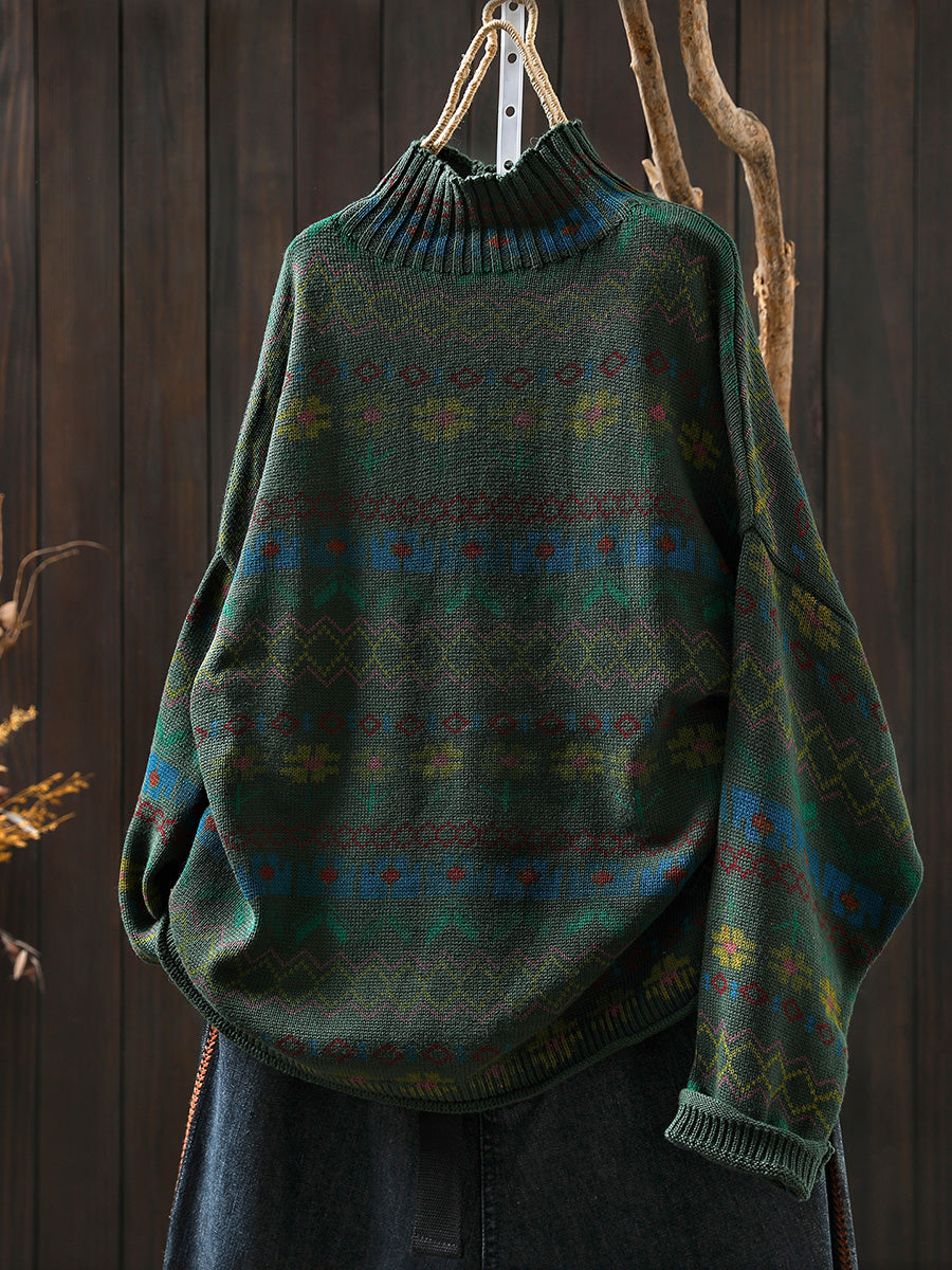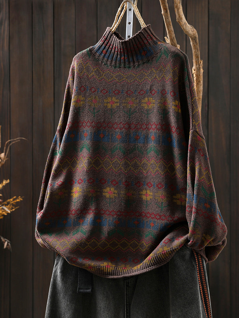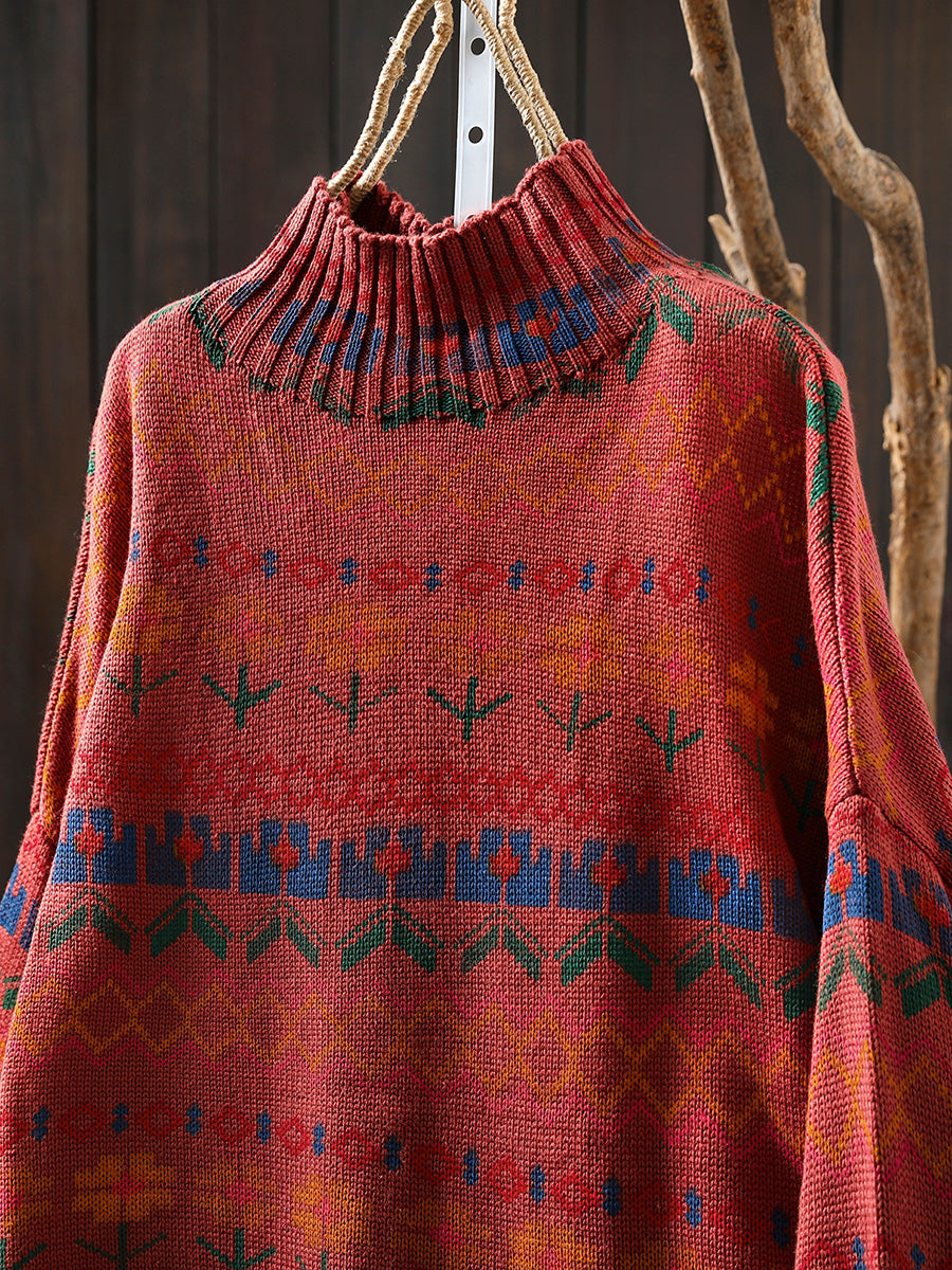 Suéter de cuello alto medio con estampado floral artístico para mujer, ideal para otoño