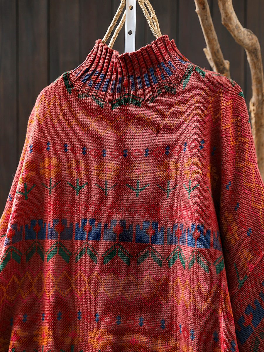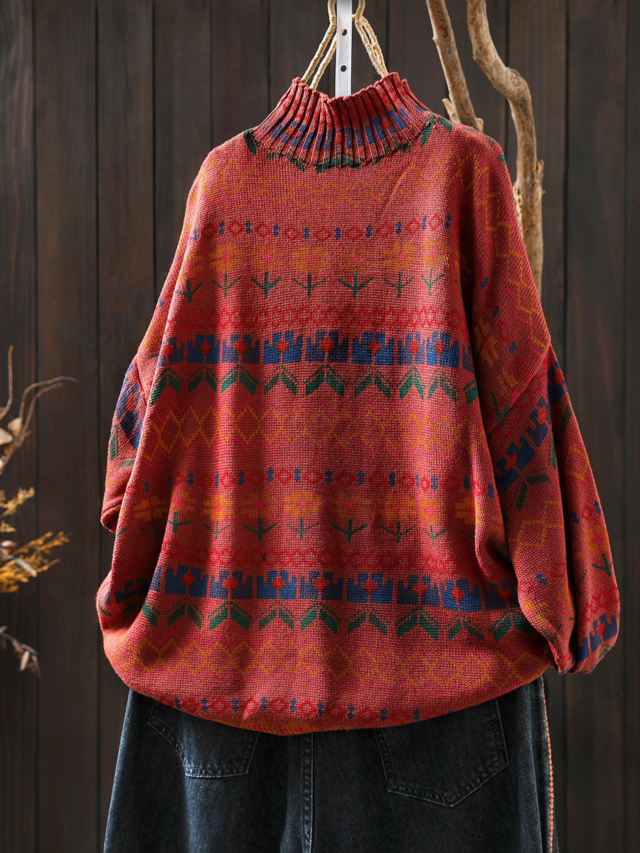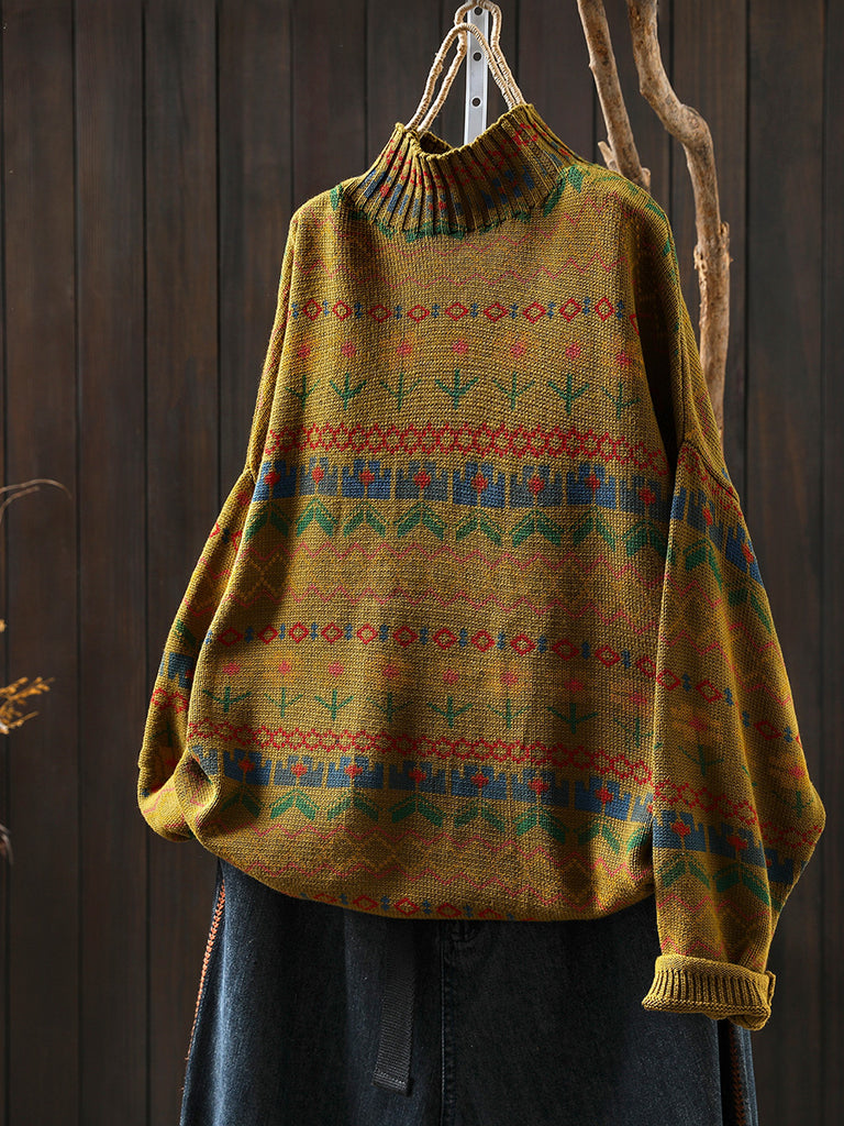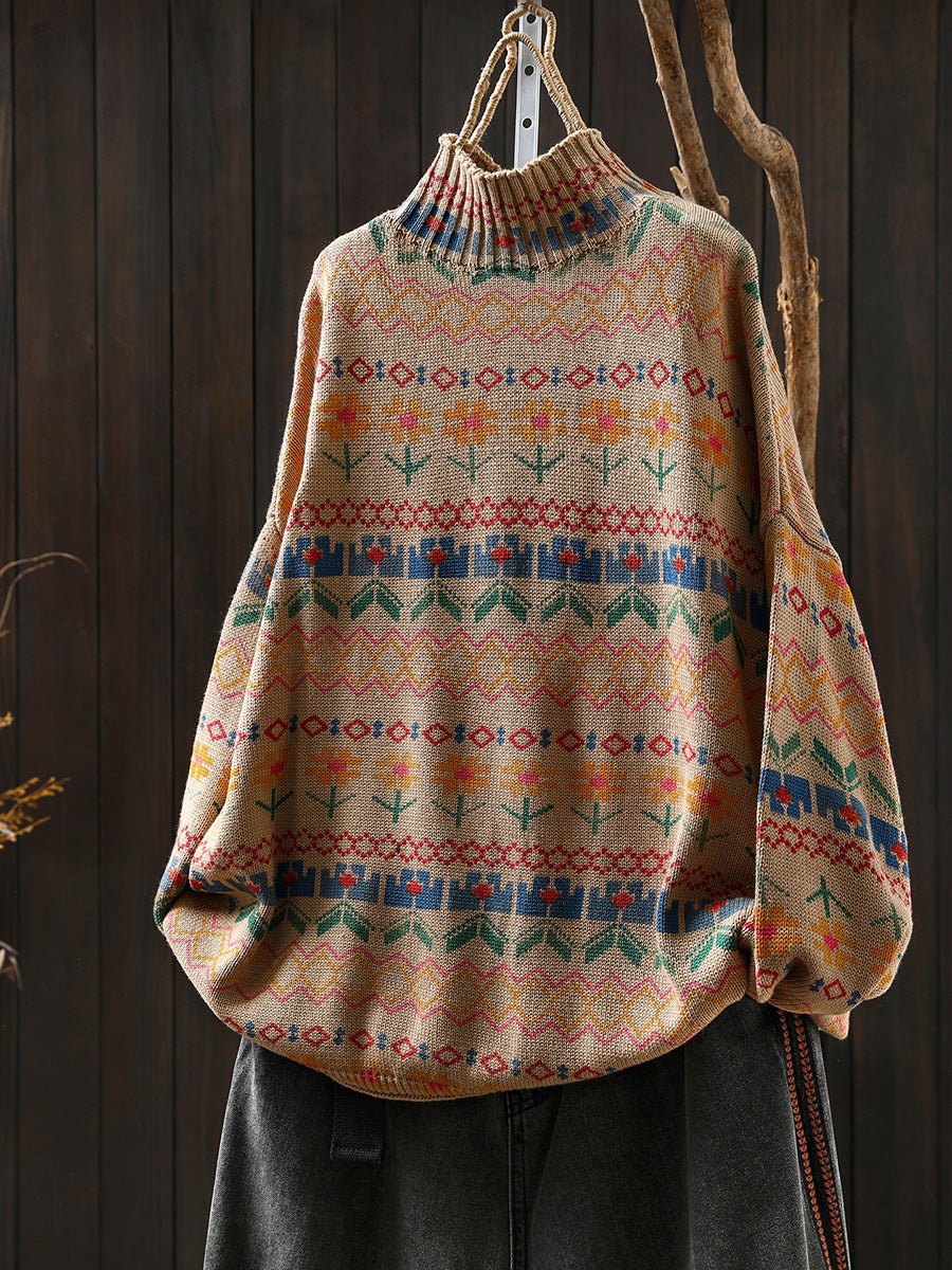 Suéter de cuello alto medio con estampado floral artístico para mujer, ideal para otoño