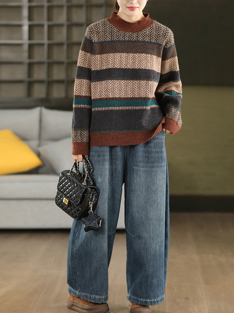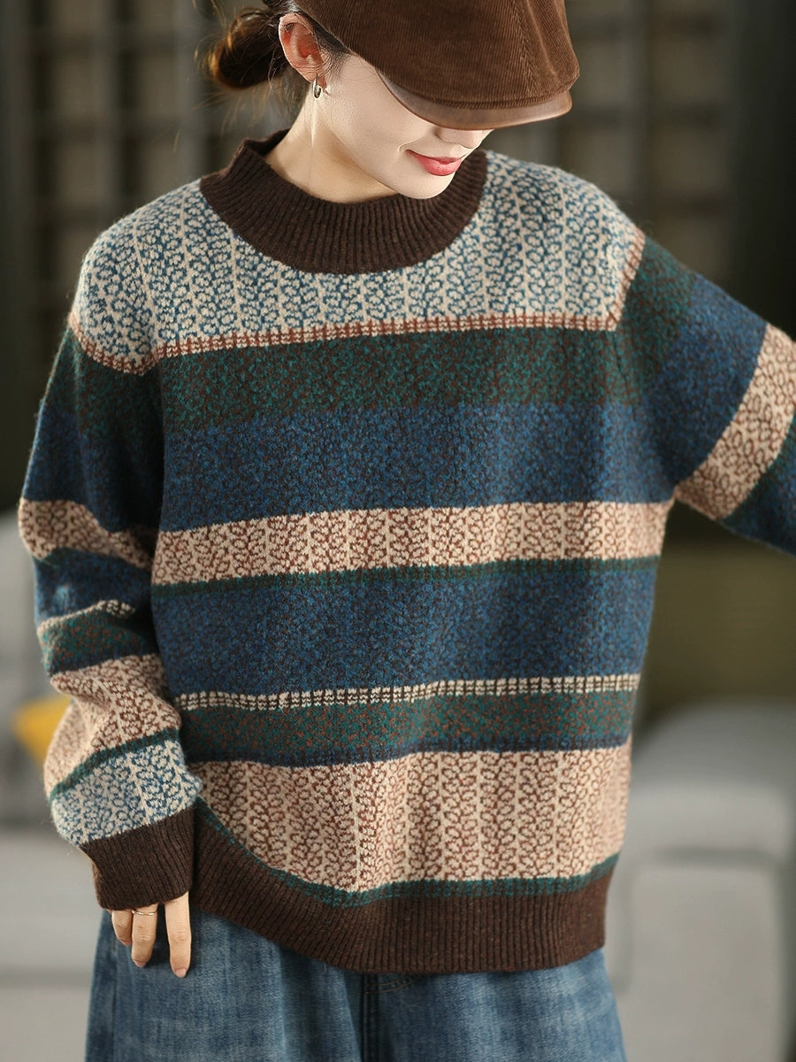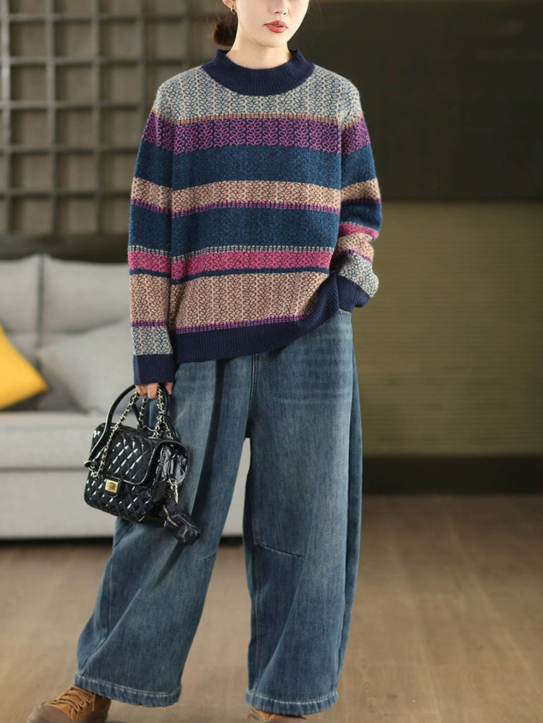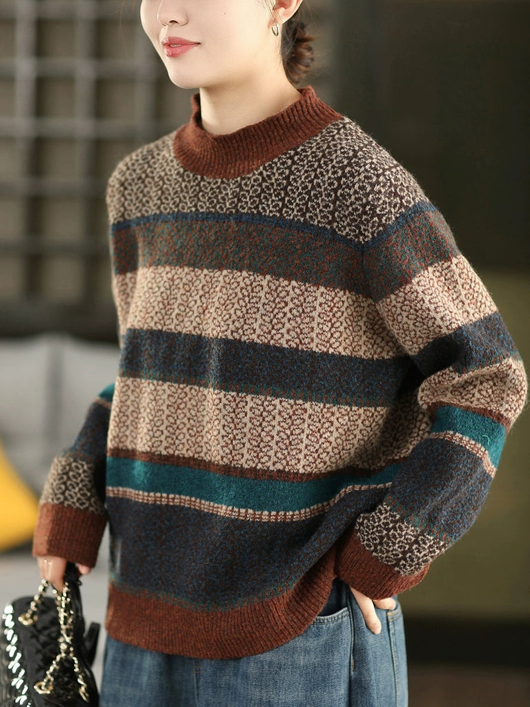 Suéter de cuello alto a rayas artísticas para mujer, estilo otoño