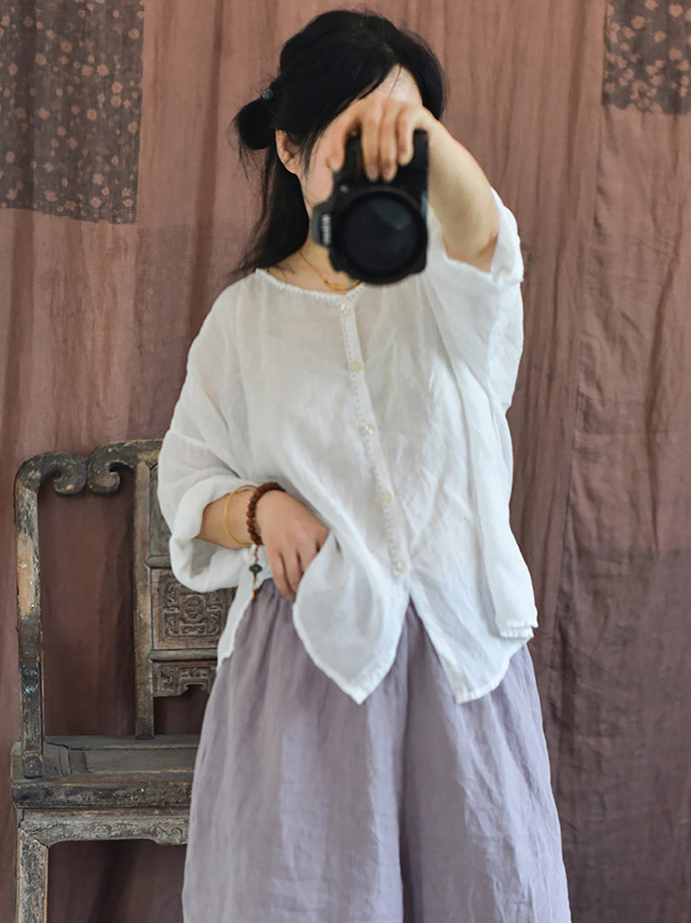 Esta blusa vintage de verano con costuras lisas para mujer presenta un patrón liso. Tiene cuello redondo, mangas raglán largas y un estilo vintage que es perfecto para las temporadas de primavera y verano.