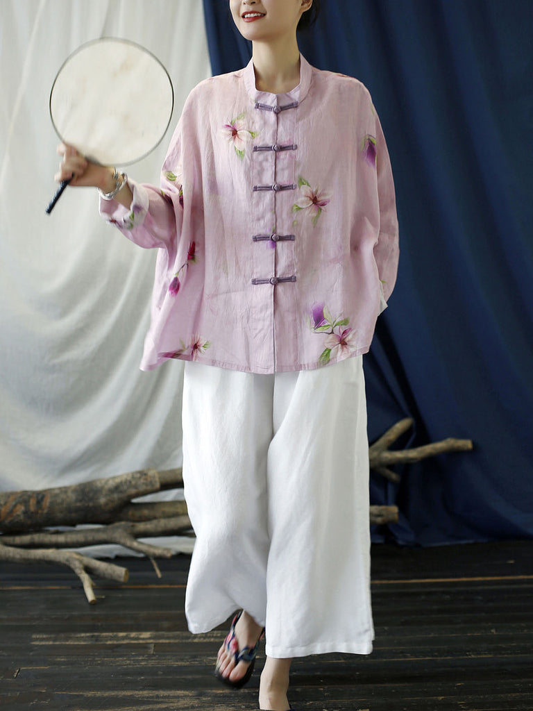 Esta camisa de ramio vintage rosa con flores para mujer está confeccionada en 100 % ramio y presenta un hermoso estampado floral. Tiene cuello alto y mangas raglán largas, perfecta para las temporadas de otoño y primavera. Esta prenda atemporal irradia un estilo vintage que seguramente realzará cualquier atuendo.