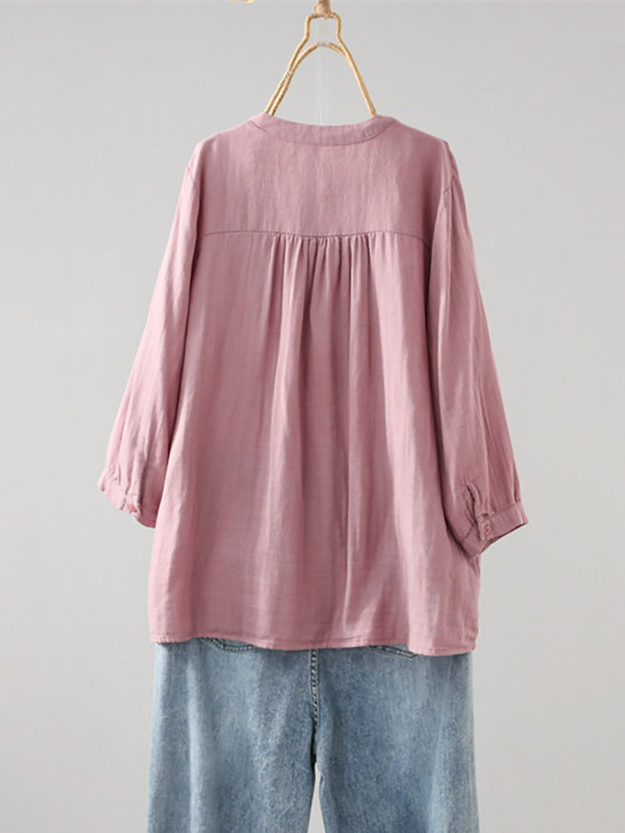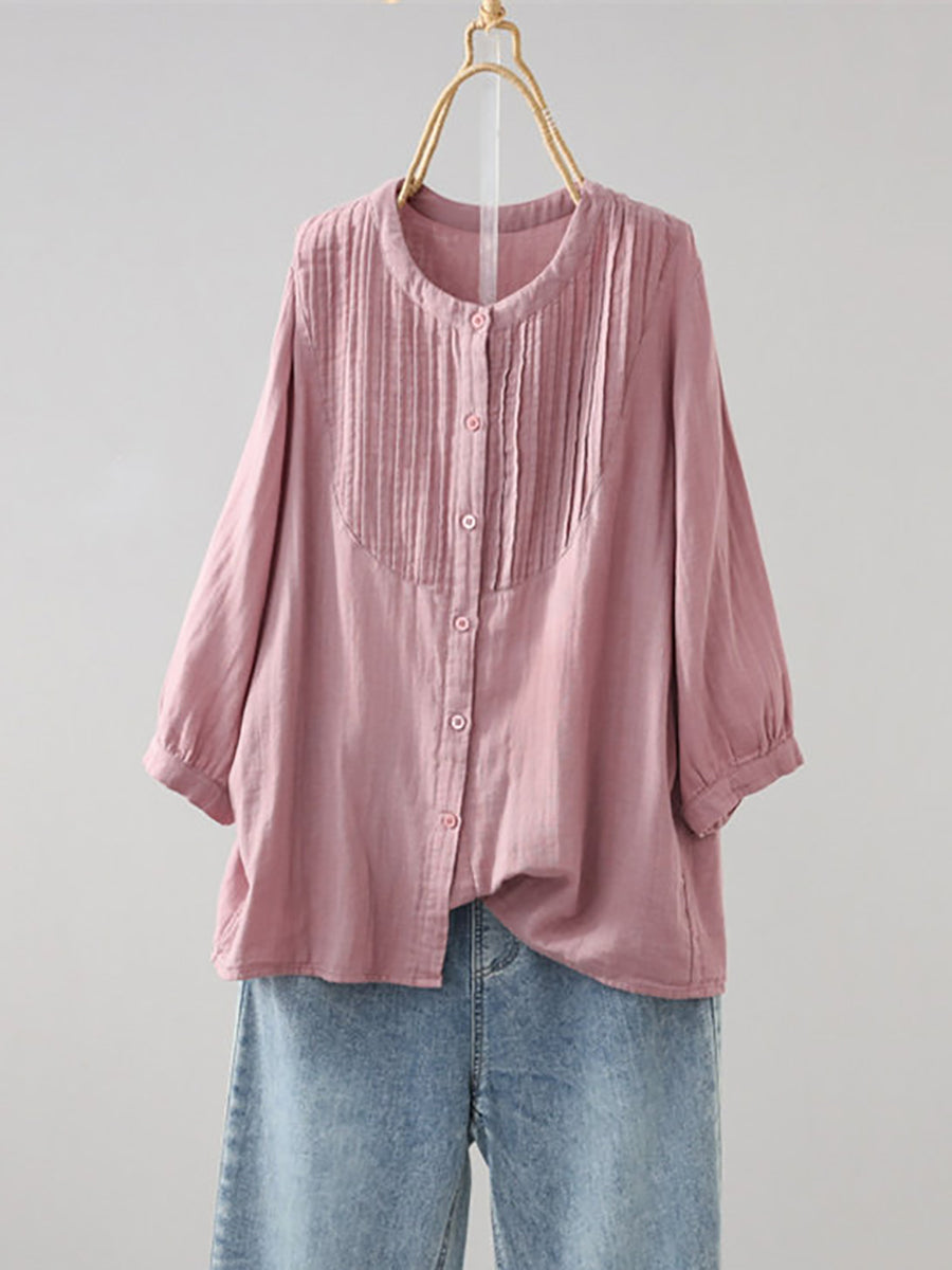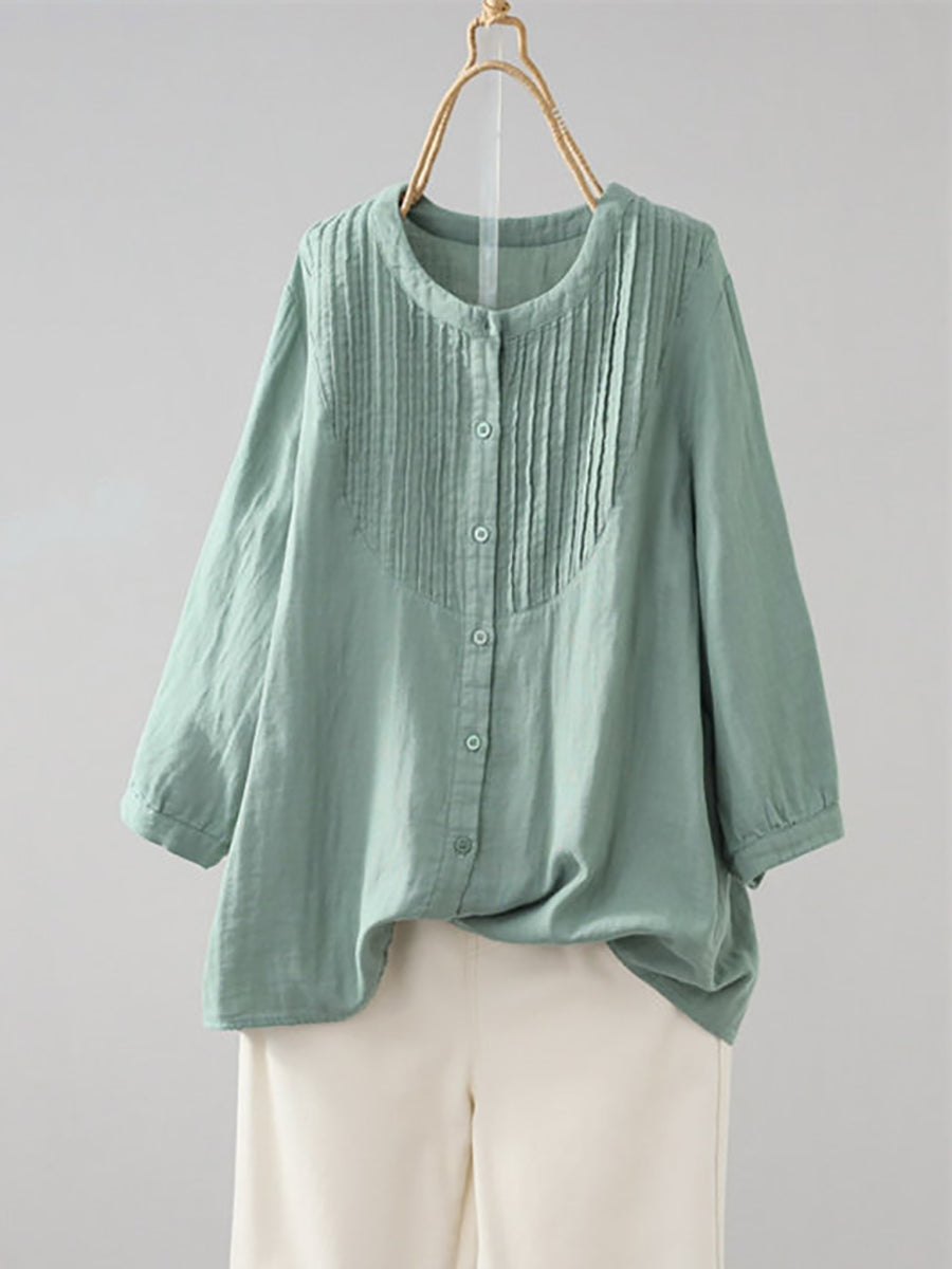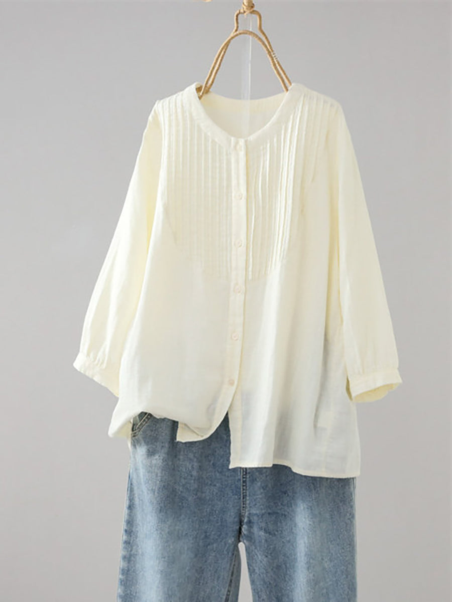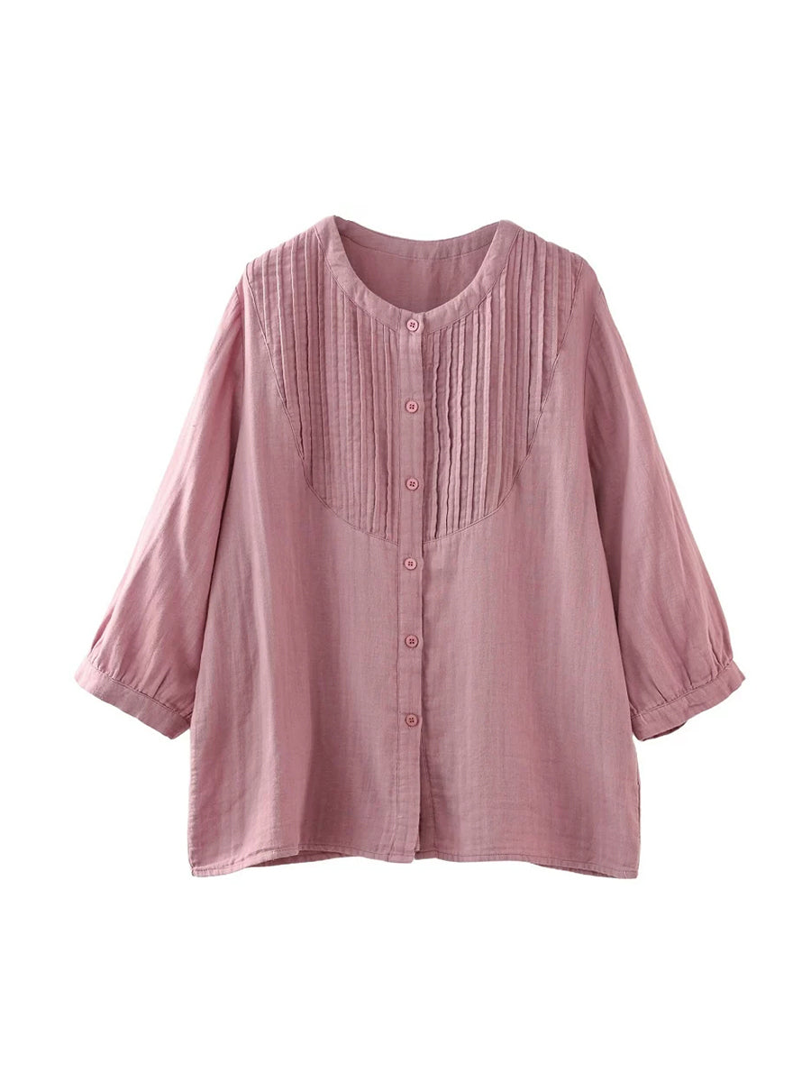 Camisa de verano para mujer, estilo artístico, color liso, fruncida, cuello redondo.