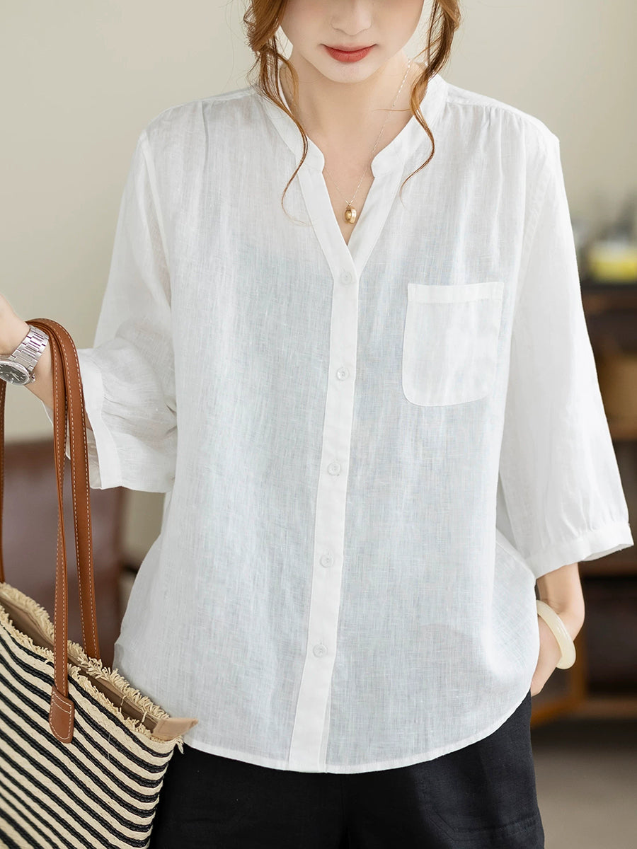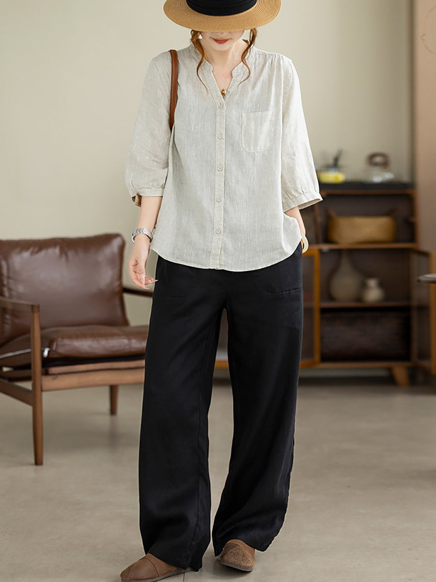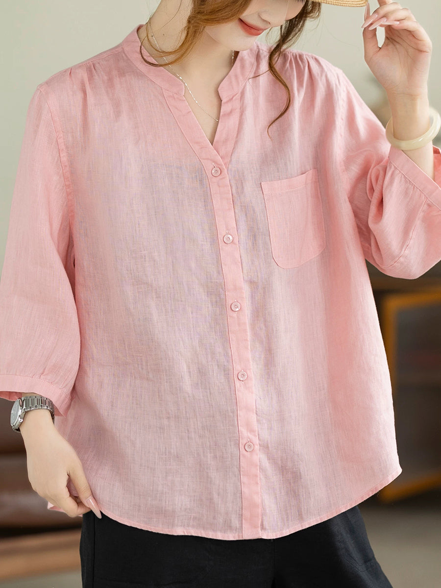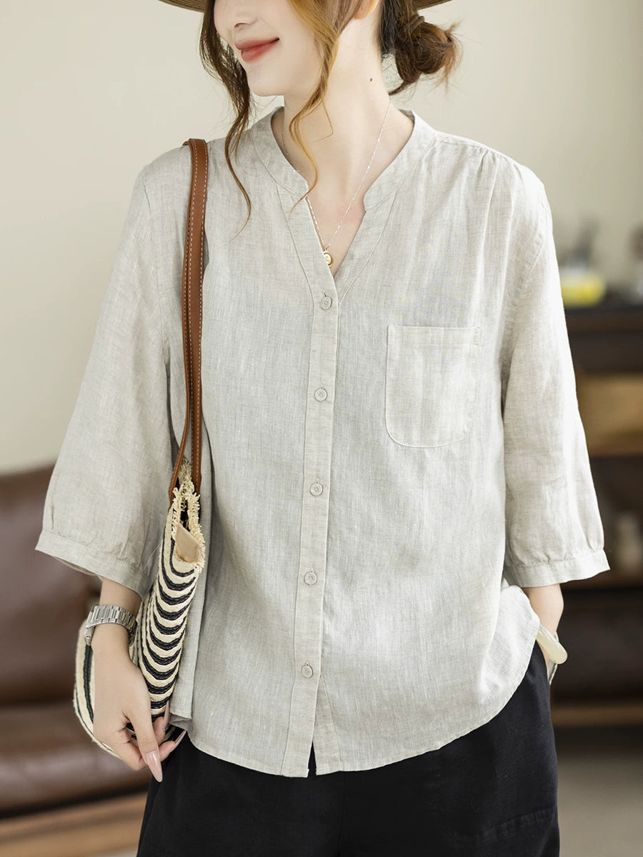 Camisa de mujer de verano, estilo artístico, color liso, cuello en V, 100% lino.