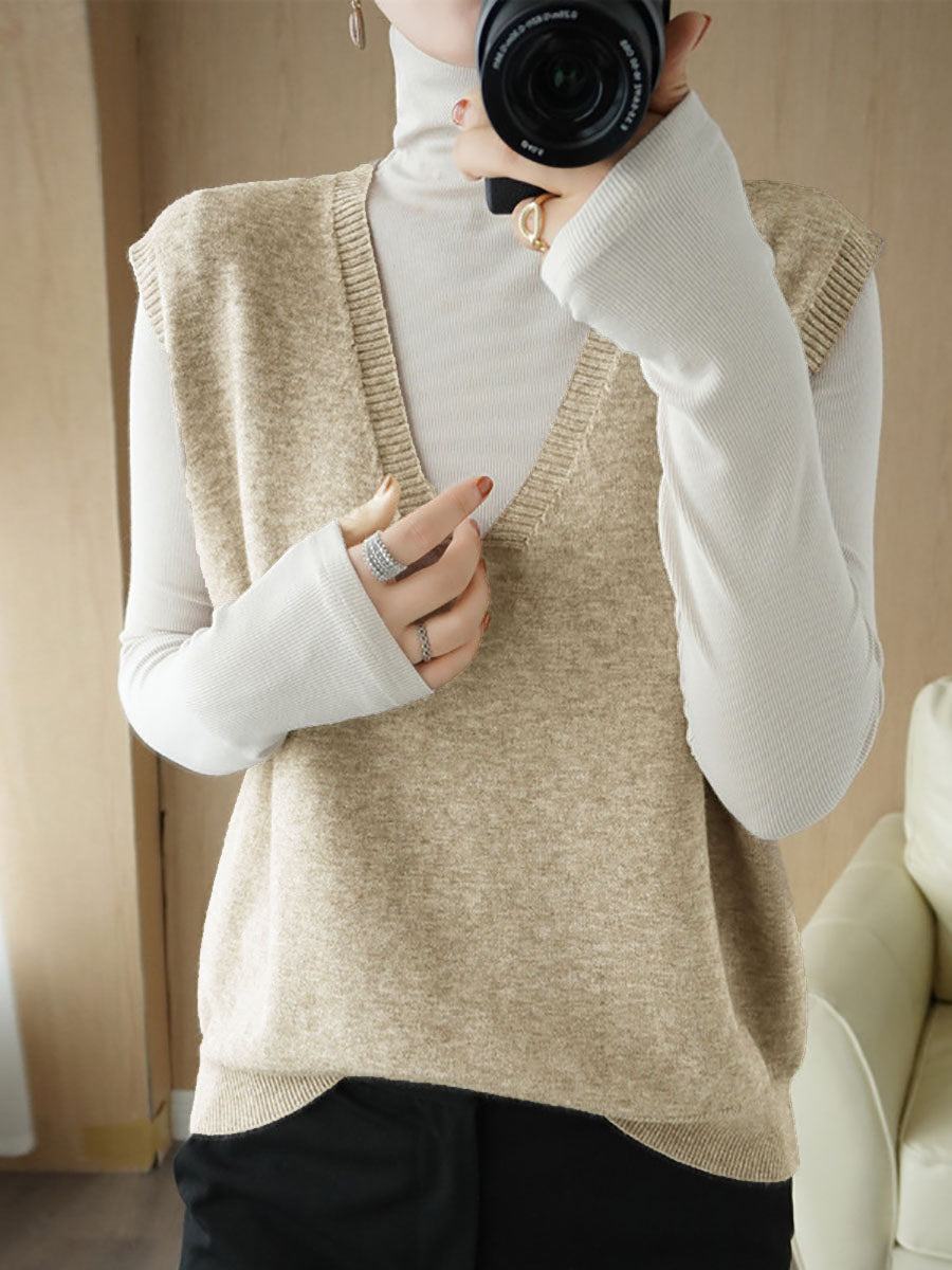 Chaleco de punto con cuello en V de lana para mujer, informal, de otoño