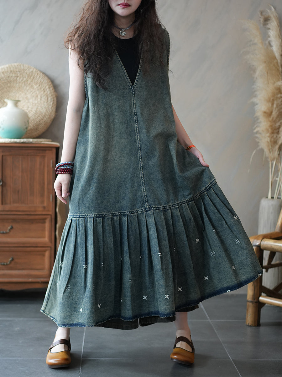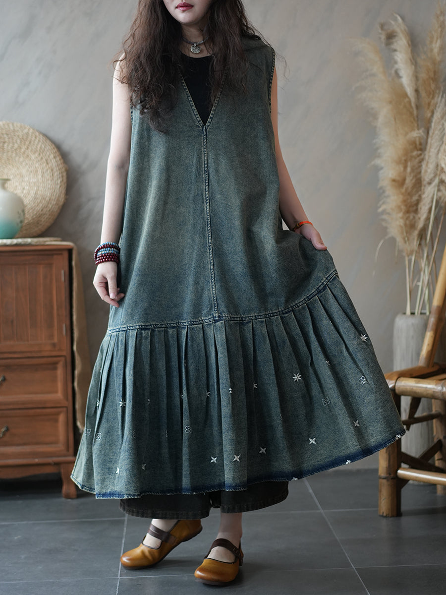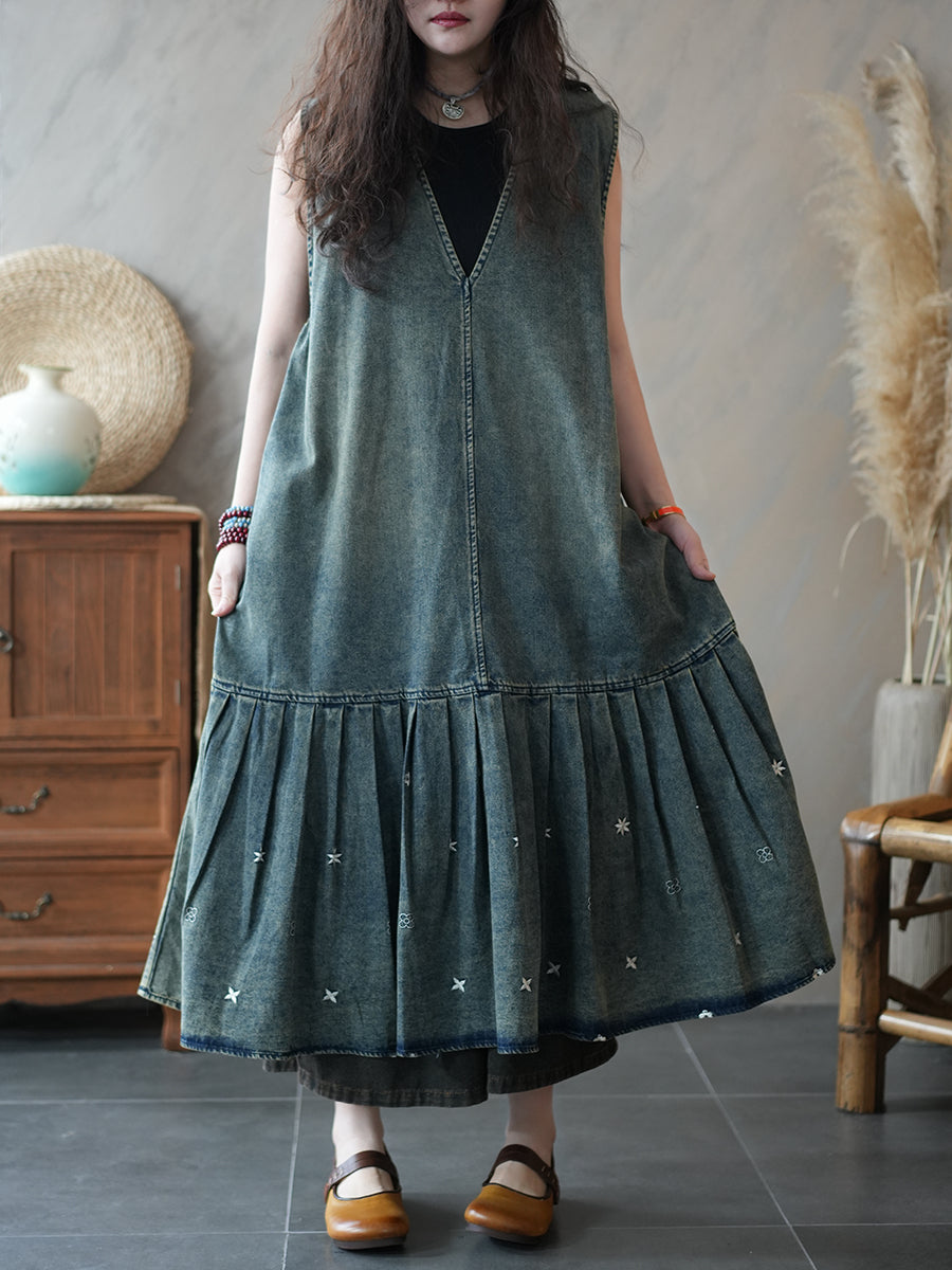 Vestido plisado de mezclilla estilo vintage de verano para mujer