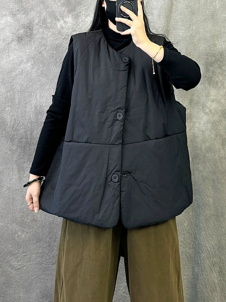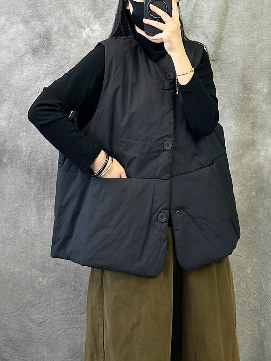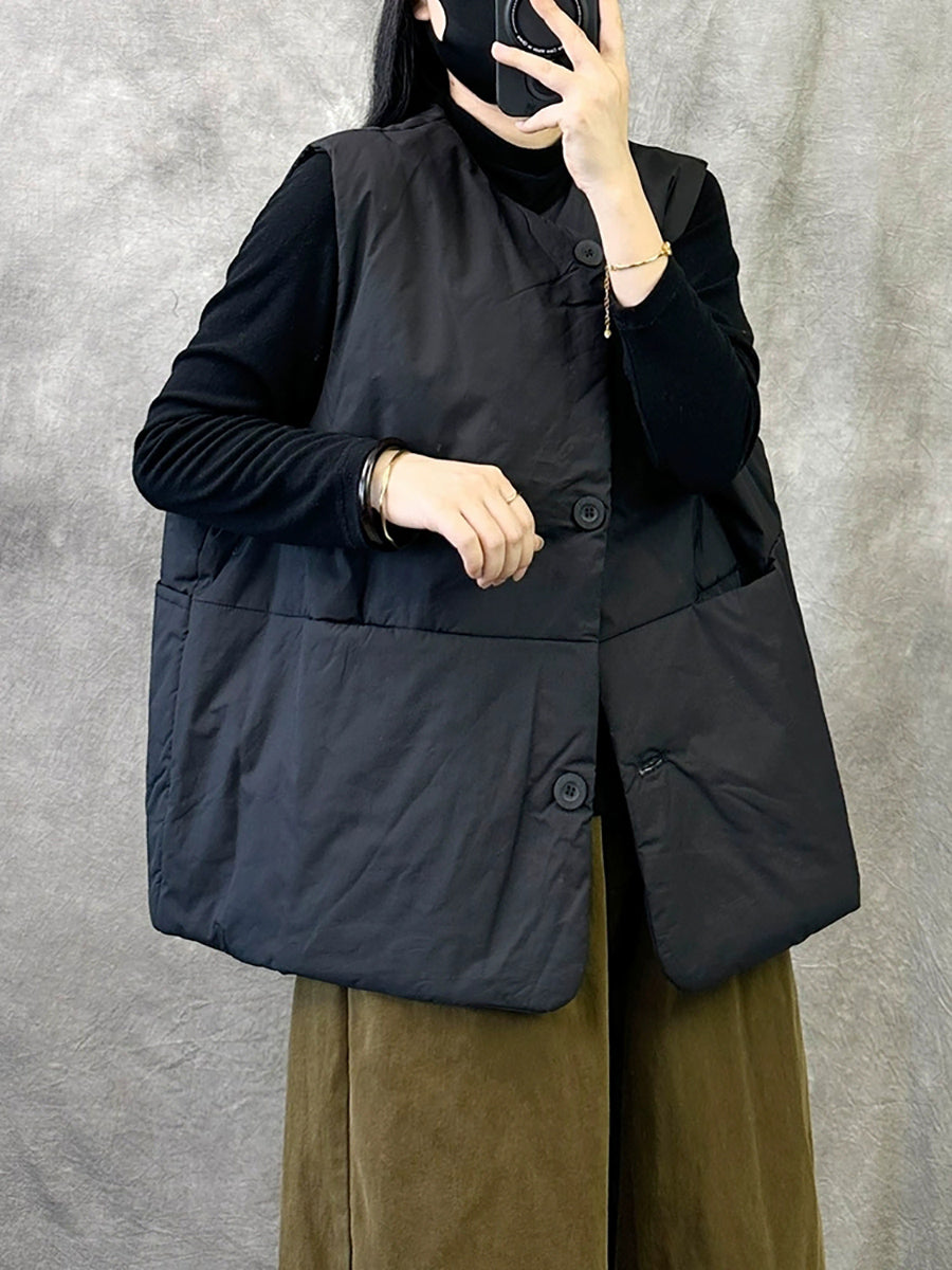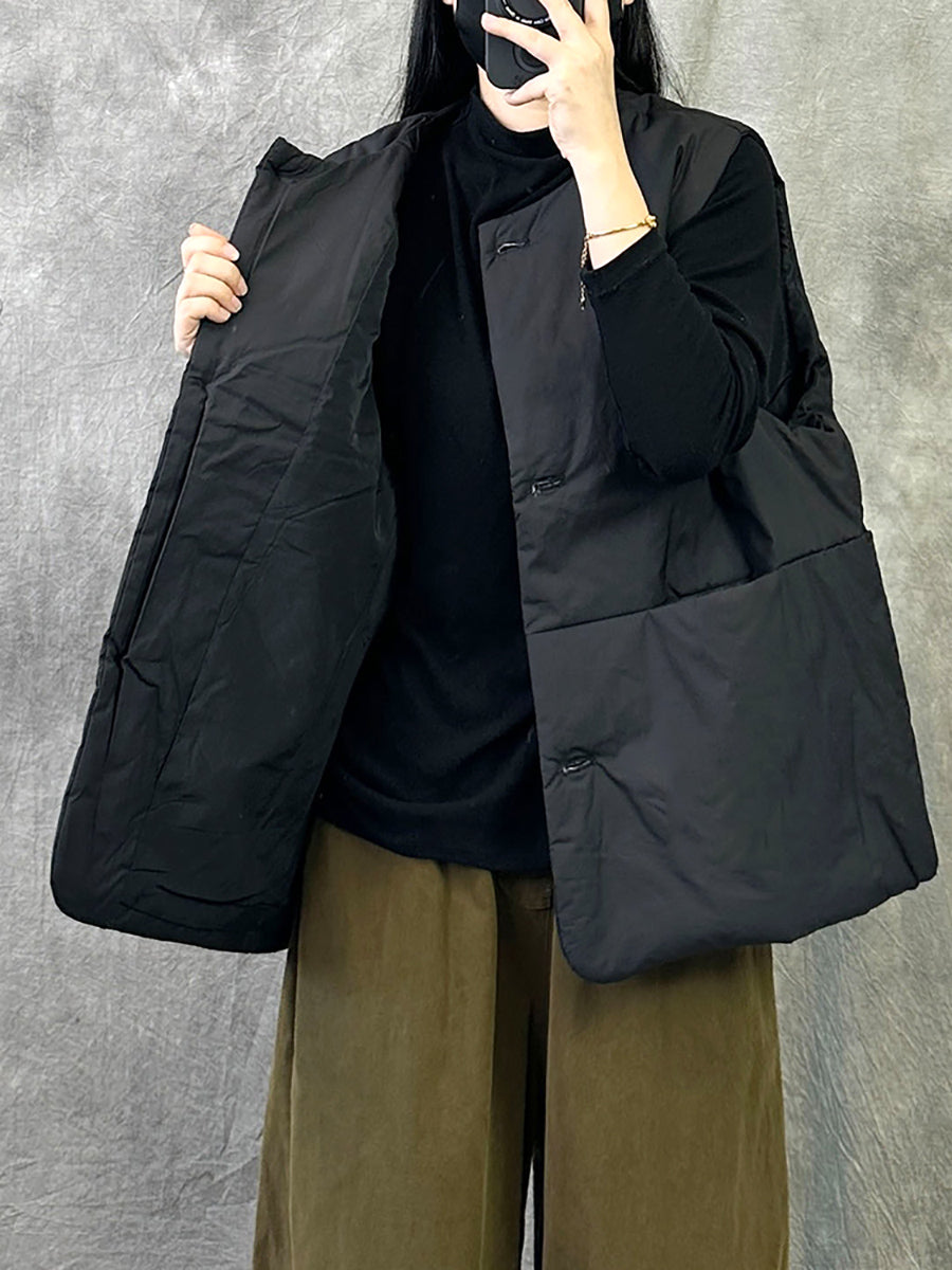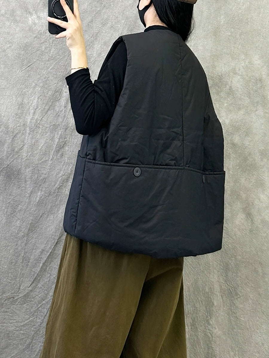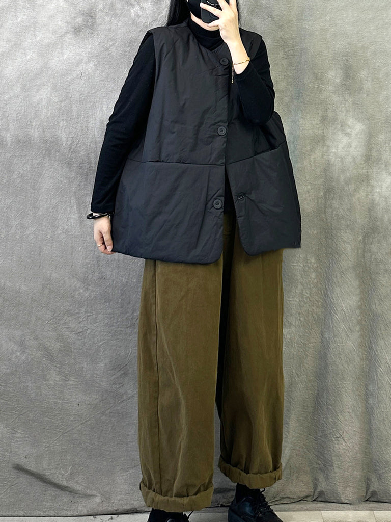 Confeccionado en algodón de alta calidad, este chaleco acolchado y versátil proporciona la calidez esencial para las temporadas de entretiempo. Su diseño minimalista de color liso y su corte holgado de cuello redondo lo convierten en una prenda fácil de combinar que complementa cualquier armario informal. Ideal para otoño e invierno, combina un aislamiento térmico práctico con una sofisticación discreta.