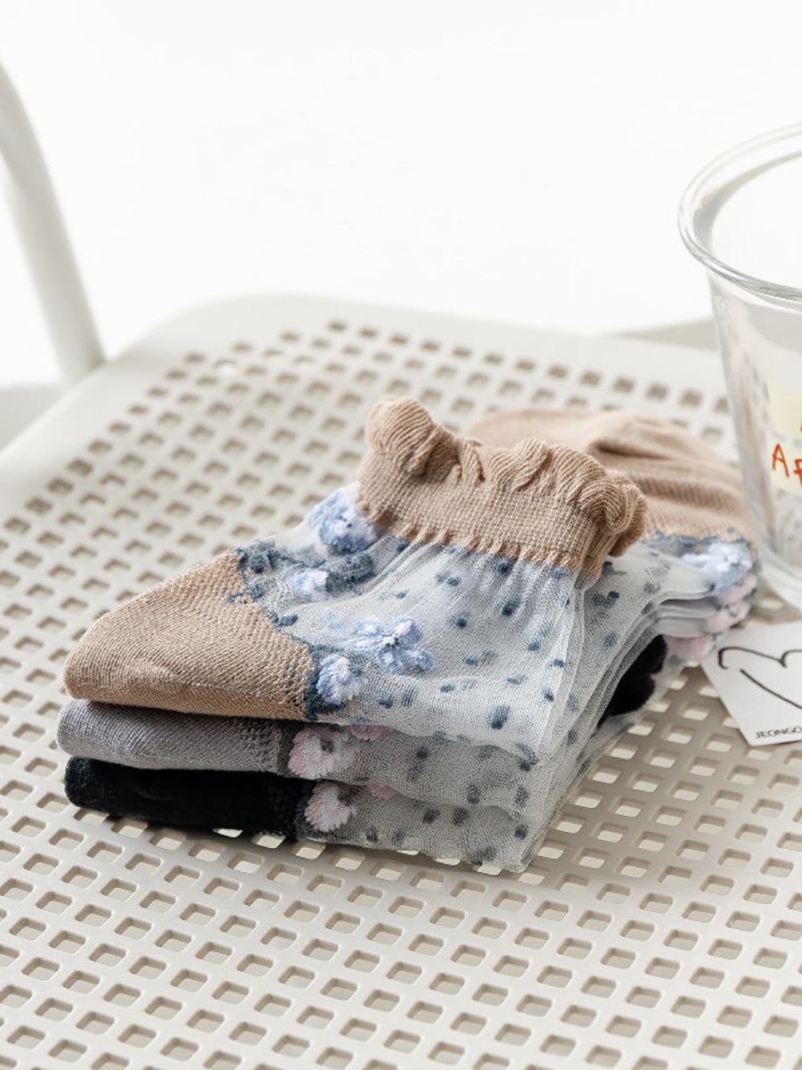 3 pares de calcetines de encaje jacquard con flores artísticas para mujer