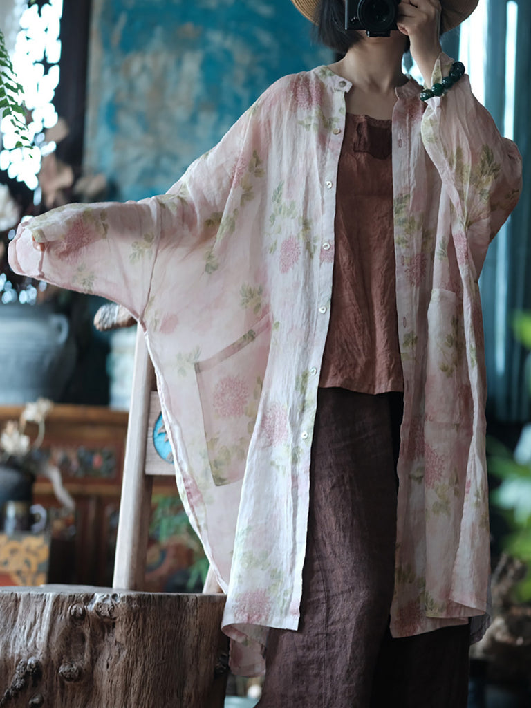 Camisa fina larga de ramio con flores vintage de verano para mujer
