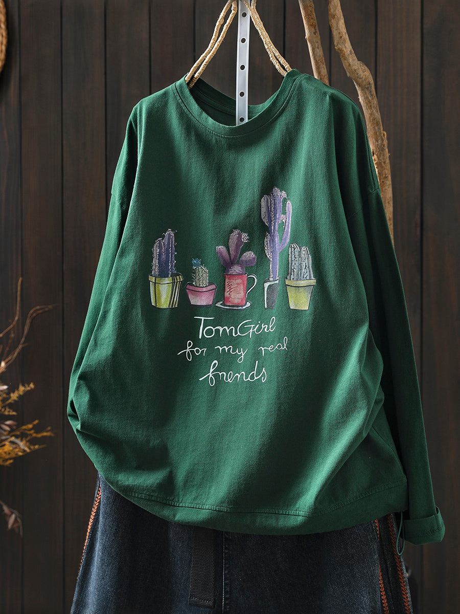 Women Artsy Spring Potted Plant Cotton O-Neck Blouse