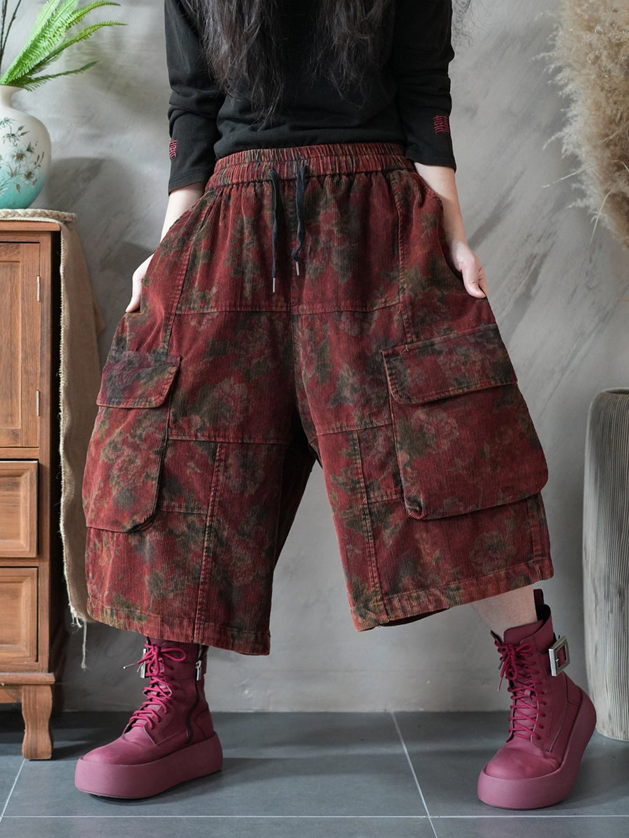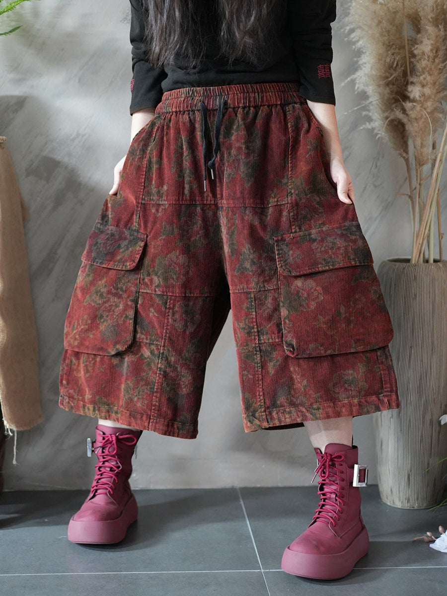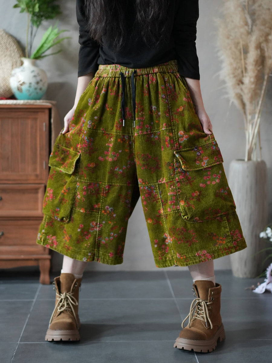 Women Spring Flower Corduroy Wide-leg Cropped Pants