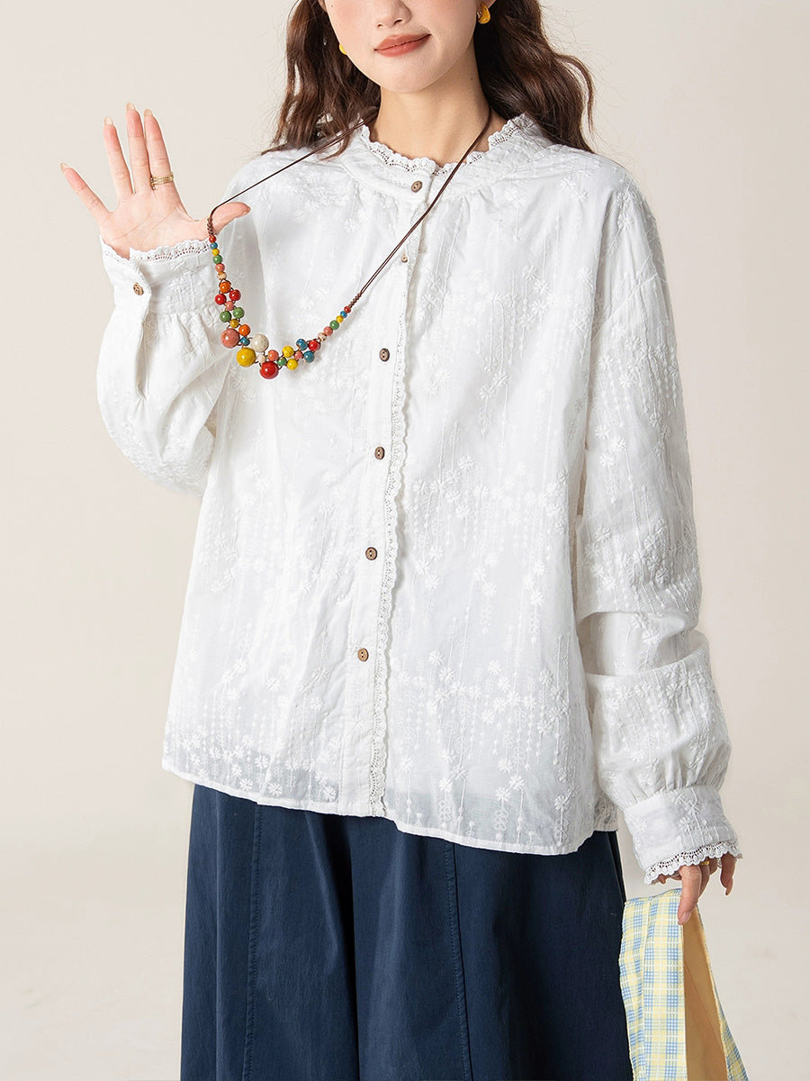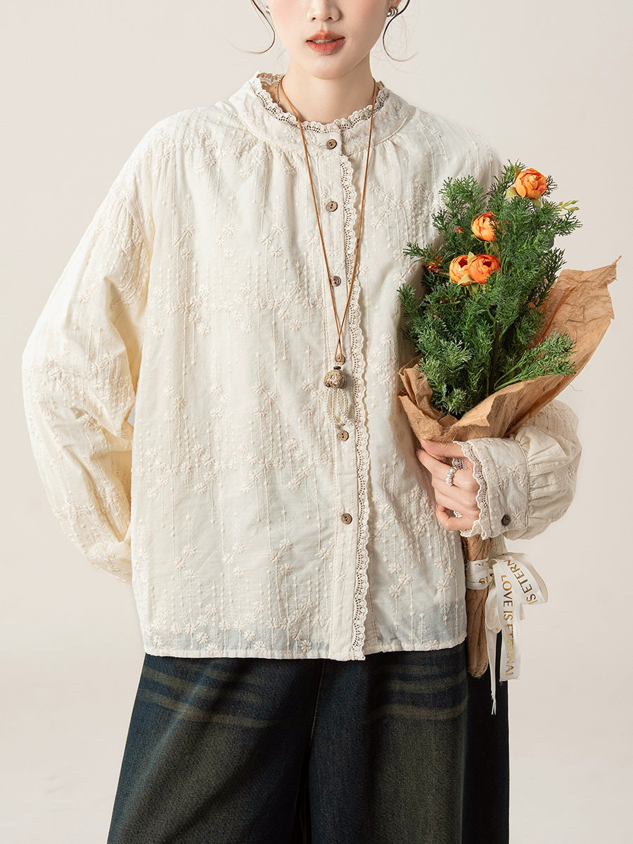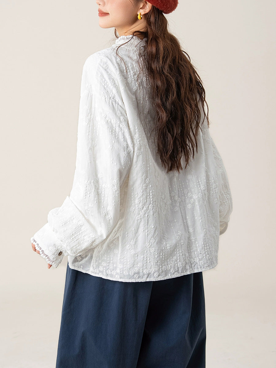 Women Artsy Autumn Embroidery Stand Collar Shirt