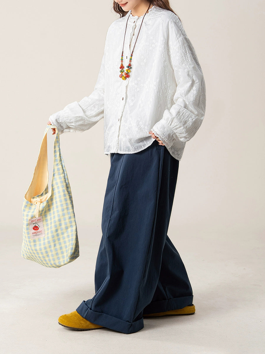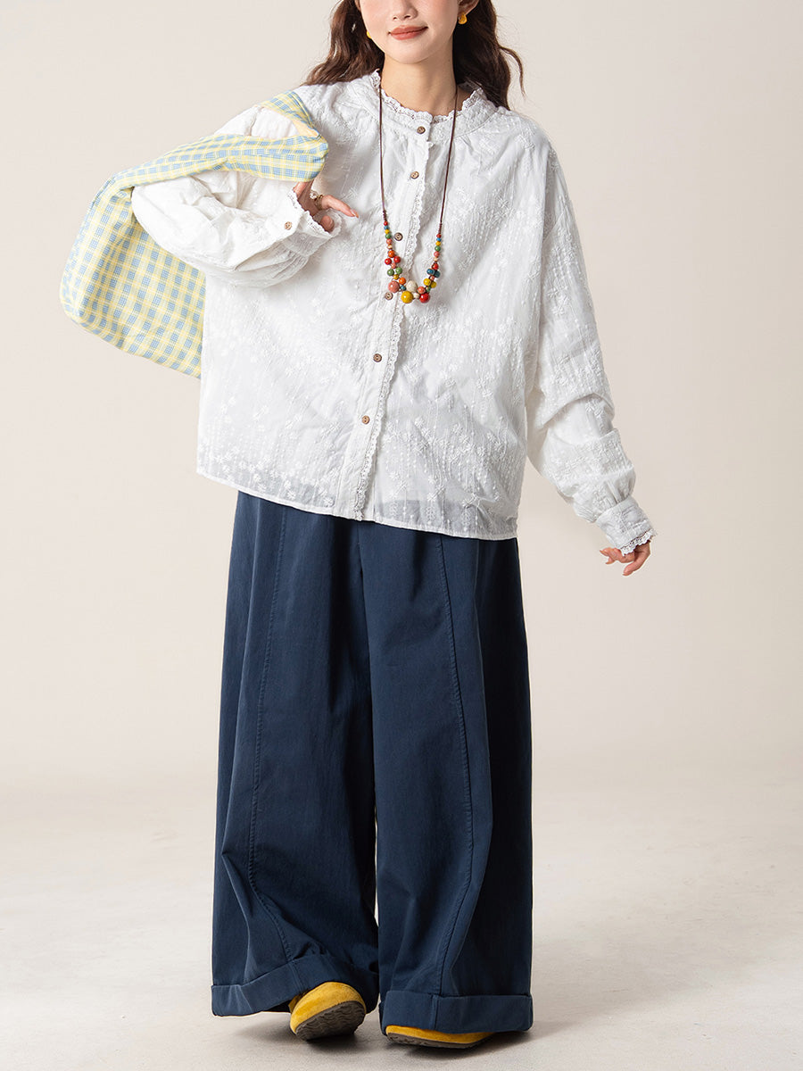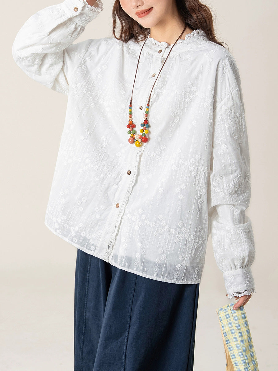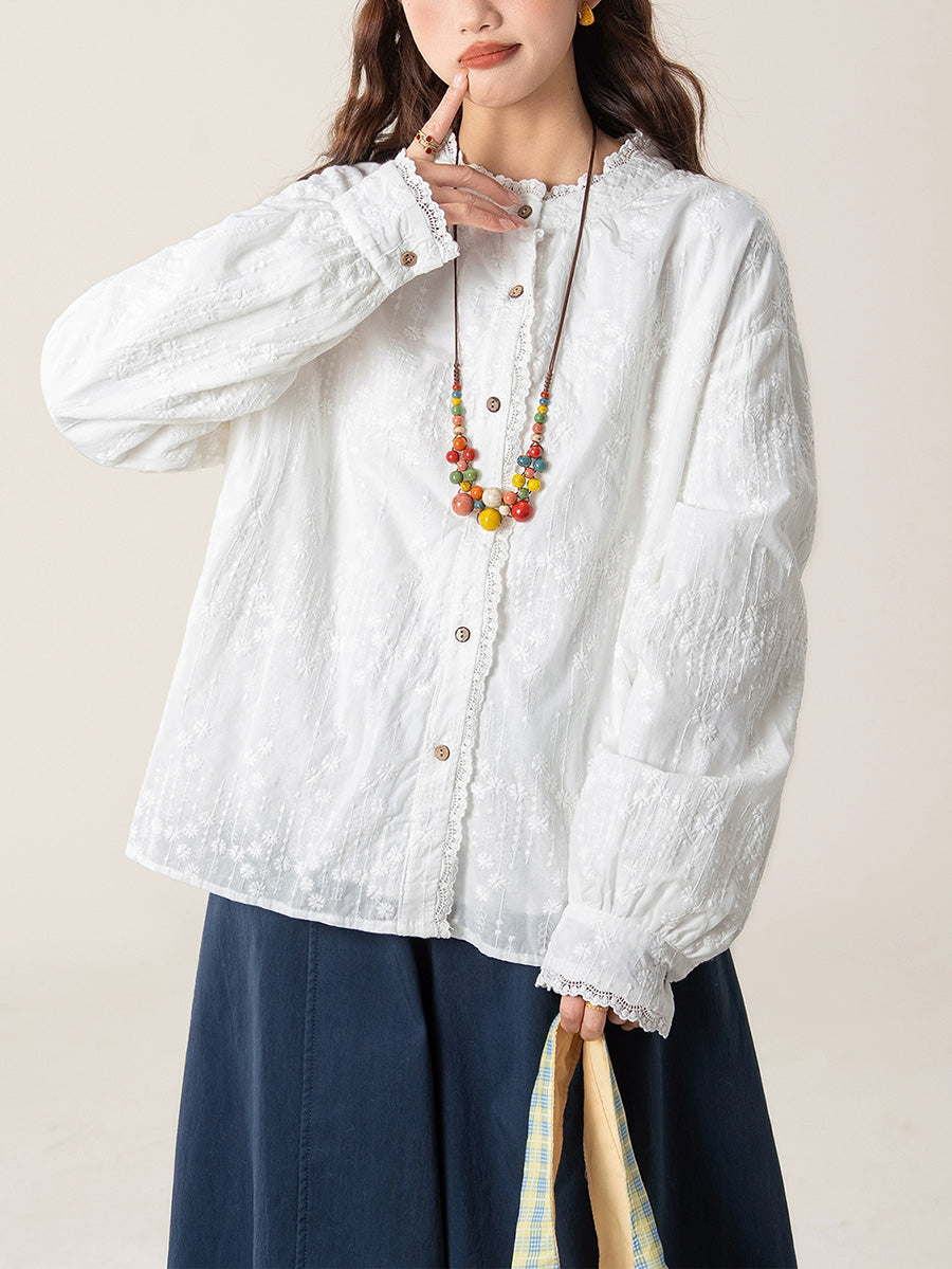 Women Artsy Autumn Embroidery Stand Collar Shirt