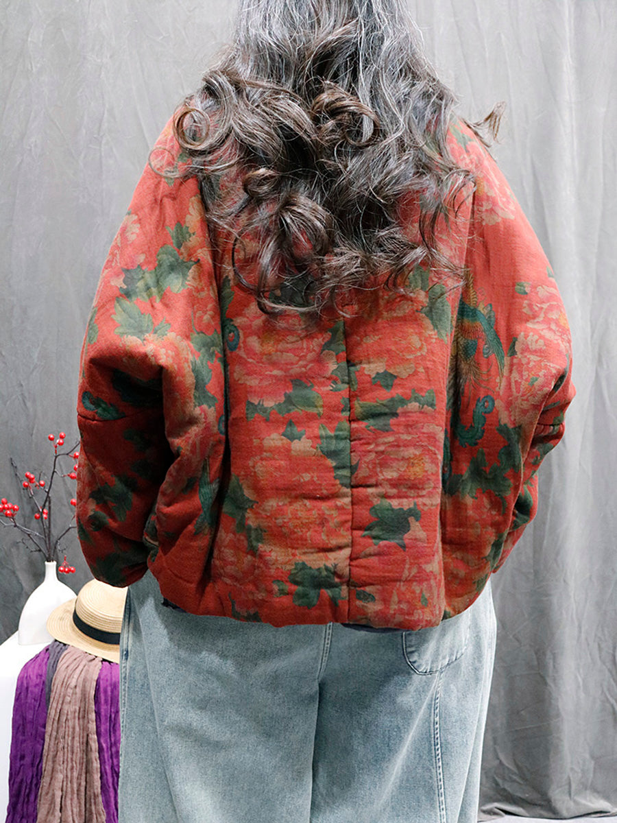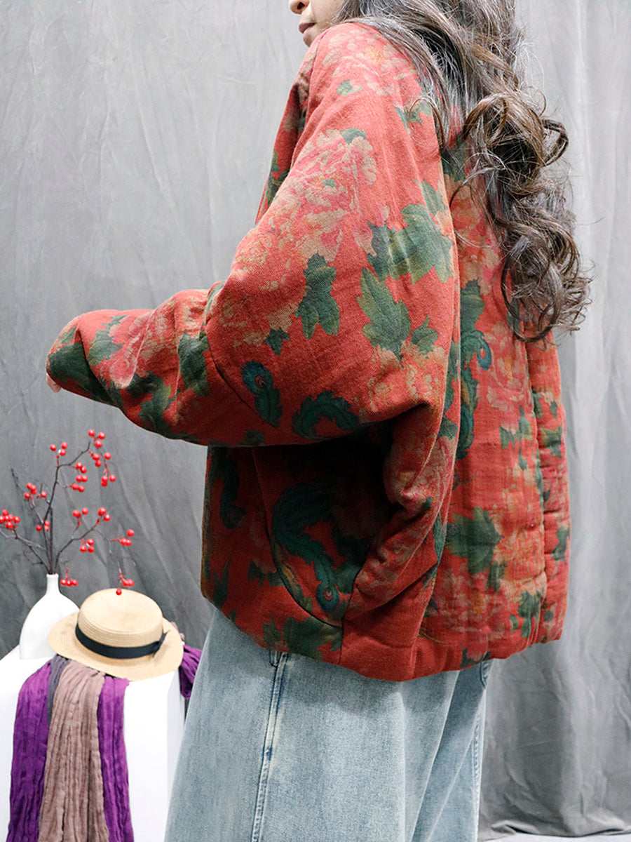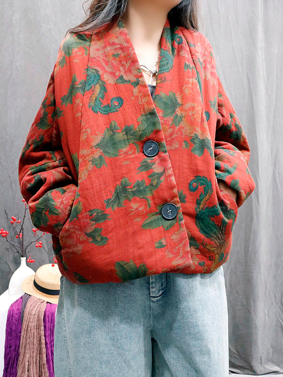 Women Retro Flower 100%Cotton V-Neck Padded Coat