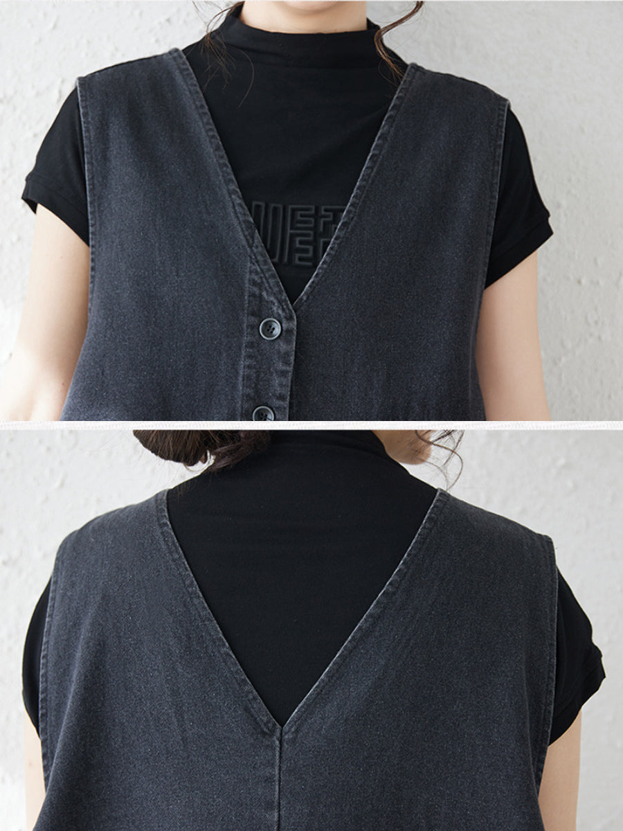 Women Spring Casual Pure Color Denim V-Neck Dress