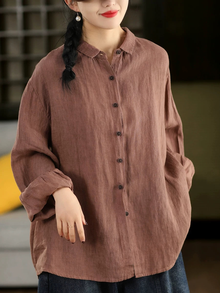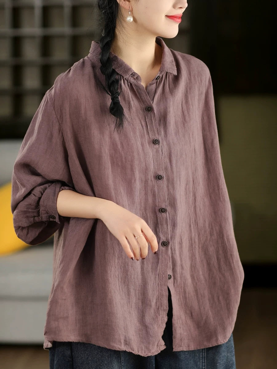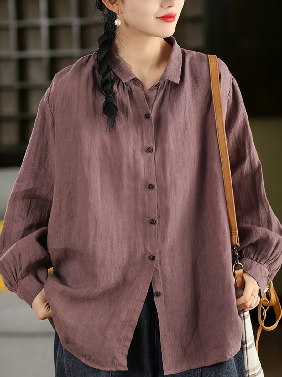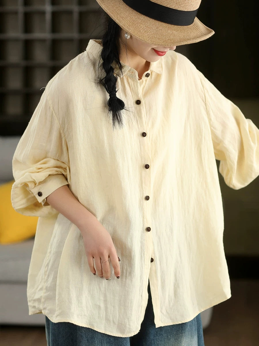 Women Spring Artsy Pure Color 100%Linen Turn-down Collar Shirt