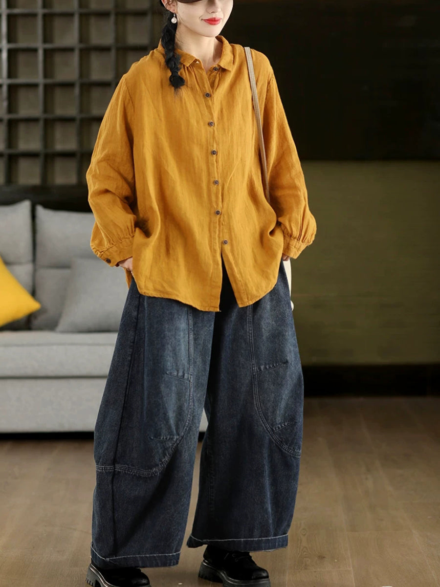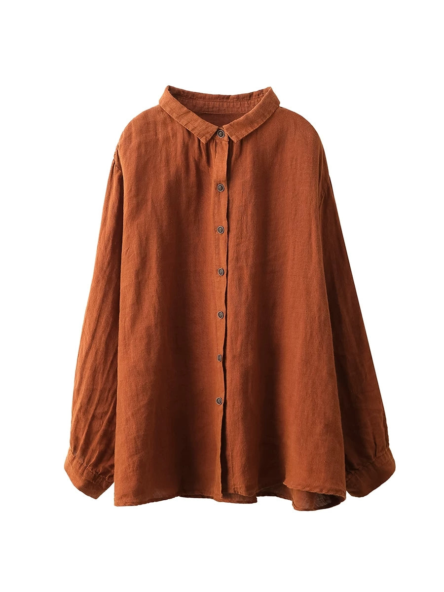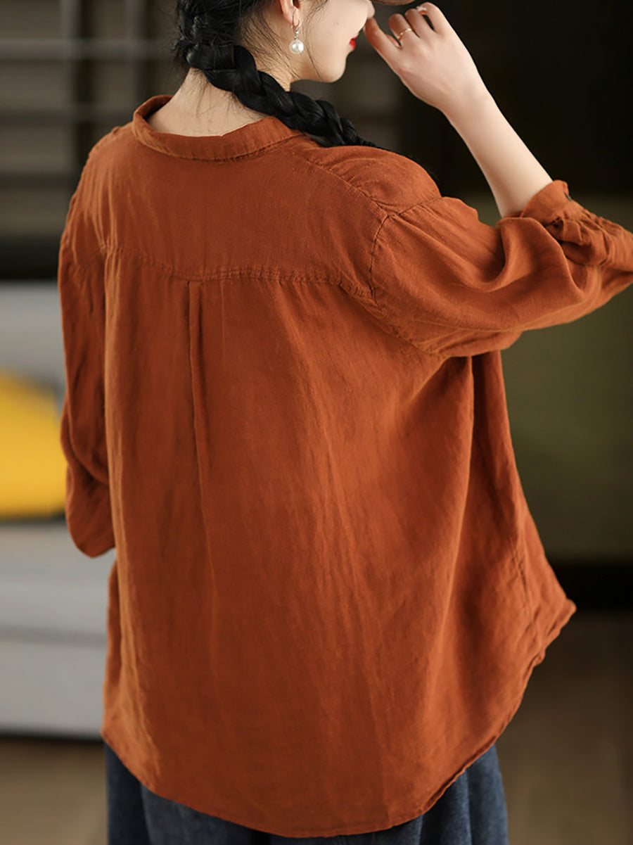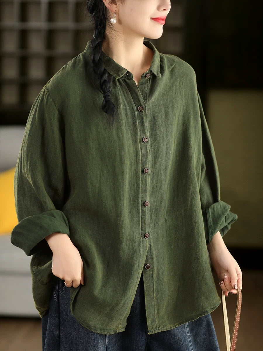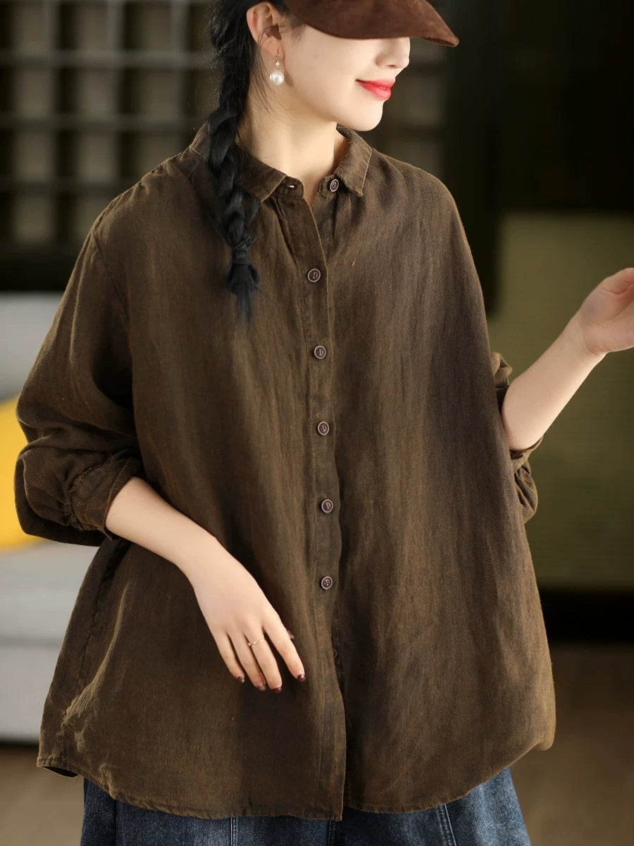 Women Spring Artsy Pure Color 100%Linen Turn-down Collar Shirt