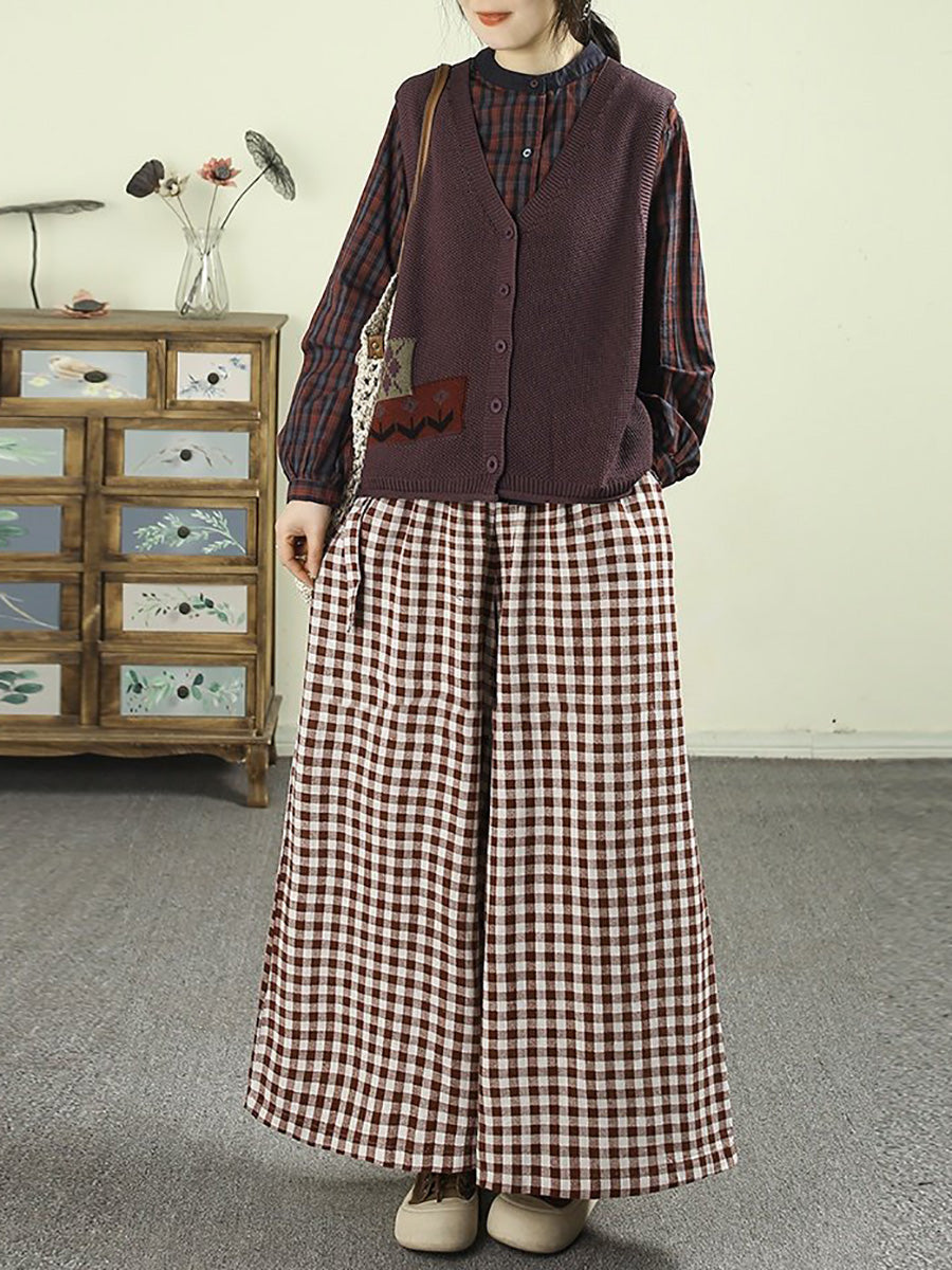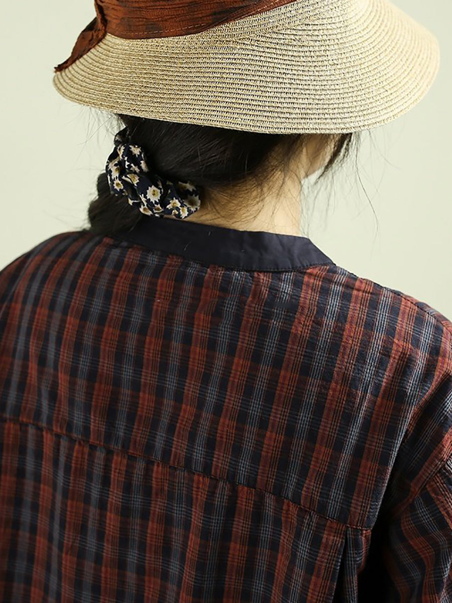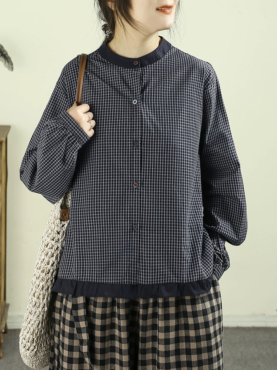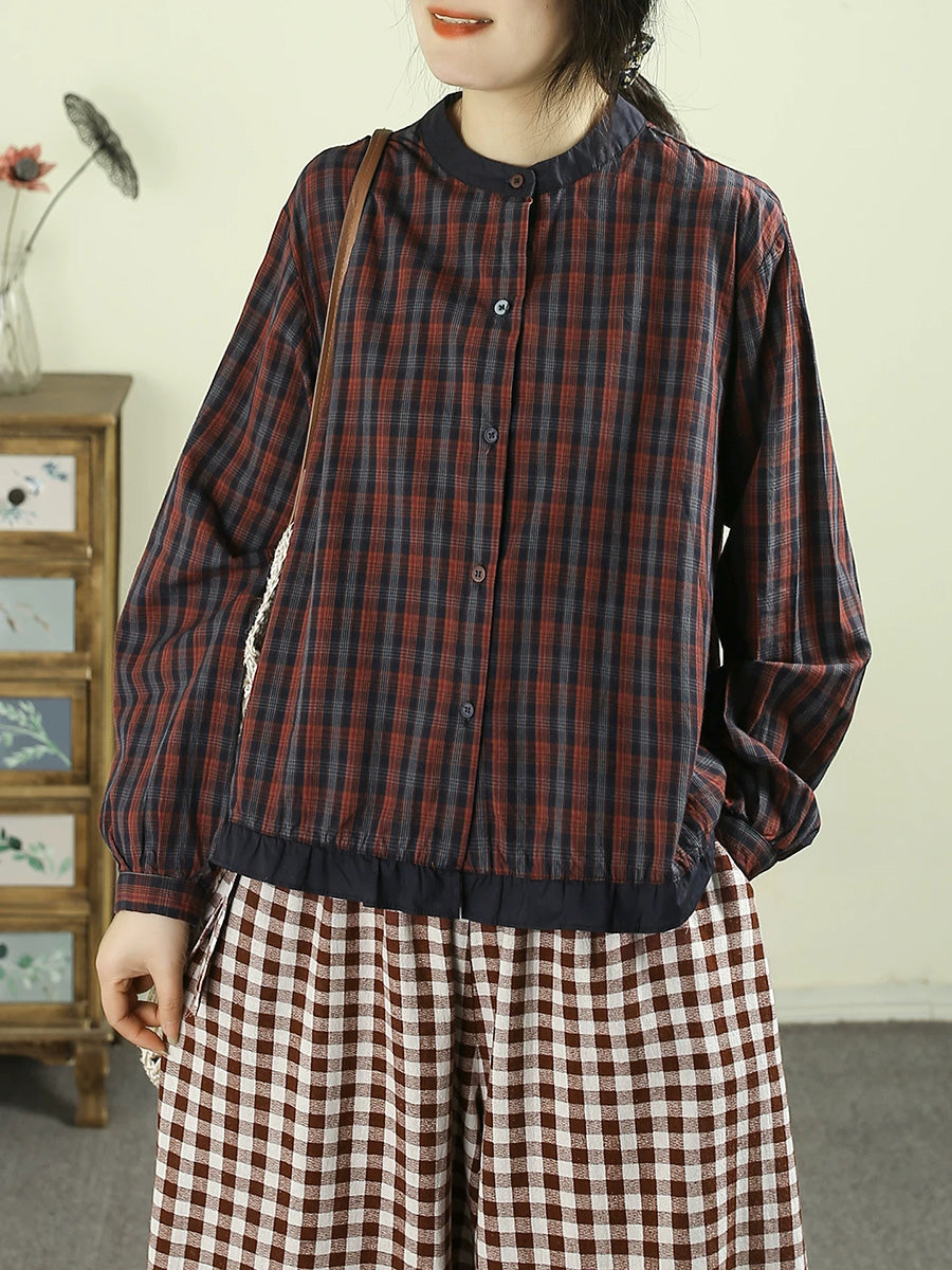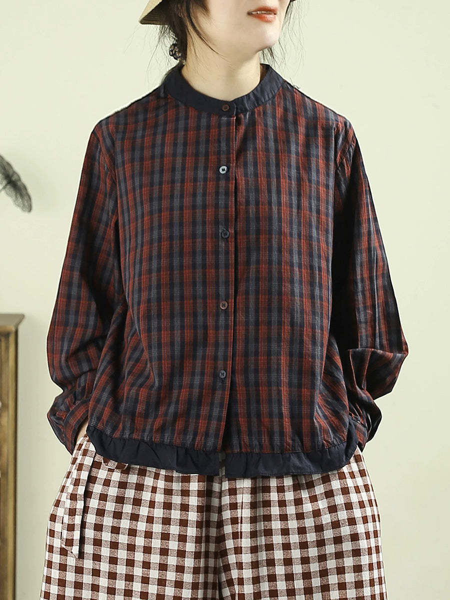 Women Spring Retro Plaid 100%Cotton Stand Collar Shirt