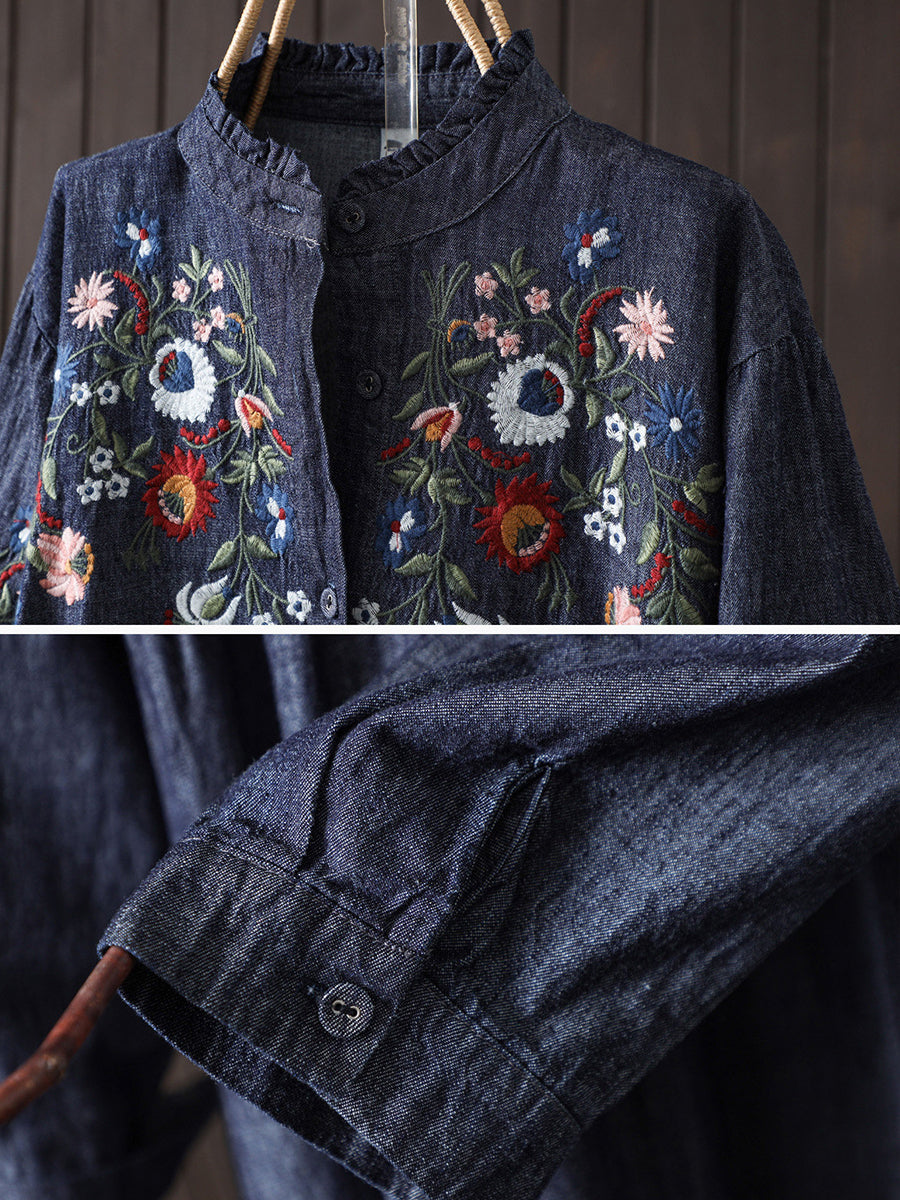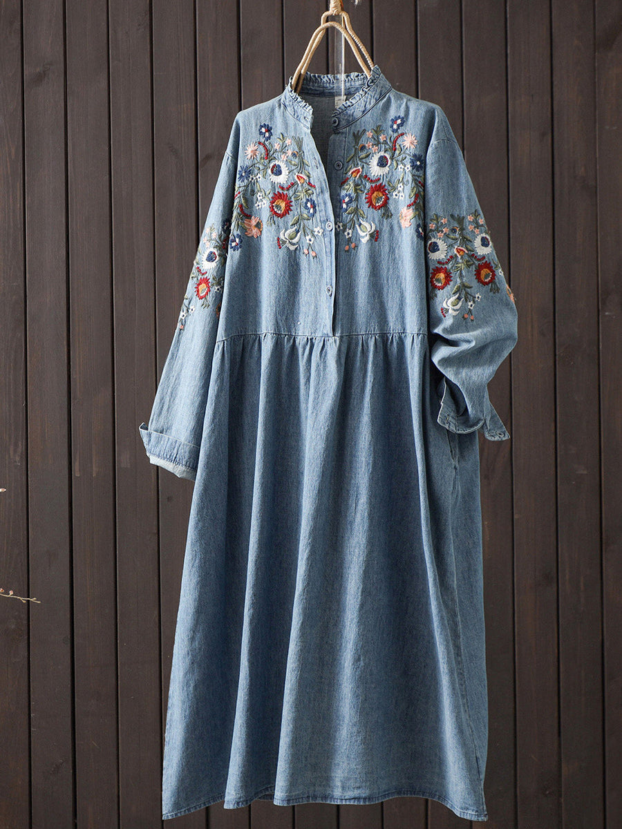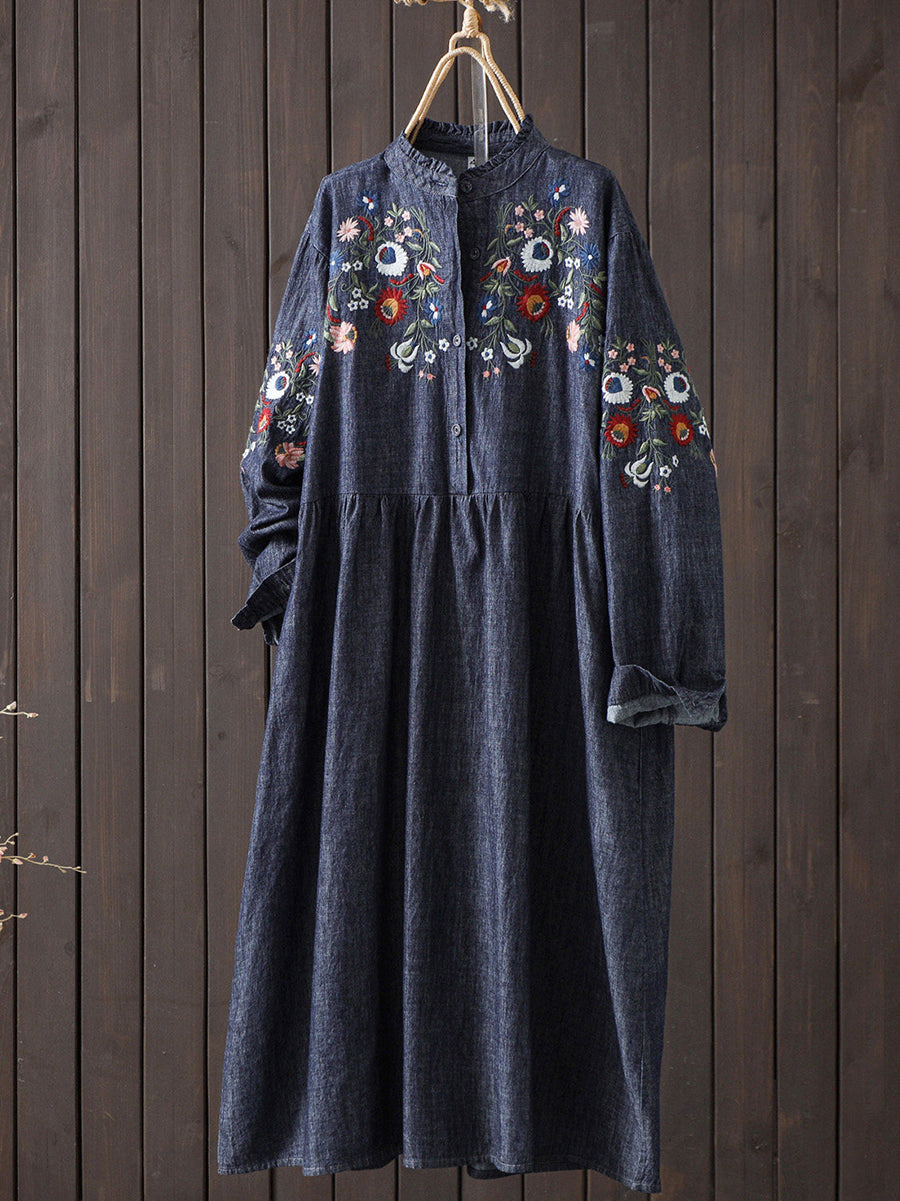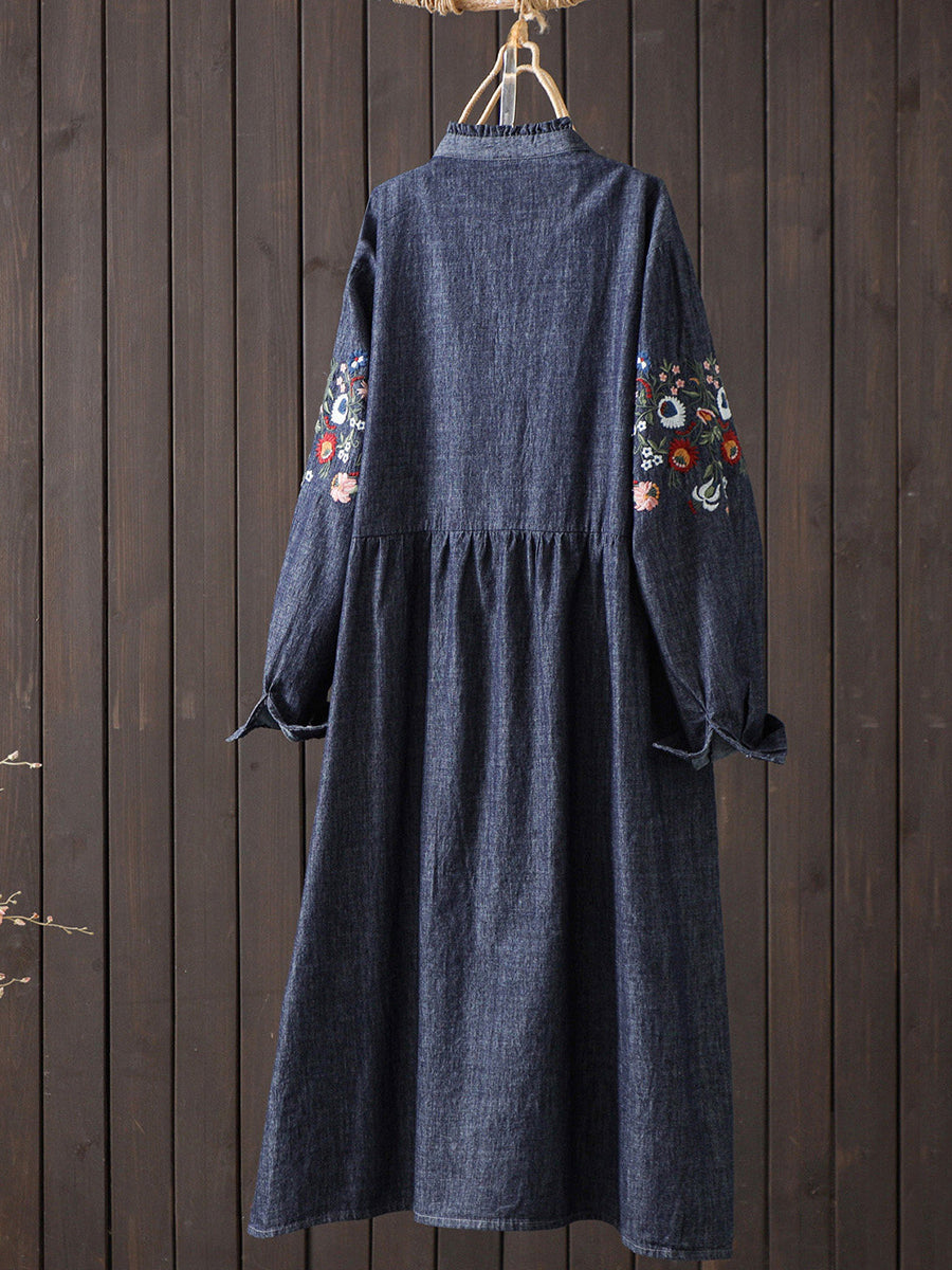 Women Spring Artsy Embroidery Denim Stand Collar Dress