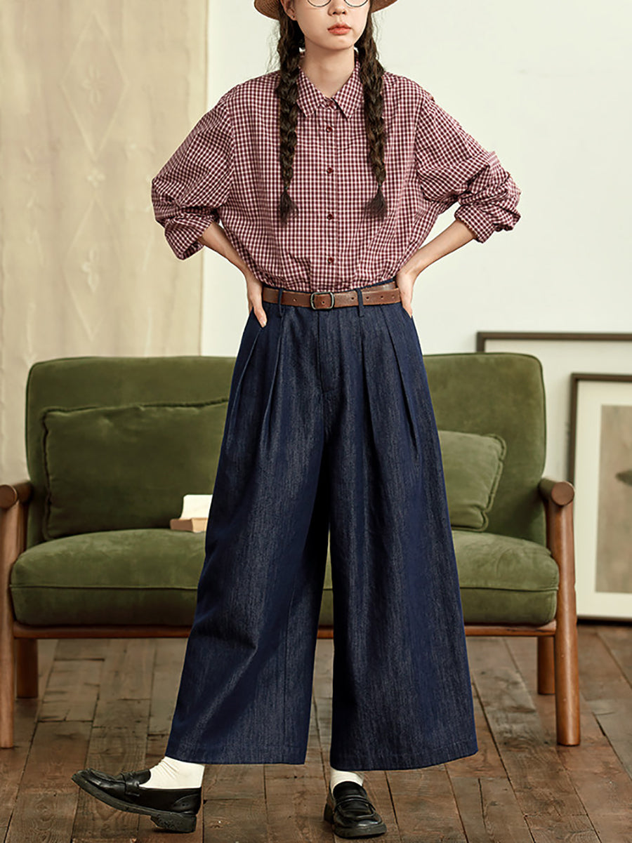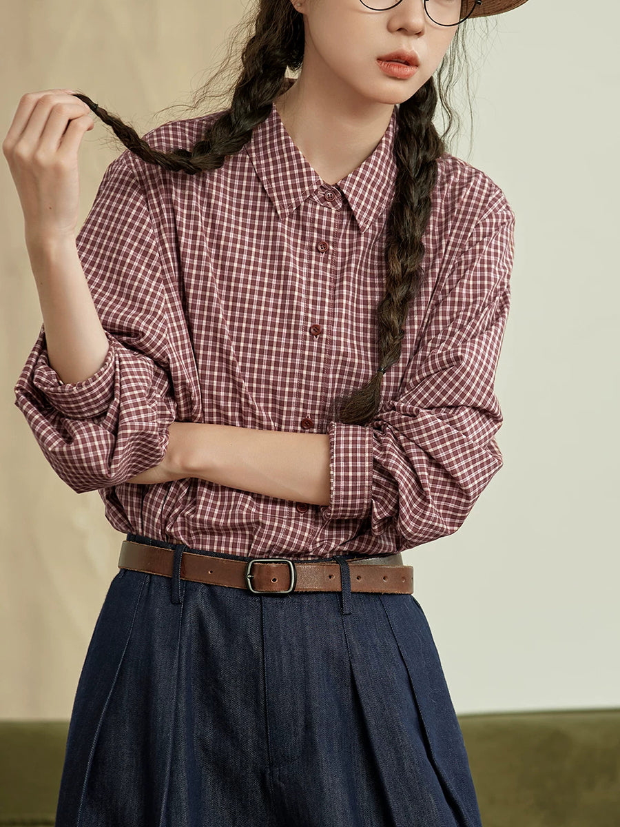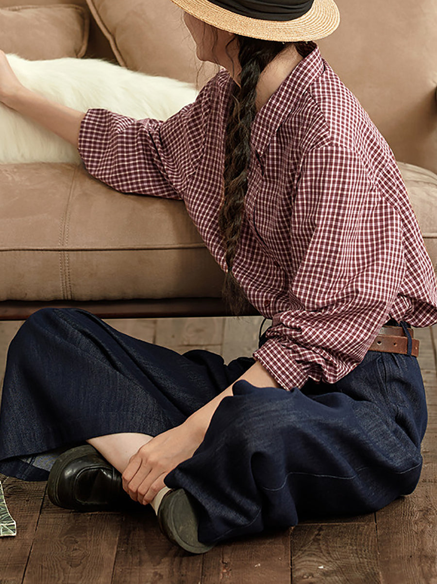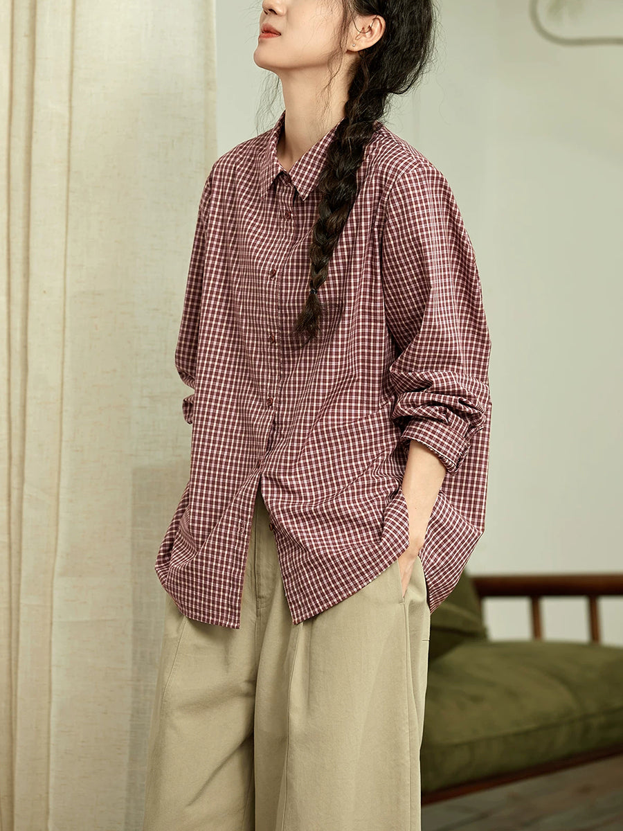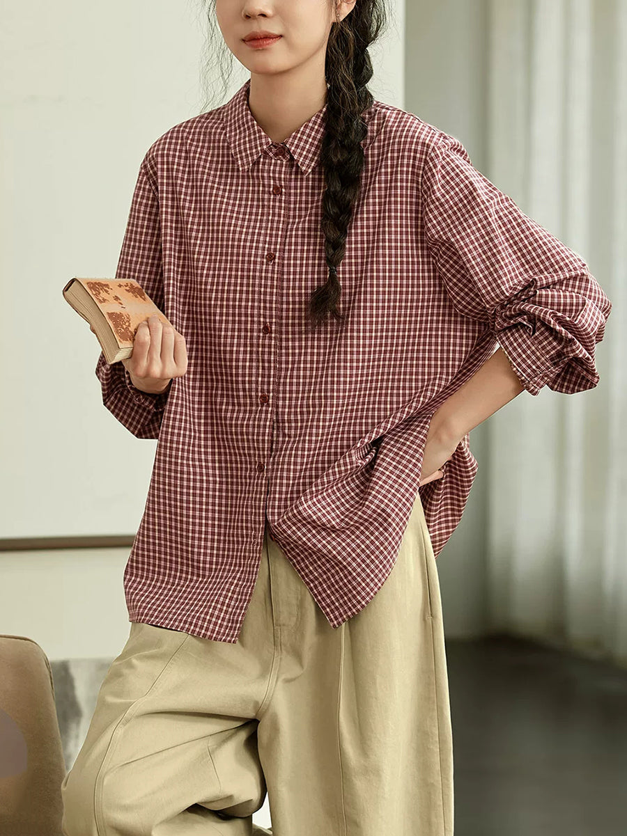 Women Summer Plaid Turn-down Collar 100%Cotton Blouse